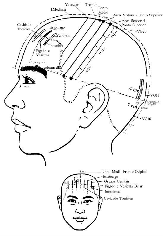 CRANIOPUNTURA A Craniopuntura foi a descoberta de um neurocirurgião chinês, Chiao Shun Fa, médico do Hospital do Povo da comarca de Chi Shan, norte da China. Desiludido com os resultados da Medicina Ocidental no tratamento das sequelas neurológicas, passou a estudar a acupuntura e teve a brilhante hipótese de que o estímulo de pontos do couro cabeludo, que têm maior proximidade com o córtex cerebral do que os pontos sistêmicos, teria efeito mais rápido sobre as doenças cerebrais. Com o apoio dos colegas, passou a realizar pesquisas, até mesmo estimular os pontos da própria cabeça, diante de um espelho. Em março de 1971, conseguiu curar a hemiplegia de um paciente causada por endarterite de vaso cerebral. Ficou muito entusiasmado e continuou intensivamente seu trabalho. Em 1975, após tratar 600 casos, publicou suas descobertas no livro "Scalp - Needling Therapy". De acordo com a doutrina dos meridianos: "Todos os meridianos Iang passam pela cabeça" e os vasos maravilhosos Tou-Mo e Jen-Mo também. Assim, pela cabeça, todo o corpo pode ser controlado. REFERÊNCIAS Linha longitudinal do limite posterior dos cabelos até a borda anterior: 12 cun Linha longitudinal na fronte: 3 cun VG20: 7 cun a partir do limite posterior dos cabelos, entre os ápices das orelhas LOCALIZAÇÃO DAS ÁREAS 1) Linha mediana - liga o ponto entre as sobrancelhas até a protuberância ocipital externa. 2) Linha sobrancelha-ocipital - liga o meio da sobrancelha com a protuberância ocipital externa TÉCNICA Utilizam-se agulhas grossas nº 26-28. Essas agulhas são colocadas obliquamente tomando toda a área de interesse. São estimuladas rodando 200 vezes por minuto. Após 1-2 minutos de manipulação contínua, as agulhas são deixadas em posição por 5-10 minutos. São removidas após duas manipulações. Somente na hipertensão não se realiza a manipulação das agulhas. 10-12 sessões diárias constituem uma série para doenças crônicas. A segunda série é realizada após 3-5 dias de descanso. Seleção dos Pontos - Geralmente contralaterais. Paralisia - O 1/5 superior das região motor para paralisia do membro inferior contralateral. Os 2/5 médio das regiões motoras para paralisia do membro superior contralateral e os 2/5 inferior das regiões motoras para paralisia facial contralateral, afasia motora e disartria. Distúrbios sensoriais - O 1/5 superior das região sensorial é utilizado para alterações sensoriais do membro inferior contralateral, os 2/5 médios da região sensorial para alterações sensoriais do membro superior contralateral e os 2/5 inferiores da região sensorial para alterações sensoriais faciais contralaterais. Hipertensão - Utiliza -se a metade superior da zona vasomotora bilateralmente. Coréia e doença de Parkinson - Escolhem-se as regiões de controle dos tremores correspondentes às áreas afetadas. Se os sintomas são unilaterais, a região contralateral é utilizada. Se os sintomas são bilaterais, estimulam-se bilateralmente. Enurese - áreas bilaterais das regiões sensoriais e motoras correspondentes ao pé. RESULTADOS AVC Isquêmico e Esclerose Múltipla respondem muito bem. AVC Hemorrágico não responde bem. Coréia apresenta melhoras e curas em torno de 50%. Doença de Parkinson responde na maioria dos casos. Hipertensão - 50% responde bem. Enurese - os resultados imediatos são bons. Podem ser tratadas nevralgia do trigêmeo, Tic-Douloureux, radiculite cervical e bursite, síndrome dolorosa pós-laminectomia. OUTRAS LINHAS TREMORES: Coréia e Parkinson Linha paralela 1,5cm à frente da área motora. VASOMOTORA: Edema de origem cortical Linha paralela 1,5cm à frente da linha dos Tremores. ½ superior trata edema de origem cortical do membro superior contralateral. ½ inferior trata edema de origem cortical do membro inferior contralateral. VESTÍBULO-COCLEAR: Zumbidos, vertigem e síndrome de Menière. Segmento de reta horizontal de 4cm, cujo ponto médio está localizado a 1,5cm acima do ápice da orelha. 2ª LINHA DA LINGUAGEM: Afasia Motora Segmento de reta de 3cm, no plano sagital, acompanhando o contorno do crânio, iniciando a 2cm atrás e abaixo da proeminência parietal. 3ª LINHA DA LINGUAGEM: Afasia Sensorial Segmento de reta horizontal, inicia no ponto médio da l inha Vestíbulo-Coclear, e termina 4cm atrás. PSICOMOTORA: Apraxia 3 segmentos de reta, de 3cm cada, iniciando na proeminência parietal; 1 segmento vertical, 1 formando ângulo de 40º para frente, e o outro, 40º para trás. SENSIBILIDADE E MOTRICIDADE DO MEMBRO INFERIOR Trata dor, parestesia e paresia do membro inferior contralateral. Trata também lombalgia aguda, poliúria de origem cortical, enurese e ptose de útero. Segmento de reta paralelo à linha mediana, situado lateralmente a 1cm desta linha, iniciando a partir do ponto médio da linha sagital entre proeminência ocipital e base do nariz, terminando a 3cm posteriormente (1cm posterior à extremidade superior da linha sensorial), cruza as extremidades superiores das linhas motor e sensorial. VISUAL: Perturbações visuais de origem cortical, dores oculares Segmento de reta, iniciando a 1cm lateral à protuberância ocipital, terminando 4cm verticalmente acima. EQUILÍBRIO: Alterações de equilíbrio de origem cerebelar Segmento de reta, iniciando a 3,5cm lateral à protuberância ocipital, terminando 4cm verticalmente abaixo. NASO-BUCO-FARINGEANA: Problemas de nariz, boca e garganta Sobre a linha mediana, 2cm acima e 2cm abaixo da borda anterior dos cabelos. TRANSTORNOS MENTAIS: Transtornos mentais Partindo da protuberância ocipital, terminando 4cm verticalmente para baixo. PSICO-AFETIVA: Transtornos mentais Segmento de reta de 3,5cm, paralelo à linha mediana, situado a 2cm de cada lado da linha mediana, entre a zona Vasomotora e a zona do Tórax.