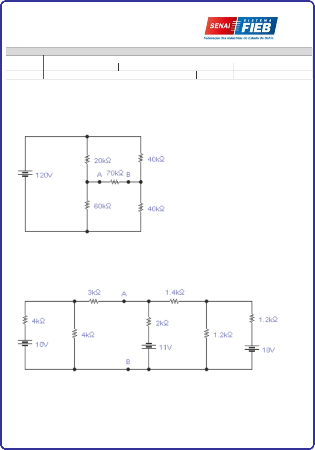 Página 1 de 3 1. IDENTIFICAÇÃO DOS ALUNOS NOME: TURNO: TURMA: DATA: CURSO: Docente: Exercícios Teoremas de Thévenin e Norton 1. Calcule o circuito equivalente ao circuito dado utilizando o teorema de Thévenin. Determine a tensão e a corrente na resistência de carga de 70 kΩ. 2. Calcule o circuito equivalente de Thévenin, (para ambos os lados) relativamente aos pon- tos A e B no circuito dado. No circuito equivalente, determine a corrente que flui entre os pontos A e B. Página 2 de 3 3. Calcule o circuito equivalente ao circuito dado utilizando o teorema de Norton. Determine a tensão e a corrente na resistência de carga de 70 kΩ. 4. Determinar a corrente na resistência RAB = 10 Ω, utilizando o teorema de Thévenin . Página 3 de 3 5. Calcule, utilizando o teorema de Thévenin, o circuito equivalente ao circuito dado visto de RL. Calcule a corrente e a tensão em RL.