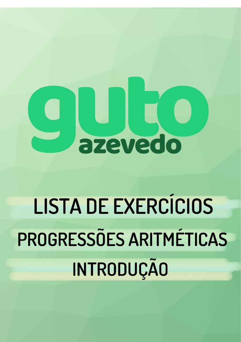 LISTA DE EXERCÍCIOS Progressões Aritméticas | Introdução Clique nos ícones a seguir para acessar meu canal no YouTube, minha página no Instagram, Facebook, Pinterest e também para se inscrever no meu canal no Telegram: QUESTÃO 01 Determine os termos indicados em cada uma das seguintes progressões aritméticas. a) (3, 11, ...); a10 e a19 b) (8, 5, ...); a15 e a31 c) ( 1 4 , 7 8 , … ); a12 d) (50, 48, ...); a100 e) (-1, 4, ...); a30 f) (2, 9, ...); a19 g) (3, 7, ...); a200 h) (7, 6 1 2 , … ); a42 i) (98, 90, ...); a17 j) (3, -6, ...); a12 QUESTÃO 02 Determine o número de termos das seguintes progressões aritméticas finitas: a) (6, 11, 16, ..., 81) b) (62, 59, 56, ..., -1) c) (26, 19, 12, ..., -51) d) ( 1 2 , 2, 7 2 , … , 35) e) (2, 4, 6, ..., 46) f) (50, 47, 44, ..., 14) g) (2,7; 3,2; ...; 17,7) h) (6 1 4 , 7 1 2 , … , 31 1 4 ) i) ( 1 5 , 2 3 , … , 7 1 5 ) j) (−4, 1 6 , … , 41 5 6 ) https://goo.gl/i0yKEf https://instagram.com/auladoguto https://facebook.com/auladoguto http://pinterest.com/auladoguto http://t.me/auladoguto QUESTÃO 03 Determine a razão de cada P.A., onde são dados: a) a1 = 15 e a16 = 60 b) a1 = -3 e a12 = 74 c) a1 = 1,8 e a22 = 27 d) a1 = 1 5 e a21 = 11 5 e) a1 = 12 e a9 = 36 f) a1 = -5 e a11 = 15 g) a1 = 3 e a8 = -46 h) a1 = 1,2 e a58 = 24 i) a1 = 1 3 e a5 = 25 3 j) a1 = − 2 5 e a46 = 2 3 QUESTÃO 04 Determine a1 de cada P.A., onde são dados: a) r = 3 e a15 = 50 b) r = 0,3 e a21 = 39 5 c) r = -2 e a17 = 24 d) r = 8 e a10 = 70 e) r = 7 e a17 = 62 f) r = 0,4 e a12 = 12,6 g) r = -3 e a21 = -44 h) r = 1 2 e a31 = 15 i) r = − 1 6 e a37 = 1 4 j) r = 6 15 e a26 = 32 GABARITO QUESTÃO 01 a) 75 e 147 b) -34 e -82 c) 7 1 8 d) -148 e) 144 f) 128 g) 799 h) − 27 2 i) -30 j) -96 QUESTÃO 02 a) 16 b) 22 c) 12 d) 24 e) 23 f) 13 g) 31 h) 21 i) 16 j) 12 QUESTÃO 03 a) 3 b) 7 c) 1,2 d) -2 e) 3 f) 2 g) -7 h) 0,4 i) 2 j) 16 675 QUESTÃO 04 a) 8 b) 1,8 c) 56 d) -2 e) -50 f) 8,2 g) 16 h) 0 i) 25 4 j) 22