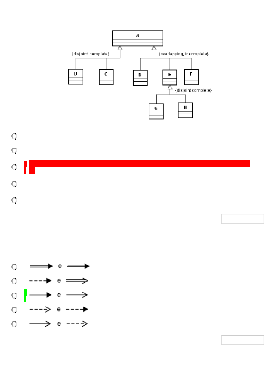 PERGUNTA 1 1. (FGV - 2018 - COMPESA - Analista de Gestão - Analista de Tecnologia da Informação) Considere o diagrama de classes UML apresentado a seguir: Assinale a alternativa que apresenta a afirmativa CORRETA. a. Pode existir uma instância de A que seja instância de B, de G e de H. b. Pode existir uma instância de A que seja instância de B e de C. c. Pode existir uma instância de A que não seja instância nem de B, nem de C. d. Pode existir uma instância de A que seja instância de D e de G. e. Toda instância de A tem que ser instância de, ao menos, um destes três elementos: D, E ou F. 0,2 pontos PERGUNTA 2 1. (VUNESP - 2015 - CRO-SP - Programador) Na UML 2.0, um dos tipos de diagramas utilizados refere-se aos diagramas de sequência, nos quais são representadas mensagens. Os símbolos utilizados para representar mensagens síncronas e assíncronas são, RESPECTIVAMENTE: a. b. c. d. e. 0,2 pontos PERGUNTA 3 1. (FGV - 2018 - AL-RO - Analista Legislativo - Análise e Desenvolvimento de Sistemas, adaptado) Para um dos módulos do Sistema de Consolidação de Prestação de Contas (SisCoPreCo), utilizando a UML, Paola construiu o diagrama de casos de uso a seguir: Com base no diagrama apresentado, Paola especificou que (assinale a alternativa CORRETA) a. O relacionamento entre "Retificar Processo de Prestação de Contas" e "Consultar Processo de Prestação de Contas" representa o reuso de Caso de Uso. b. "Jurisdicionado" representa um comportamento do sistema. c. "Consultar Processo de Prestação de Contas" possui um ponto de extensão para execução de "Retificar Processo de Prestação de Contas". d. "Gestor" é um papel desempenhado por "Jurisdicionado". e. "Retificar Processo de Prestação de Contas" possui um ponto de extensão para execução de "Consultar Processo de Prestação de Contas". 0,2 pontos PERGUNTA 4 1. (CESPE - 2017 - TRE-BA - Analista Judiciário – Análise de Sistemas) Um analista de sistemas deverá apresentar um diagrama de classes de domínio de uma aplicação. Uma das necessidades a ser atendida é o módulo de abertura de processos judiciais, que são abertos para acionar judicialmente uma ou mais pessoas e podem ser iniciados por uma ou mais pessoas interessadas. Os dados completos de todas as pessoas envolvidas precisam ficar registrados, bem como a forma de participação (interessado ou acionado). Considerando essa situação hipotética, assinale a alternativa que apresenta o diagrama mais adequado ao atendimento dessas necessidades. a. b. c. d. e. PERGUNTA 1 1. (UFPR - 2018 - COREN-PR - Analista de Tecnologia da Informação) Considere o diagrama a seguir: A partir do diagrama, é INCORRETO afirmar: a. epsilon() é um método de a. b. a é uma instância de Lambda. c. as linhas tracejadas nesse diagrama representam mensagens de retorno. d. trata-se de um diagrama de sequência. e. zeta() não necessita ser chamado para que epsilon() dê um retorno ao usuário. 0,2 pontos PERGUNTA 2 1. (FCC - 2018 - Prefeitura de São Luís - MA - Auditor Fiscal de Tributos I - Tecnologia da Informação, adaptado) Considere o caso de uso a seguir: Assinale a alternativa que completa CORRETAMENTE a seguinte frase, Se em I for colocada a palavra: a. extend, o registro não será obrigatório ao se fazer login. b. extend, o cidadão terá que se registrar toda vez que fizer login. c. include, subentende-se que o cidadão já está registrado ao se fazer o login. d. include, o cidadão não precisará se registrar ao fazer login. e. union, os dois casos de uso serão entendidos como um único caso de uso. 0,2 pontos PERGUNTA 3 1. (CESGRANRIO - 2018 - LIQUIGÁS - Profissional Júnior - Analista de Sistemas) Considere o seguinte diagrama de classes UML: Qual diagrama de sequência UML é semanticamente compatível com o diagrama de classes acima? a. b. c. d. e. 0,2 pontos PERGUNTA 4 1. (FAURGS - 2014 - TJ-RS - Analista de Sistema) Considere as informações a seguir sobre diagramas UML. I - O diagrama de classes modela classes, incluindo seus atributos, operações, relações e associações com outras classes. II - O diagrama de classes fornece uma visão estática ou estrutural de um sistema, contudo não mostra a natureza dinâmica das comunicações entre os objetos das classes no diagrama. III - O diagrama de sequência é utilizado para indicar as comunicações dinâmicas entre objetos, durante a execução de uma tarefa, contudo não mostra a ordem temporal na qual as mensagens são enviadas entre os objetos para executar aquela tarefa. Qual(quais) afirmação(afirmações) está(estão) CORRETA(S)? a. Apenas as afirmações II e III estão corretas. b. As afirmações I, II e III estão corretas. c. Apenas a afirmação I está correta. d. Apenas as afirmações I e III estão corretas. e. Apenas as afirmações I e II estão corretas.