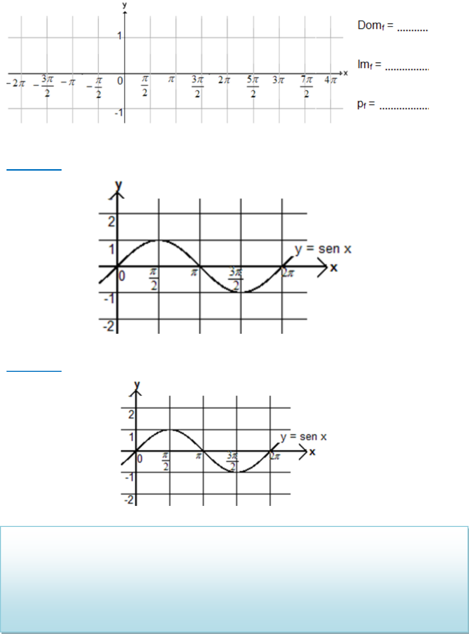 ➢ A função seno e a família 𝒚 = 𝑨 𝒔𝒆𝒏 (𝑩𝒙) Vamos inicialmente esboçar o gráfico da função f(x) = sen x. Exemplo 1.Considere a função y = 𝑠𝑒𝑛 𝑥 e esboce 𝑦 = 2 𝑠𝑒𝑛 𝑥. Exemplo 2.Considere a função y = sen x e esboce𝑦 = 𝑠𝑒𝑛 (2 𝑥). Conclusões sobre o gráfico de y = A.sen (Bx), sendo A e B números positivos. • o valor de A altera a .............................., que fica ................................... por A. • o valor de B altera o ..............................., que fica .................................... por B. ➢ A função cosseno e a família 𝒚 = 𝑨 𝒄𝒐𝒔 (𝑩𝒙) Vamos esboçar o gráfico da função real de variável real f(x) = cos x. Importante: assim como na função seno, os parâmetros A e B irão alterar a amplitude e o período, respectivamente. Exemplo 3.Determine a amplitude e o período: a) f(x) = 5.sen (3x) b) f(x) = sen (x/2) c) f(x) = - 2.cos (x) Observação: mais tarde trabalharemos com outras funções trigonométricas, abaixo definidas. 𝒕𝒈 𝒙 = 𝒔𝒆𝒏 𝒙 𝐜𝐨𝐬 𝒙 𝒄𝒐𝒔𝒔𝒆𝒄 𝒙 = 𝟏 𝐬𝐞𝐧 𝒙 𝒔𝒆𝒄 𝒙 = 𝟏 𝐜𝐨𝐬 𝒙 𝒄𝒐𝒕𝒈 𝒙 = 𝟏 𝐭𝐠 𝒙 ATIVIDADES 1) Associe corretamente as funções com os gráficos correspondentes. a) y = 3.sen x b) y = cos (3x) c) y = sen (x/3) d) y = 3.sen (3x) e) y = 3.cos x f) y = 3.cos (3x) (I) (II) (III) (IV) (V) (VI) 2) (Fuvest) A figura a seguir mostra parte do gráfico da função: 3) (UFRGS) A função que melhor se adapta ao gráfico abaixo é: 4) (UCS) A função que melhor se adapta ao gráfico abaixo é: 5) (Mack) O gráfico a seguir é de uma função do tipo f(x) = a.sen (b.x). Os números a e b são, respectivamente: a) 1 e 2 b) 1 e –1 c) 2 e –1 d) –1 e –2 e) –1 e 2 Respostas das atividades 1) a) III; b) I; c) IV; d) II; e) VI; f) V 2) B 3) A 4) E 5) E
