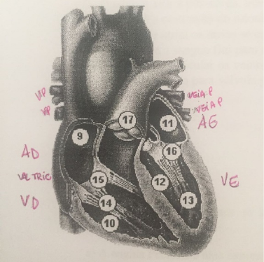CARDIO Em relação a figura ao lado, o numero 9, 17, 15 e 12, representam? a) Átrio esquerdo, aorta, válvula tricúspide e ventrículo direito b) Átrio direito, artéria pulmonar, válvula tricúspide e ventrículo esquerdo c) Átrio direito, aorta, válvula mitral e ventrículo esquerdo d) Átrio esquerdo, artéria pulmonar, válvula mitral e ventrículo direito e) Átrio direito, artéria pulmonar válvula mitral e ventrículo esquerdo V ou F ( ) Os músculos papilares são músculos que, relaxados, deixam frouxas as cordas tendíneas que abrem as valvas e, contraídos, retesam as cordas tendíneas que fecham essas valvas. ( ) Artéria pulmonar carrega sangue oxigenado até os pulmões ( ) O lado esquerdo do coração recebe sangue rico em oxigênio dos pumoes e o bombeia pelas 4 veias para as varias partes do corpo ( ) O átrio direito recebe sangue venoso da cabeça e das extremidades superiores (veia cava superior), do tronco e extremidades inferiores (veia cava inferior) e do seio coronário (miocárdio) ( ) O coração é fartamente irrigado com sangue arterial por meio de uma rede de circulação própria, que é a circulação arterial colateral. a) V, F, F, V, F b) V, V, V, F, V c) F, F, F, V, V d) V, V, F, V, V e) V, F, V, F, F Em relação ao sistema de condução elétrica do miocárdio, assinale a correta: a) O Nódulo Sinoatrial localiza-se no assoalho do átrio direito b) O Nódulo Atrioventricular conduz o impulso até o septo interventricular c) O Feixe de His contribui para o enchimento ventricular pelo retardo do potencial de ação d) As fibras de Purkinje são especializadas em contração lenta e) O impulso cardíaco transita do nódulo AV pelo feixe de HISS, que divide-se no ramo direito e esquerdo Assinale a correta: I. Quanto maior a pré-carga, maior será o débito cardíaco e a fração de ejeção II. Quanto maior a pós-carga, maior será o débito cardíaco III. Sístole é a contração do miocárdio e diástole é relaxamento do miocárdio IV. Na sístole atrial os átrios se contraem, ventrículos relaxados, válvulas átrio ventriculares estão abertas e o sangue flui para os ventrículos V. Na sístole ventricular os ventrículos se contraem, válvulas átrio ventriculares se abrem e sangue é empurrado para a válvula pulmonar ou aórtica chegando até os pulmões ou periferia. a) I, III, IV b) I, II, III, V c) II, IV, V d) I, II, IV, V e) I, III, V A cardiopatia isquêmica se apresenta clinicamente de varias maneiras, assinale a INCORRETA: a) A angina Pectoris é uma expressão clinica clássica da isquemia miocárdica. Pode evoluir até causar um infarto agudo do miocárdio ou morte súbita. b) A angina estável pode ser precipitada por esforço, estresse, emoções, refeições pesadas, costuma durar até 20 minutos e alivia com repouso e/ou nitroglicerina. c) A angina Prinzmetal (variante) é um tipo raro de dor cardíaca resultante de isquemia do miocárdio que ocorre quase sempre em repouso, resultando de aumentos transitórios do tônus vasomotor. d) A angina instável resulta na completa interrupção do fornecimento de sangue para uma área do miocárdio, sendo provocada por um trombo oclusivo coronário no local de uma placa de aterosclerótica. e) No infarto agudo do miocárdio as células morrem e os tecidos tornam-se necrosados, ficando a região incapaz de contrair e relaxar como um tecido saudável. Sobre a apresentação clinica do infarto agudo do miocárdio, assinale a correta: a) Sensação repentina ou inicio de um desconforto torácico como “dor esmagadora ou pressão no peito” que nunca se irradia b) Pode estar associada a palidez, sudorese e respiração curta c) Alivia rapidamente com repouso e medicação d) Apresenta hipertensão, tontura e náuseas e) Nunca cursa com estado febril Sobre a insuficiência cardíaca, assinale a correta: a) Na insuficiência sistólica ocorre uma deficiência na contratilidade miocárdica, diminuição do volume de ejeção e elevação da pressão diastólica de VE. É a mais rara das insuficiências. b) Na insuficiência diastólica, ocorre uma deficiência no relaxamento ventricular e no seu enchimento, devido a rigidez dos ventrículos. c) A insuficiência cardíaca à direita é a mais comum, ocorrendo diminuição do debito cardíaco, dispneia aos esforços, ortopneia, estertoração pulmonar, congestão pulmonar e derrame pleural. d) Na insuficiência cardíaca à esquerda ocorre congestão sistêmica, cansaço aos esforços, turgência jugular, ascite e edema nos MMII. e) A insuficiência cardíaca diastólica é responsável por 70% dos casos. Em relação aos sinais e sintomas da insuficiência cardíaca, assinale a INCORRETA: a) Os pacientes apresentam débito cardíaco insuficiente e diminuição na capacidade de se exercitar b) Quando o problema é no ventrículo direito, o aumento nesta pressão é transmitido ao átrio direito que por sua vez aumenta a pressão na circulação venocapilar pulmonar. c) Quando o problema é no ventrículo direito, o aumento da pressão é transmitido do AD que por sua vez aumenta a pressão na veia cava e circulação venocapilar sistêmica. d) Na insuficiência do ventrículo direito, ocorre estase jugular, edema MMII, hepatomegalia. e) Na insuficiência do ventrículo esquerdo, ocorre congestão pulmonar. Em relação as valvulopatias relacione as colunas: 2- insuficiência tricúspide 3-Estenose pulmonar 1-insuficiencia mitral 4- estenose aórtica ( ) Forma mais comum de obstrução do VD isolada, tendo como causa principal a fusão das cúspides valvares durante o desenvolvimento intrauterino. ( ) Assintomático por longos anos e tem a angina pectoris como primeiro e principal sintoma. ( ) Regurgitação de sangue do VE para o AE, principalmente devido as alterações em 1 ou mais componentes: cúspides, cordas tendíneas, anel valvar ou músculos papilates, levando a congestão pulmonar e dispneia. ( ) Abertura incompleta da válvula, 