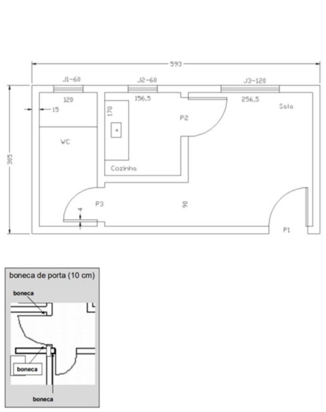 PERGUNTA 1 1. Ao longo da Unidade verificamos os conceitos de representação gráfica para projetos na engenharia, analisando a importância da boa apresentação e da escala utilizada. Considerando essas informações e os conteúdos estudados, desenhe a planta baixa, a seguir, convertendo e calculando as escalas 1:25, 1:50 e 1:100, em papel sulfite (tamanho A4). Importante: a planta baixa está em cm. Portas de 80 cm e bonecas das portas de 10 cm.