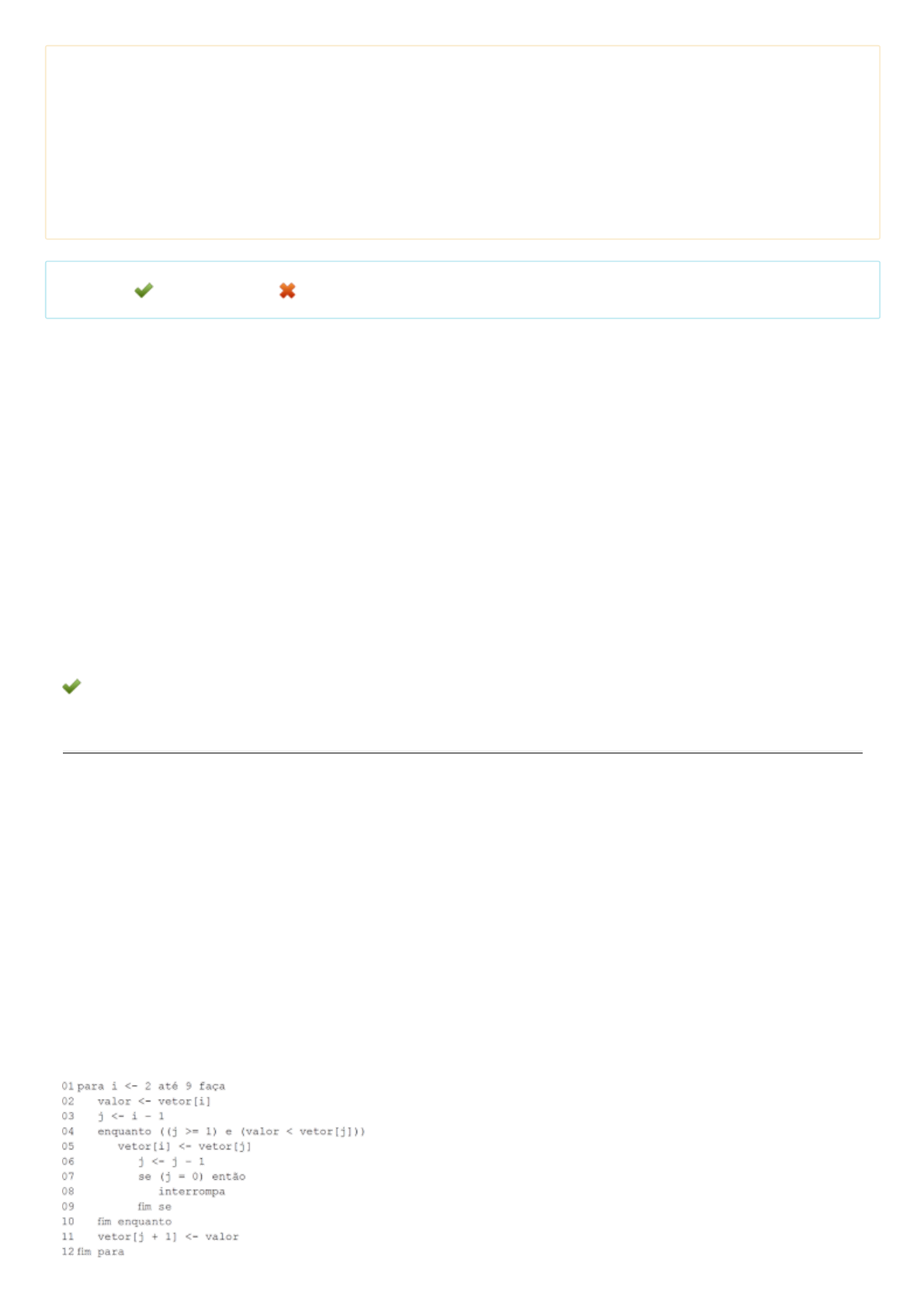 I- A linha 04 deve ser corrigida da seguinte forma: enquanto ( ( j >= 1 ) ou ( valor < vetor [ j ] ) )