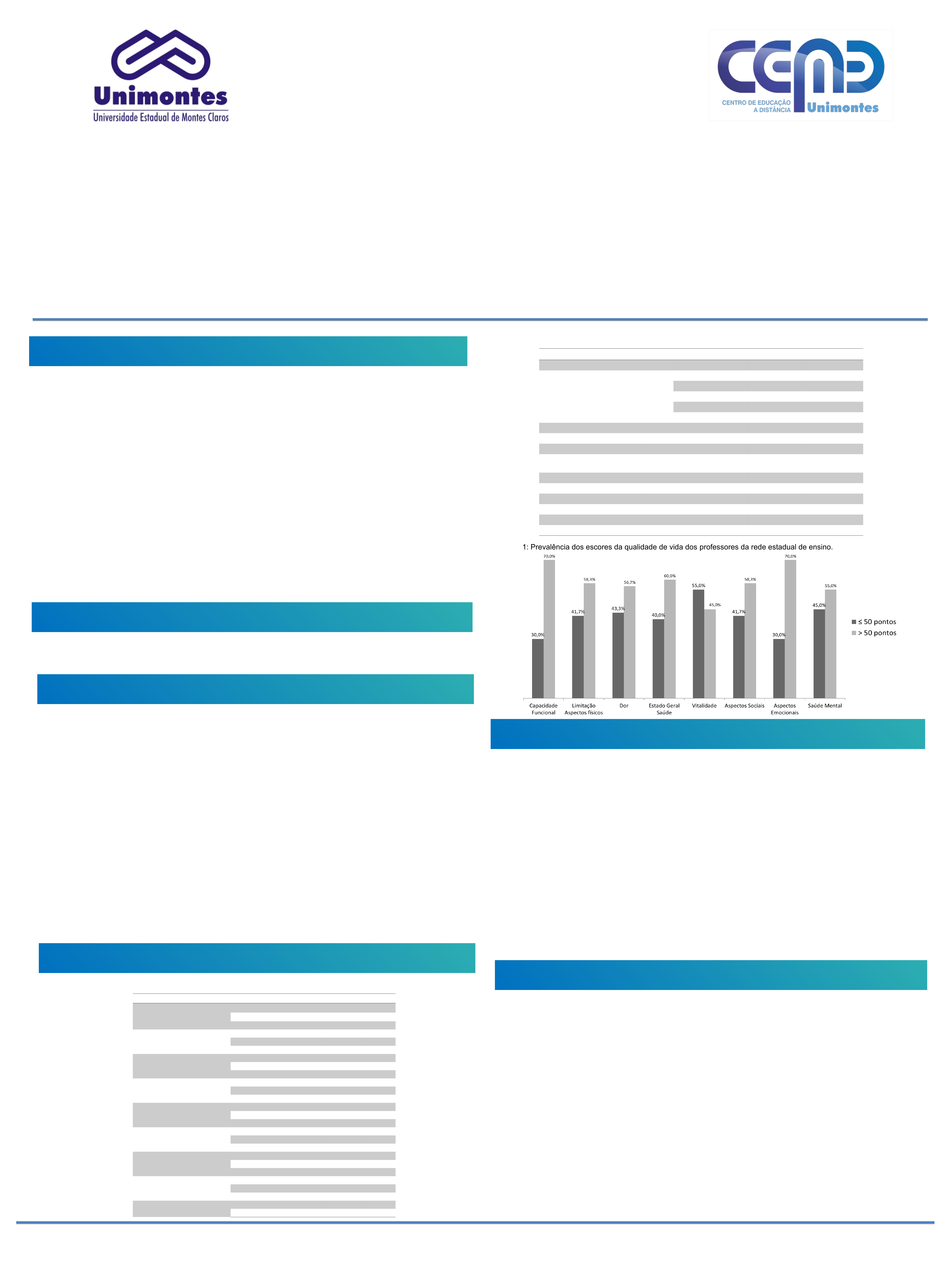 QUALIDADE DE VIDA DOS PROFESSORES DA REDE ESTADUAL DE ENSINO INTRODUÇÃO OBJETIVO REFERÊNCIAS CONCLUSÃO Segundo Sant’Anna, Costa e Moraes (2000), a remuneração dos educadores é proporcional ao número de aulas do cargo. Em razão disso, cada vez mais professores estão assumindo maior quantidade de turmas com a finalidade de melhorarem a qualidade de vida. Essa situação provoca nos docentes desgastes físicos e mentais, pelo grande volume de atividades extraclasse, o que pode contribuir negativamente para a sua qualidade de vida, precisando assim haver um equilíbrio (PEREIRA; TEIXEIRA; LOPES, 2013). Uma boa qualidade de vida contribui para a boa atuação do profissional em sua profissão. Torna-se de fundamental importância que sejam pesquisados os fatores influenciadores da qualidade de vida do educador para, assim, promover boa saúde, pois a qualidade de vida influencia diretamente na produtividade das pessoas, e consequentemente nos resultados obtidos dentro da sala de aula. De forma geral, foi observado que todos os domínios investigados pelo SF-36 com os professores do ensino público estadual do município de Pompéu-MG encontram-se bons, destacando-se a vitalidade, que apresentou menor escore. Neste sentido, levando em consideração a importância da qualidade de vida do docente na qualidade do trabalho, este estudo chama a atenção para a necessidade da realização de intervenções com tal população, criando espaços de apoio aos docentes, onde possam expor suas ansiedades e dúvidas. Assim, tendo o ambiente escolar como um local de promoção social e de saúde, é importante levar em consideração à saúde do corpo docente, devendo evoluir para a operacionalização de programas que possibilitem o aumento da qualidade de vida dos professores. - Avaliar a qualidade de vida de professores da rede pública estadual de ensino de Pompéu/MG. CICONELLI, R. M. Tradução para o português e validação do questionário genérico de avaliação de qualidade de vida “Medical outcomes study 36-item short-form health survey (SF-36)”. Tese (Doutorado em Ciências da Saúde Aplicadas à Reumatologia). Universidade Federal de São Paulo, Escola Paulista de Medicina; 1997. PEREIRA, É. F.; TEIXEIRA, C. S.; LOPES, A. S. Qualidade de vida de professores de educação básica do município de Florianópolis, SC, Brasil. Ciência & Saúde Coletiva. v. 18, n. 7, p. 1963-1970, 2013. SANT’ANNA, A. S.; COSTA, R.; MORAES, L. F. R. Qualidade de Vida no Trabalho: uma análise em unidades de ensino básico. In: Anais XXIV. ENCONTRO NACIONAL DA ASSOCIAÇÃO DE PÓS-GRADUAÇÃO EM ADMINISTRAÇÃO. Campinas, SP: ANPAD, 2000. Figura 1: Prevalência dos escores da qualidade de vida dos professores da rede estadual de ensino. 1-Acadêmico do Curso de Licenciatura em Educação Física do Centro de Educação a Distância da Universidade Estadual de Montes Claros – CEAD/UNIMONTES. 2-Mestre em Saúde, Sociedade e Ambiente pela Universidade Federal dos Vales do Jequitinhonha e Mucuri – UFVJM. Orientador do Curso de Licenciatura em Educação Física do Centro de Educação a Distância da Universidade Estadual de Montes Claros – CEAD/UNIMONTES. Rodrigo da Silva e Campos1; Ronilson Ferreira Freitas2 MATERIAIS E MÉTODOS Trata-se de um estudo epidemiológico do tipo analítico, transversal e quantitativo, realizado na cidade de Pompéu/MG, Brasil, no período de 2016 a 2017. A população alvo foi composta por 60 professores da rede estadual de ensino. Os dados foram coletados a partir de um questionário que abordava aspectos sócio demográficos, econômicos, comportamentais e qualidade de vida. Para a avaliação da qualidade de vida, foi utilizado o instrumento do tipo genérico SF- 36 Medical Outcomes Study 36 – Item Short - Form Health Survey, traduzido e validado no Brasil (CICONELLI, 1997). Os professores participantes do estudo que concordam participar da presente pesquisa de forma voluntária assinaram o Termo de Participação Livre e Consentida, contendo o objetivo do estudo, procedimento de avaliação, caráter de voluntariedade da sua participação e isenção de responsabilidade por parte do avaliador. 1º Simpósio de TCC EAD Tabela 2: Perfil do auto relato e dos domínios de qualidade de vida dos professores da rede estadual de ensino. RESULTADOS E DISCUSSÃO Tabela 1: Caracterização da amostra, segundo os fatores sócio demográficos e comportamentais dos professores da rede estadual de ensino. n % Avaliação do indivíduo Comparado a um ano atrás, como você classificaria sua idade em Geral? Muito melhor 4 6,7 Um pouco melhor 15 25,0 Quase a mesma 24 40,0 Um pouco pior 16 26,7 Muito pior 1 1,7 Domínios da Qualidade de Vida Média dp Capacidade funcional 67,50 24,12 Limitação por aspectos físicos 67,08 38,64 Dor 55,88 30,91 Estado Geral de Saúde 52,90 14,33 Vitalidade 48,33 18,33 Aspectos Sociais 65,60 25,05 Aspectos Emocionais 72,67 38,14 Saúde Mental 53,27 16,49 Fatores sociodemográfico, econômicos e comportamentais n % Gênero Masculino 9 15,0 Feminino 51 85,0 Situação Conjugal Com companheiro fixo 40 66,7 Sem companheiro fixo 20 33,3 Cor da Pele Branca 34 56,7 Outra cor 26 43,3 Anos de Estudo Até 9 anos 10 16,7 9 ou mais anos 50 83,3 Religião Católica 36 60,0 Outra religião 24 40,0 Carga Horária Semanal Até 30 horas 33 55,0 Mais de 30 horas 27 45,0 Renda Até 2 salários mínimos 22 36,7 Três ou mais salários 38 63,3 Fuma Não 51 85,0 Sim 9 15,0 Etilismo Não 35 58,3 Sim 25 41,7 Gráf1 Capacidade Funcional Capacidade Funcional Limitação Aspectos físicos Limitação Aspectos físicos Dor Dor Estado Geral Saúde Estado Geral Saúde Vitalidade Vitalidade Aspectos Sociais Aspectos Sociais Aspectos Emocionais Aspectos Emocionais Saúde Mental Saúde Mental ≤ 50 pontos > 50 pontos 30,0% 41,7% 43,3% 40,0% 55,0% 41,7% 30,0% 45,0% 70,0% 58,3% 56,7% 60,0% 45,0% 58,3% 70,0% 55,0% 30 70 41.7 58.3 43.3 56.7 40 60 55 45 41.7 58.3 30 70 45 55 