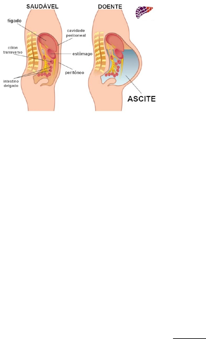 ASCITE É o acumulo de líquido dentro da cavidade peritoneal, geralmente relacionado a alguma doença hepática. Causas: · Insuficiência cardíaca; · Alguns tipos de câncer; · Insuficiência renal · Hepatite alcoólica; · Hepatite crônica; · Cirrose hepática; · Pancreatite; Fatores contribuintes: · Hipertensão portal - aumento anormal da pressão sanguínea na veia porta; · Obstrução do fluxo sanguíneo venoso através do fígado comprometido; · Aumento da retenção de sódio e água pelo rim, elevando o volume intravascular; · Diminuição da síntese de albumina pelo fígado comprometido; · Líquido é movimentado do sistema vascular para o espaço peritoneal; · Falha hepática em metabolizar aldosterona; Manifestações clínicas: · Perímetro abdominal aumentado, devido retenção de líquidos gerando ganho de peso rápido; · Dispneia leve - por causa da pressão que o líquido exerce sobre o diafragma. · Estrias e veias distendidas na parede abdominal (circulação colateral); · Desequilíbrio hidroeletrolítico; · Perda de apetite, náuseas, vômitos; Tratamento: · Dieta hipossódica objetivando diminuir a retenção de líquidos; · Diuréticos (uso criterioso); · Repouso no leito: melhor filtração glomerular para maior excreção se sódio; · Paracentese: procedimento médico invasivo para retirada de líquido da cavidade peritoneal através de uma pequena incisão cirúrgica ou punção abdominal em condições estereis. O líquido drenado deve ser enviado para análise. Sinal de piparote: · sinal indicativo de ascite; · A percussão deve ser feita em região de flanco para observar a propagação da coluna de líquido para o lado oposto; · Piparote positivo ocorre quando fazemos uma percussão no abdome do paciente e notamos a propagação de uma onda do líquido ali acumulado.