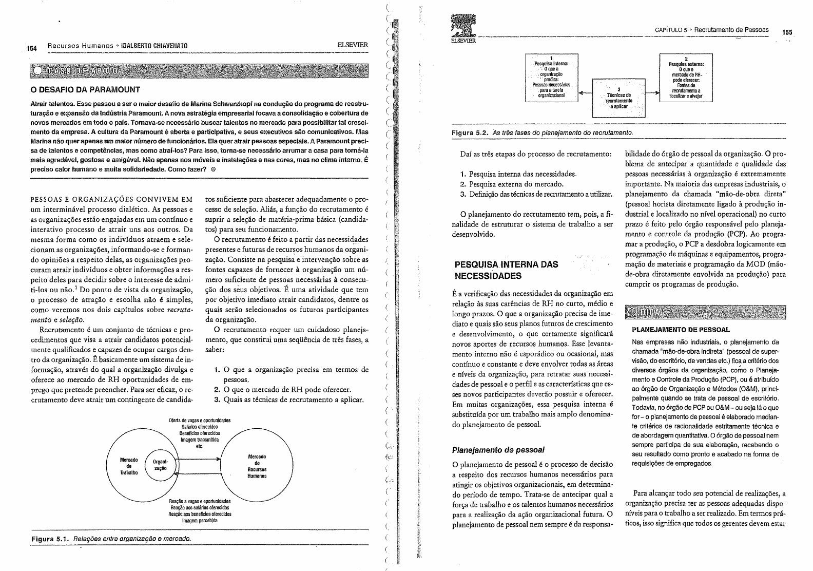 154 Recursos Humanos • I0ALBEBTO CHIAVENATO ELSEVIER O DESAFIO DA PARAMOUNT Atrair talentos. Esse passou a ser o maior desafio de Marina Schwarzkopí na condução do programa de reestru turação e expansão da indústria Paramount A nova estratégia empresarial focava a consolidação e cobertura de novos mercados em todo o país. Tornava- se necessário buscar taientos no mercado para possibilitar tal cresci mento da empresa. A cufíura da Paramount é aberta e participativa, e seus executivos são comunicativos* Mas Wiarina não quer apenas um maior número de funcionários. Ela quer atrair pessoas especiais, A Paramount preci sa de talentos e competências, mas como atraí-los? Para isso, torna-se necessário arrumar a casa para torná-la mais agradável, gostosa e amigável. Mão apenas nos móveis e instalações e nas cores, mas no clima interno, É preciso calor humano e muita solidariedade. Como fazer? © PESSOAS E ORGANIZAÇÕES CONVIVEM EM um interminável processo dialético. As pessoas e as organizações estão engajadas em um contínuo e interativo processo de atrair uns aos outros. Da mesma forma como os indivíduos atraem e sele cionam as organizações, informando-se e forman do opiniões a respeito delas, as organizações pro curam atrair indivíduos e obter informações a res peito deles para decidir sobre o interesse de admi- ti-los ou não.1 Do ponto de vista da organização, o processo de atração e escolha não é simples, como veremos nos dois capítulos sobre recruta m ento e seleção. Recrutamento é um conjunto de técnicas e pro cedimentos que visa a atrair candidatos potencial mente qualificados e capazes de ocupar cargos den tro da organização. É basicamente um sistema de in formação, através do qual a organização divulga e oferece ao mercado de RH oportunidades de em prego que pretende preencher. Para ser eficaz, o re crutamento deve atrair um contingente de candida tos suficiente para abastecer adequadamente o pro cesso de seleção. Aliás, a função do recrutamento é suprir a seleção de matéria-prima básica (candida tos) para seu funcionamento. O recrutamento é feito a partir das necessidades presentes e futuras de recursos humanos da organi zação. Consiste na pesquisa e intervenção sobre as fontes capazes de fornecer à organização um nú mero suficiente de pessoas necessárias à consecu ção dos seus objetivos. É uma atividade que tem por objetivo imediato atrair candidatos, dentre os quais serão selecionados os futuros participantes da organização. O recrutamento requer um cuidadoso planeja mento, que constitui uma seqüência de três fases, a saber: 1. O que a organização precisa em termos de pessoas, 2. O que o mercado de RH pode oferecer. 3. Quais as técnicas de recrutamento a aplicar. Oferta de vagas e oportunidades Reação aos benefícios oferecidos imagem percebida Figura 5.1. Relações entre organização e mercado. ELSEVIER CAPÍTULO 5 * Recrutamento de P essoas 155 Figura 5,2 . Ás três fases do planejamento do recrutamento, Daí as três etapas do processo de recrutamento: 1. Pesquisa interna das necessidades. 2. Pesquisa externa do mercado. 3. Definição das técnicas de recrutamento a utilizar. O planejamento do recrutamento tem, pois, a fi nalidade de estruturar o sistema de trabalho a ser desenvolvido. PESQUISA INTERNA DAS NECESSIDADES É a verificação das necessidades da organização em relação às suas carências de RH no curto, médio e longo prazos. O que a organização precisa de ime diato e quais são seus planos futuros de crescimento e desenvolvimento, o que certamente significará novos aportes de recursos humanos. Esse levanta mento interno não é esporádico ou ocasional, mas contínuo e constante e deve envolver todas as áreas e níveis da organização, para retratar suas necessi dades de pessoal e o perfil e as características que es ses novos participantes deverão possuir e oferecer. Em muitas organizações, essa pesquisa interna é substituída por um trabalho mais amplo denomina do planejamento de pessoal Planejamento de pessoal O planejamento de pessoal é o processo de decisão a respeito dos recursos humanos necessários para atingir os objetivos organizacionais, em determina do período de tempo. Trata-se de antecipar qual a força de trabalho e os talentos humanos necessários para a realização da ação organizacional futura, O planejamento de pessoal nem sempre é da responsa bilidade do órgão de pessoal da organização. O pro blema de antecipar a quantidade e qualidade das pessoas necessárias à organização é extremamente importante. Na maioria das empresas industriais, o planejamento da chamada "mão-de-obra direta” (pessoal horista diretamente ligado à produção in dustrial e localizado no nível operacional) no curto prazo é feito pelo órgão responsável pelo planeja- mento e controle da produção (PCP), Ao progra mar a produção, o PCP a desdobra logicamente em programação de máquinas e equipamentos, progra mação de materiais e programação da MOD (mão- de-obra diretamente envolvida na produção) para cumprir os programas de produção. £»LAWEJAMENTO DE PESSOAL Nas empresas não industriais, o planejamento da chamada "mão-de-obra indireta" (pessoa! de super visão, do escritório, de vendas etc.) fica a critério dos diversos órgãos da organização, como o Planeja mento e Controle da Produção (PCP), ou é atribuído ao órgão de Organização e Métodos (O&M), princi palmente quando se trata de pessoal de escritório, Todavia, no órgão de PCP ou O&M - ou seja lá o que for - o planejamento de pessoal é elaborado median te critérios de racionalidade estritamente técnica e de abordagem quantitativa. O órgão de pessoal nem sempre participa de sua elaboração, recebendo o seu resultado como pronto e acabado na forma de requisições de empregados, Para alcançar todo seu potencial de realizações, a organização pr