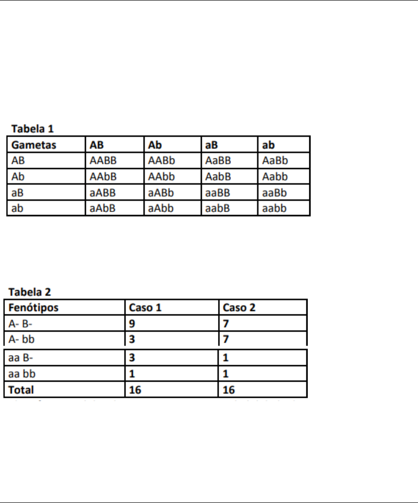 ALUNA: MARCIELA DE FREITAS MARTINHO, 181800158. EXERCÍCIO DE GENÉTICA 3 (27/04/20) EXERCÍCIO 1 OBS: TUDO EM VERMELHO SÃO AS ``CORRETAS´´ Um grupo de pesquisadores de um centro de pesquisa estavam estudando a genética de uma espécie de moscas, considerando apenas dois locos, cada um com dois genes alelos: loco 1 - gene A (dominante) ou gene a (recessivo); loco 2 - gene B (dominante) ou gene b (recessivo). Cruzando indivíduos AABB com indivíduos aabb, foram obtidos 100% de indivíduos AaBb que, quando cruzados entre si, podem formar indivíduos com os genótipos mostrados na Tabela 1 a seguir. Sem interação entre os dois locos, as proporções fenotípicas dependem de os referidos locos estarem ou não no mesmo cromossomo. Na Tabela 2, a seguir, estão representadas duas proporções fenotípicas (casos 1 e 2) que poderiam resultar do cruzamento de dois indivíduos AaBb. Identifique qual dos dois casos tem maior probabilidade de representar dois locos no mesmo cromossomo. Justifique sua resposta. O caso 2, que ocorre quando os dois locos estão no mesmo cromossomo, com permuta gênica entre eles. A proporção fenotípica 9:3:3:1 (caso 1) só ocorre quando os dois locos estão em cromossomos diferentes. EXERCÍCIO 2 Foi publicado na revista Nature (agosto de 2005) uma carta em que os autores sugeriram que as histórias do jovem “bruxo” Harry Potter, escritas por J. K. Rowling, poderiam ser úteis no ensino da hereditariedade. Nessas histórias, os indivíduos podem ser “bruxos” ou “trouxas”. I. Harry Potter é filho único de um casal de “bruxos”. II. O amigo de Potter, Ron Weasley, é “bruxo” e tem pai e mãe “bruxos”. II. Os irmãos de Ron, Fred e George, e sua irmã Gina também são “bruxos”. III. A jovem “bruxa” Hermione nasceu do casamento entre uma “trouxa” e um “trouxa”. IV. O “bruxo” Draco Malfoy, inimigo de Potter, tem pai e mãe “bruxos”. Com base nessas informações, responda: a) Supondo que ser “bruxo” ou “trouxa” é um caráter hereditário monogênico, qual(quais) das famílias permite(m) concluir que o gene que determina tal característica não se localiza no cromossomo X? Justifique. A família da “bruxa” Hermione que permite concluir que essa característica não se localiza no cromossomo X, pois com os dados do enunciado deduz-se que ser bruxo ou bruxa é uma característica recessiva e autossômica. Caso fosse ligada ao X, o pai de Hermione teria genótipo XBY e sua mãe genótipo XBXb, impossibilitando esse casal de ter filhas bruxas como o ocorrido, portanto, a característica ser bruxo ou bruxa é autossômica e recessiva. Sendo os genótipos dos genitores de Hermione: Bb x Bb. b) O “bruxo” Draco Malfoy despreza pessoas como Hermione, que têm pais “trouxas”, pois se considera um “bruxo” de sangue puro. Se vierem a se casar com “bruxos”, quem tem maior probabilidade de ter crianças “bruxas”, Draco ou Hermione? Por quê? As chances de Draco Malfoy e Hermione são equivalentes, pois ambos apresentam genótipo recessivo (bb) e casando-se com “bruxos” terão 100% de chance de terem filhos também bruxos. EXERCÍCIO 3 Vítimas de Hiroshima no Brasil serão indenizadas. Os três homens, que pediram para não ser identificados, vão receber US$ 24,7 mil, decidiu um tribunal japonês. (Folha de S.Paulo, 09.02.2006) Emília interessou-se pela notícia. Afinal, acreditava que seu único filho, Mário, portador de hemofilia do tipo A, a mais grave delas, era uma vítima indireta da radiação liberada pela bomba. Emília havia lido que a doença é genética, ligada ao sexo, e muito mais freqüente em homens que em mulheres. O sogro de Emília, Sr. Shiguero, foi um dos sobreviventes da bomba de Hiroshima. Após a guerra, migrou para o Brasil, onde se casou e teve um filho, Takashi. Anos depois, o Sr. Shiguero faleceu de leucemia. Emília, que não tem ascendência oriental, casou-se com Takashi e atribuía a doença de seu filho Mário à herança genética do avô Shiguero. Depois da notícia do jornal, Emília passou a acreditar que seu filho talvez pudesse se beneficiar com alguma indenização. Sobre suas convicções quanto à origem da doença de Mário, pode-se dizer que Emília está: a) correta. Do mesmo modo como a radiação provocou a leucemia do Sr. Shiguero, também poderia ter provocado mutações nas células de seu tecido reprodutivo que, transmitidas à Takashi, e deste à se filho, provocaram a hemofilia de Mário. b) correta. A hemofilia ocorre mais freqüentemente em homens, uma vez que é determinada por um alelo no cromossomo Y. Deste modo, Mário só pode ter herdado esse alelo de seu pai, que, por sua vez, o herdou do Sr. Shiguero. c) apenas parcialmente correta. Como a hemofilia é um caráter recessivo e só se manifesta nos homozigotos para esse alelo, a doença de seu filho Mário é causada pela presença de um alelo herdado pela via paterna e por outro herdado pela via materna. d) errada. Como a hemofilia é um caráter dominante, se seu filho Mário tivesse herdado o alelo do pai, que o teria herdado do Sr. Shiguero, todos seriam hemofílicos. e) errada. É mais provável que a hemofilia de Mário seja determinada por um alelo herdado por via materna, ou que Mário seja portador de uma nova mutação sem qualquer relação com a radiação a que o Sr. Shiguero foi submetido. EXERCÍCIO 4 Indivíduos portadores do genótipo HsH sofrem uma mutação gênica no cromossomo 11 e expressam anemia falciforme. Sabendo-se que o continente africano possui alto índice de malária e que o Plasmodium malariae tem dificuldade de sobreviver nas hemácias de indivíduos portadores do genótipo HsH, analise a figura a seguir que representa uma população isolada, em um período de tempo, em uma determinada região africana que possui casos de malária. Com base nas informações apresentadas, pode-se concluir que a) o aumento do número de indivíduos HsH está di