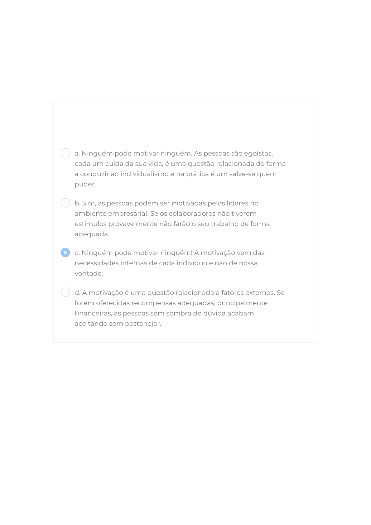 14/06/2020 Atividade 02 https://ava.politecnicabr.com.br/mod/quiz/review.php?attempt=467642 2/7 Questão 1 Completo Atingiu 2,00 de 2,00 É possível motivar uma pessoa? Escolha uma: a. Ninguém pode motivar ninguém. As pessoas são egoístas, cada um cuida da sua vida, é uma questão relacionada de forma a conduzir ao individualismo e na prática é um salve-se quem puder. b. Sim, as pessoas podem ser motivadas pelos líderes no ambiente empresarial. Se os colaboradores não tiverem estímulos provavelmente não farão o seu trabalho de forma adequada. c. Ninguém pode motivar ninguém! A motivação vem das necessidades internas de cada indivíduo e não de nossa vontade. d. A motivação é uma questão relacionada a fatores externos. Se forem oferecidas recompensas adequadas, principalmente �nanceiras, as pessoas sem sombra de dúvida acabam aceitando sem pestanejar. https://ava.politecnicabr.com.br/ 14/06/2020 Atividade 02 https://ava.politecnicabr.com.br/mod/quiz/review.php?attempt=467642 3/7 Questão 2 Completo Atingiu 2,00 de 2,00 Como age o líder baseado em valores? Escolha uma: a. Não leva em consideração os valores pessoais e nem organizacionais. O importante é o resultado �nal e a agregação de valores na empresa. b. Com integridade passando os seus valores pessoais para os colaboradores. c. Valoriza todas as contribuições dos colaboradores, mas a decisão �nal sempre é sua. Procura avaliar quais são os valores pessoais que prevalecem no ambiente de trabalho e tenta impor os seus valores no grupo como um todo. d. O líder baseado em valores age como um artista completamente absorvido na atividade criativa. Do mesmo modo, o líder ajuda a desenvolver a criatividade do grupo, servindo de catalisador da sua energia. Um líder baseado em valores envolve o grupo nesse processo de descoberta criativa. https://ava.politecnicabr.com.br/ 14/06/2020 Atividade 02 https://ava.politecnicabr.com.br/mod/quiz/review.php?attempt=467642 4/7 Questão 3 Completo Atingiu 2,00 de 2,00 Os fatores motivadores para McClelland e que levam o homem a agir são: Escolha uma: a. satisfação, poder e a�liação. b. realização, a�liação e perdas. c. realização, poder e a�liação. d. satisfação, poder e agremiação. https://ava.politecnicabr.com.br/ 14/06/2020 Atividade 02 https://ava.politecnicabr.com.br/mod/quiz/review.php?attempt=467642 5/7 Questão 4 Completo Atingiu 2,00 de 2,00 Complete as linhas pontilhadas com as palavras mais indicadas. Segundo a Teoria Motivacional de Maslow, os três primeiros conjuntos são necessidades de________________, devendo ser satisfeitas para que os indivíduos se sintam saudáveis e seguros. As duas últimas foram chamadas de necessidades de________________ , por estarem relacionadas ao desenvolvimento e à realização do potencial de cada pessoa. Escolha uma: a. carência e crescimento. b. valência e desenvolvimento. c. crescimento e carência. d. carência e ajustamento. https://ava.politecnicabr.com.br/ 14/06/2020 Atividade 02 https://ava.politecnicabr.com.br/mod/quiz/review.php?attempt=467642 6/7 Questão 5 Completo Atingiu 2,00 de 2,00 O líder nasce pronto? Escolha uma: a. Se a empresa disponibilizar um mentor ou um coach será uma tarefa fácil formar líderes, como um trabalho contínuo para as empresas. b. A liderança não é possível de ser desenvolvida. c. A liderança é um comportamento aprendido. Ele não é inato ou destinado a alguns escolhidos. Ao contrário, desenvolve-se mediante a experiência. A liderança aprendida é um processo contínuo, isto é, a pessoa não se torna repentinamente um líder. d. A liderança é um comportamento desenvolvido, mas alguns requisitos são essenciais: ser educado, ser inteligente, ter pós- graduação e principalmente ser carismático e elegante. Entre em Contato https://www.politecnicabr.com.br 0800 084 2627 indisponível devido a pandemia de COVID-19, use outro canal! 0800 084 2627 comercial@politecnicabr.com.br Links Úteis Declaração de Matrícula Orientações do AVA Abertura de Ticket Fale com o Tutor Cronograma de Estudos Solicitação de Diploma Manual de Estágio Manual de Competência https://www.politecnicabr.com.br/ mailto:comercial@politecnicabr.com.br https://storage.googleapis.com/sirius-pubstore/declaracao_matricula.pdf https://storage.googleapis.com/sirius-pubstore/orientacoes_ava.pdf https://storage.googleapis.com/sirius-pubstore/abertura_ticket.pdf https://storage.googleapis.com/sirius-pubstore/fale_com_tutor.pdf https://storage.googleapis.com/sirius-pubstore/cronograma_estudos.pdf https://storage.googleapis.com/sirius-pubstore/solicitacao_diploma.pdf https://storage.googleapis.com/sirius-pubstore/manual_estagio.pdf https://storage.googleapis.com/sirius-pubstore/manual_competencia.pdf https://ava.politecnicabr.com.br/