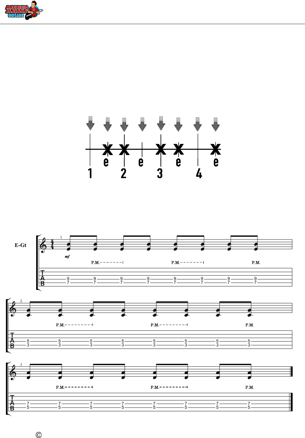 Curso Aprenda Guitarra em 45 Dias Copyright 2017 by Mauricio Alabama – Todos os direitos reservados. Página 1 Abafamento com Power Chords Para o abafamento, nós teremos que encostar a palma da mão nas cordas da guitarra, conseguindo com que o som saia abafado, esse abafamento é representando com as letras P.M., que em inglês significa Palm Mute. Vou anexar abaixo o ritmo executado para esse abafamento. Segue a sequência de acordes com abafamento que foi usado na explicação do vídeo:
