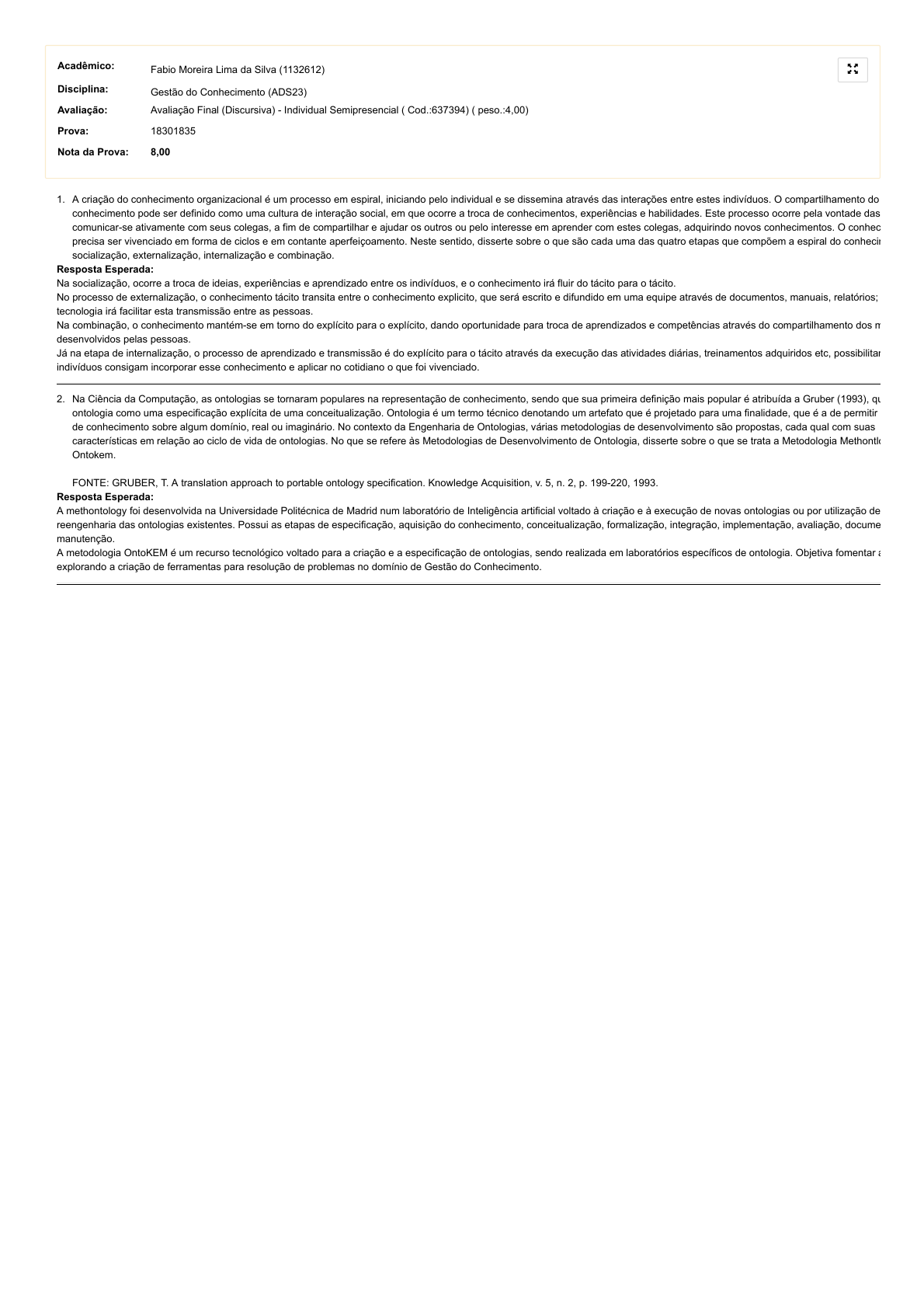 15/06/2020 UNIASSELVI - Centro Universitário Leonardo Da Vinci - Portal do Aluno - Portal do Aluno - Grupo UNIASSELVI https://portaldoalunoead.uniasselvi.com.br/ava/avaliacao/avaliacao_lista.php 1/1 Acadêmico: Fabio Moreira Lima da Silva (1132612) Disciplina: Gestão do Conhecimento (ADS23) Avaliação: Avaliação Final (Discursiva) - Individual Semipresencial ( Cod.:637394) ( peso.:4,00) Prova: 18301835 Nota da Prova: 8,00 1. A criação do conhecimento organizacional é um processo em espiral, iniciando pelo individual e se dissemina através das interações entre estes indivíduos. O compartilhamento do conhecimento pode ser definido como uma cultura de interação social, em que ocorre a troca de conhecimentos, experiências e habilidades. Este processo ocorre pela vontade das comunicar-se ativamente com seus colegas, a fim de compartilhar e ajudar os outros ou pelo interesse em aprender com estes colegas, adquirindo novos conhecimentos. O conhec precisa ser vivenciado em forma de ciclos e em contante aperfeiçoamento. Neste sentido, disserte sobre o que são cada uma das quatro etapas que compõem a espiral do conhecim socialização, externalização, internalização e combinação. Resposta Esperada: Na socialização, ocorre a troca de ideias, experiências e aprendizado entre os indivíduos, e o conhecimento irá fluir do tácito para o tácito. No processo de externalização, o conhecimento tácito transita entre o conhecimento explicito, que será escrito e difundido em uma equipe através de documentos, manuais, relatórios; tecnologia irá facilitar esta transmissão entre as pessoas. Na combinação, o conhecimento mantém-se em torno do explícito para o explícito, dando oportunidade para troca de aprendizados e competências através do compartilhamento dos m desenvolvidos pelas pessoas. Já na etapa de internalização, o processo de aprendizado e transmissão é do explícito para o tácito através da execução das atividades diárias, treinamentos adquiridos etc, possibilitan indivíduos consigam incorporar esse conhecimento e aplicar no cotidiano o que foi vivenciado. 2. Na Ciência da Computação, as ontologias se tornaram populares na representação de conhecimento, sendo que sua primeira definição mais popular é atribuída a Gruber (1993), qu ontologia como uma especificação explícita de uma conceitualização. Ontologia é um termo técnico denotando um artefato que é projetado para uma finalidade, que é a de permitir de conhecimento sobre algum domínio, real ou imaginário. No contexto da Engenharia de Ontologias, várias metodologias de desenvolvimento são propostas, cada qual com suas características em relação ao ciclo de vida de ontologias. No que se refere às Metodologias de Desenvolvimento de Ontologia, disserte sobre o que se trata a Metodologia Methontlo Ontokem. FONTE: GRUBER, T. A translation approach to portable ontology specification. Knowledge Acquisition, v. 5, n. 2, p. 199-220, 1993. Resposta Esperada: A methontology foi desenvolvida na Universidade Politécnica de Madrid num laboratório de Inteligência artificial voltado à criação e à execução de novas ontologias ou por utilização de reengenharia das ontologias existentes. Possui as etapas de especificação, aquisição do conhecimento, conceitualização, formalização, integração, implementação, avaliação, docume manutenção. A metodologia OntoKEM é um recurso tecnológico voltado para a criação e a especificação de ontologias, sendo realizada em laboratórios específicos de ontologia. Objetiva fomentar a explorando a criação de ferramentas para resolução de problemas no domínio de Gestão do Conhecimento.
