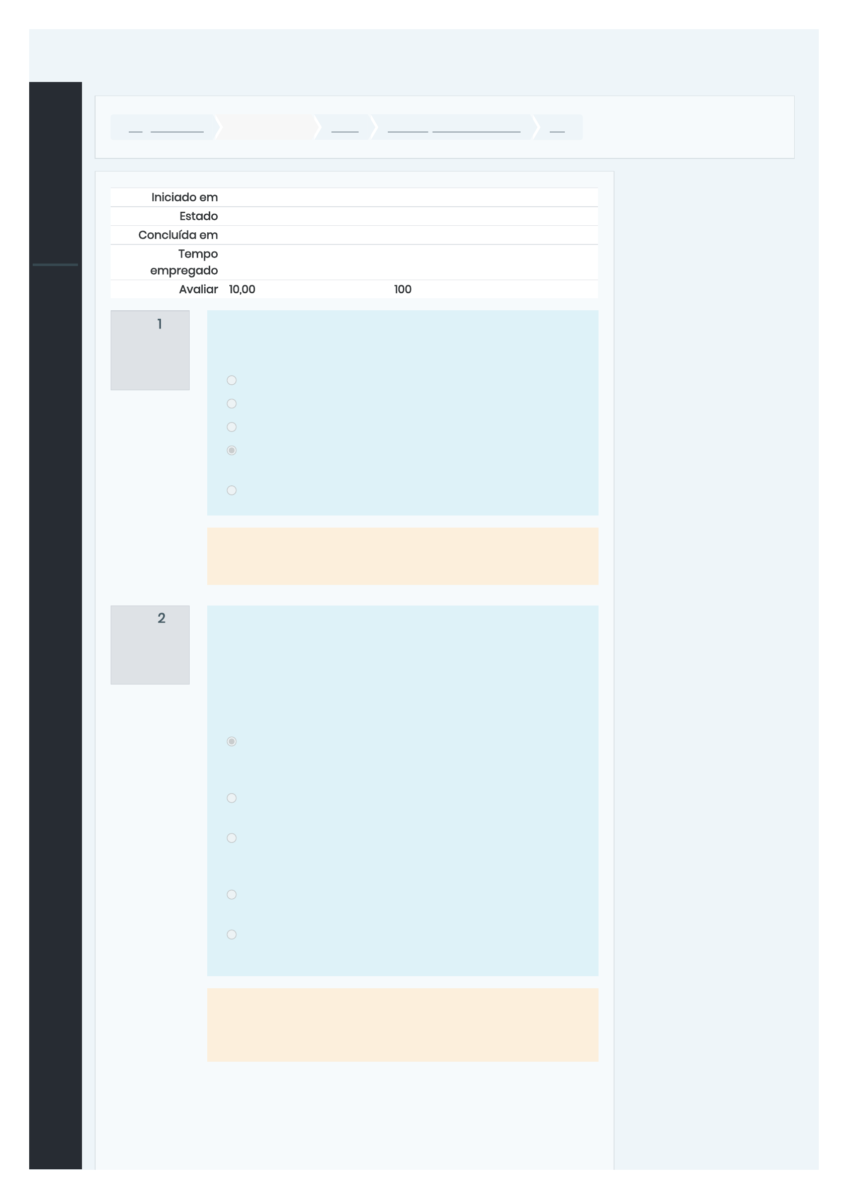 15/06/2020 TF1 https://ead.universo.edu.br/mod/quiz/review.php?attempt=14140&cmid=33398 1/4 Página inicial Meus cursos 3026 AVALIAÇÃO A DISTÂNCIA TF1 Questão 1 Correto Atingiu 1,00 de 1,00 Questão 2 Correto Atingiu 1,00 de 1,00 Iniciado em sábado, 11 Abr 2020, 17:53 Estado Finalizada Concluída em sábado, 11 Abr 2020, 18:09 Tempo empregado 16 minutos 3 segundos Avaliar 10,00 de um máximo de 10,00(100%) Onde está localizada a Mata dos Cocais? Escolha uma: a. no litoral do Brasil b. em áreas desde o Maranhão até o Espírito Santo c. na Floresta Amazônica d. entre a Amazônia e a caatinga nos estados do Maranhão, Piauí e norte do Tocantins e. no sul do Mato Grosso e no noroeste do Mato Grosso A resposta correta é: entre a Amazônia e a caatinga nos estados do Maranhão, Piauí e norte do Tocantins. A camada de ozônio existente na atmosfera funciona como um filtro da radiação ultravioleta proveniente do sol. Por isso a destruição desta camada poderá provocar um aumento da incidência de lesões cutâneas. Todas as afirmações relatadas abaixo sobre a camada de ozônio são corretas, exceto: Escolha uma: a. Uma das possíveis conseqüências da destruição da camada de ozônio é o derretimento das calotas polares provocado pelo efeito estufa. b. O uso de gases CFC (clorofluorcarbono) em aerossóis contribui para a destruição da camada de ozônio. c. Recomenda-se o uso de filtros solares nas pessoas expostas ao sol, principalmente em países onde a camada de ozônio está mais comprometida. d. A destruição da camada de ozônio ocorre com a “quebra” da molécula de ozônio. e. A radiação ultravioleta é reconhecidamente um agente mutagênico capaz de provocar câncer de pele. A resposta correta é: Uma das possíveis conseqüências da destruição da camada de ozônio é o derretimento das calotas polares provocado pelo efeito estufa.. https://ead.universo.edu.br/ https://ead.universo.edu.br/course/view.php?id=312 https://ead.universo.edu.br/course/view.php?id=312#section-5 https://ead.universo.edu.br/mod/quiz/view.php?id=33398 javascript:void(0); https://ead.universo.edu.br/user/index.php?id=312 https://ead.universo.edu.br/badges/view.php?type=2&id=312 https://ead.universo.edu.br/admin/tool/lp/coursecompetencies.php?courseid=312 https://ead.universo.edu.br/grade/report/index.php?id=312 https://ead.universo.edu.br/ https://ead.universo.edu.br/my/ https://ead.universo.edu.br/calendar/view.php?view=month&course=312 javascript:void(0); https://ead.universo.edu.br/user/files.php 15/06/2020 TF1 https://ead.universo.edu.br/mod/quiz/review.php?attempt=14140&cmid=33398 2/4 Questão 3 Correto Atingiu 1,00 de 1,00 Questão 4 Correto Atingiu 1,00 de 1,00 Questão 5 Correto Atingiu 1,00 de 1,00 Nos oceanos, o papel correspondente ao das gramíneas num pasto é desempenhado por organismos presentes em qual das alternativas: Escolha uma: a. pelas algas pluricelulares b. pelos vegetais superiores marinhos c. pelos zooplâncton d. pelos zooflagelos e. pelas algas unicelulares A resposta correta é: pelas algas unicelulares. A vegetação do manguezal sempre se apresenta com poucas espécies. Essa pobreza é condicionada principalmente: Escolha uma: a. pela fauna abundante que se alimenta de vegetais. b. pela temperatura que se apresenta sempre baixa. c. pelo elevado teor salino e pela escassez de oxigênio. d. pelo tipo de solo compactado e pobre em minerais. e. pelo grande número de parasitos que atacam as raízes. A resposta correta é: pelo elevado teor salino e pela escassez de oxigênio.. Dos sistemas abaixo, qual é caracterizado por ser uma planície de inundação contínua? Escolha uma: a. Semi-árido. b. Cerrado. c. Pantanal. d. Mata de Araucárias. e. Floresta Amazônica. A resposta correta é: Pantanal.. javascript:void(0); https://ead.universo.edu.br/user/index.php?id=312 https://ead.universo.edu.br/badges/view.php?type=2&id=312 https://ead.universo.edu.br/admin/tool/lp/coursecompetencies.php?courseid=312 https://ead.universo.edu.br/grade/report/index.php?id=312 https://ead.universo.edu.br/ https://ead.universo.edu.br/my/ https://ead.universo.edu.br/calendar/view.php?view=month&course=312 javascript:void(0); https://ead.universo.edu.br/user/files.php 15/06/2020 TF1 https://ead.universo.edu.br/mod/quiz/review.php?attempt=14140&cmid=33398 3/4 Questão 6 Correto Atingiu 1,00 de 1,00 Questão 7 Correto Atingiu 1,00 de 1,00 Biodiversidade é a riqueza biológica existente em países, sobretudo nos menos desenvolvidos, onde a área florestal ainda é bastante significativa. (UZUNIAN, A.; SASSON, S. "Ecologia: os problemas do planeta". São Paulo: Anglo, 1992.) Assinale o que for CORRETO sobre os conceitos relacionados à ecologia: Escolha uma: a. Nicho ecológico é o local onde habita uma determinada espécie. b. Alterações ambientais, como desmatamentos e queimadas, não interferem na biodiversidade da região afetada. c. Numa sucessão ecológica, os organismos pioneiros são sempre as angiospermas. d. A cadeia alimentar é um processo de passagem de energia entre os seres vivos que flui em várias direções. e. População é um conjunto de seres vivos de uma mesma espécie coexistindo em um mesmo ambiente físico. A resposta correta é: População é um conjunto de seres vivos de uma mesma espécie coexistindo em um mesmo ambiente físico.. A cada ano, a grande marcha africana se repete. São milhares de gnus e zebras, entre outros animais, que migram da Tanzânia e invadem a Reserva Masai Mara, no sudoeste do Quênia, em busca de água e pastos verdes. Durante a viagem, filhotes de gnus e zebras recém-nascidos e animais mais velhos tornam-se presas fáceis para os felinos. Outros animais não resistem e morrem durante a migração. Analise as afirmativas a seguir que trazem informações sobre fatores que contribuem para a variação na densidade populacional. I. A limitação de recursos justifica os movimentos migratórios. II. Os felinos contribuem par