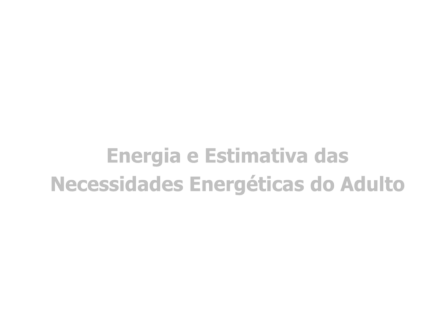 Energia e Estimativa das Necessidades Energéticas do Adulto PRÁTICAS NUTRICIONAIS III Metabolismo Energético Compreende todas as vias utilizadas pelo organismo para obter e usar energia química presentes nos nutrientes que compõem os alimentos. Alimentação Manutenção dos Processos fisiológicos Energia Importante para obter substâncias essenciais ao organismo Energia em alimentos: expressa como uma unidade de calor, a caloria. Uma caloria é definida como a quantidade de calor necessária para elevar a temperatura de 1 g de água em 1ºC, de 15ºC para 16ºC. Quilocaloria (kcaloria, kcal) - 1 g de CARBOIDRATO 4,0 Kcal/g - 1 g de PROTEÍNA 4,0 Kcal/g - 1 g de LIPÍDIO 9,0 Kcal/g - 1 g de ÁLCOOL 7,0 Kcal/g Energia em alimentos: determinada por via experimental, bomba calorimétrica: CO2 e água. Mensuração de Ingestão e Gasto Energéticos Ingestão energética da dieta: registros e frequências de alimentos. Gasto Energético: Calorimetria Direta e Calorimentria Indireta e Métodos não calorimétricos (Água duplamente marcada) Mede de forma direta a taxa de transferência de calor do corpo para o ambiente Calorimetria direta Vantagens: • Alta acurácia apenas 1 a 2 % de erro Desvantagens: • Alto custo / difícil manuseio • Altera a atividade habitual confinamento Taxa do metab. de repouso (kcal/min): 3,9 VO2 (L/min) + 1,2 VCO2 (L/min) Gasto energético de repouso (kcal/d): TMR x 1440 min Equação de Weir Calorimetria indireta Oxigênio consumido CO2 produzido Estima, por meio de um aparelho, o calor gerado pelo organismo a partir da mensuração: Água duplamente marcada 1. Ingestão de uma água duplamente marcada com isótopos de 2H e 18O 2. O desaparecimento destes isótopos são monitorados (urina e sangue) por 7 a 21 dias 3. A diferença de desaparecimento dos 2 isótopos é usada para estimar a taxa de produção de CO2 4. Juntamente com composição da dieta, calcula-se o gasto energético de 24 h É possível aferir o gasto energético de 24 horas de um indivíduo enquanto ele exerce suas atividades usuais. Água duplamente marcada Vantagens Desvantagens Método altamente preciso Não causa desconforto Mantém atividade usual Alto custo Equipamento especializado Técnicos especializados Não mede intensidade da AF Indicada em estudos clínicos Componentes do gasto energético Metabolismo Basal: Taxa Metabólica Basal Termogênese Atividade Física Gastos energéticos na deposição de novos tecidos: crescimento, gestação e lactação. Taxa de metabolismo basal/repouso (TMB) 60-75% Atividade física 15-30% Efeito térmico alimentos 10% Termogênese facultativa 10% Institute of Medicine, 2002 Componentes do Gasto Energético Total Taxa metabólica basal (TMB) Gasto energético basal (GEB) - É a energia gasta para o organismo realizar todas as suas funções (manter-se vivo) sem considerar atividade física e demais componentes do gasto energético. - Influenciada por: idade, sexo, composição corporal (massa magra) e estado nutricional em geral. Taxa metabólica de repouso (TMR) Superior a TMB (~10%), pois considera atividade muscular. Deve ser medida após 20-30 min de repouso. TMB e TMR: correspondem a aproximadamente 60 a 75% do gasto energético total do indivíduo. Também chamado de Termogênese Induzida pelos Alimentos (TIA) ou Ação Dinâmica Específica dos Alimentos (ADA) Energia necessária para a digestão, absorção, transporte, metabolismo e armazenamento do alimento consumido (termogênese obrigatória). O ETA varia com a composição da dieta. Dieta mista: responsável por 5 a 10 % do gasto energético total Efeito térmico dos Alimentos ou termogênese (ETA) Termogênese facultativa Refere-se à modificação do gasto de energia decorrente de mudanças na temperatura, ingestão de alimentos, estresse emocional e outros fatores. Demonstrada mais em animais do que em humanos. Atividade física (AF) ou voluntária Definido como o aumento do gasto energético decorrente da atividade física e constitui o componente variável do gasto energético, estando assim mais sujeito a alterações. Corresponde as atividades intencionais (locomoção, ocupação, lazer, exercício) realizadas. Energia gasta em AFs diárias leves, moderadas e vigorosas Classificação da AF Sedentária: é aquela que se desenvolve dentro de casa; Atividade leve: desenvolvida em ambiente fechado, geralmente com o indivíduo sentado: intelectuais, escriturários, costureiros, desenhistas, digitadores, motoristas, estudantes, entre outros. Atividade moderada: desenvolvida em pé: médicos, vendedores, professores, balconistas, donas de casa. Atividade intensa: desenvolvida ao ar livre, com intenso gasto energético: lixeiros, jardineiros, ambulantes, carpinteiros, pedreiros, entre outros. Atividade muito intensa: atletas, soldados, estivadores, maquinistas, entre outros. Como estimar a TMB? - Calorimetria direta (qti// calor produzida organismo) ou indireta (consumo de oxigênio e excreção de gás carbônico) - Equações preditivas Equações preditivas para estimar a TMB ou GEB Harris & Benedict (1919) Homens: TMB (kcal/dia) = 66 + [(13,7 x Peso*) + (5 x Altura**) - (6,8 x Idade)] Mulheres: TMB (kcal/dia) = 655 + [(9,6 x Peso*) + (1,7 X Altura**) - (4,7 x Idade)] * em kg / ** em cm / idade em anos Harris & Benedict A Biometric study of basal metabolism in man (Publication No 279). Washington, DC: Carnegie Institute ofWashington, 1919 FAO / OMS, 1998 Peso = kg A = metros SEXO IDADE FÓRMULA DO GEB Homem 10 – 18 16,6 P + 77 A + 572 18 – 30 15,4 P – 27 A + 717 30 – 60 11,3 P + 16 A + 901 > 60 8,8 P + 1128 A - 1071 Mulher 10 – 18 7,4 P + 482 A + 217 18 – 30 13,3 P + 334 A + 35 30 – 60 8,7 P - 25 A + 865 > 60 9,2 P + 637 A - 302 DRI / IOM, 2002/2005 BEE = basal energy expenditure (TMB ou GEB) Homens eutróficos BEE (Kcal/dia) = 204 – (4 x Idade) + (450,5 x Altura) + (11,69 x Peso) Mulheres eutróficas BEE (Kcal/dia) = 255 – (2,35 x Idade) + (401,5 x Altura)