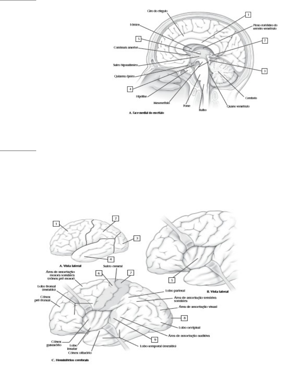 AULA 1 – DIVISÃO ANATÔMICA DO SISTEMA NERVOSO 1- Nesta secção mediana podem ser observadas algumas estruturas do SNC. Identifique quais são as estruturas 1, 2 e 5. Resposta: 1-Corpo Caloso 2- Hipotálamo 5- Tálamo. 2 - Os cinco lobos do hemisfério cerebral devem ser coloridos em cores diferentes. Mencione como é denominado cada lobo (1, 2, 3, 4 e 5) do telencéfalo. Resposta: 1- Lobo Frontal – COR AZUL. 2- Lobo Parietal – COR AMARELA. 3- Lobo Occipital – COR VERMELHA. 4- Lobo Temporal – COR VERDE. 5- Lobo da Ínsula – Fica Oculto sob os lobos Frontais e Temporal. AULA 2 – ANATOMIA DO CORAÇÃO 2- Explique porque não ocorre mistura do sangue entre as câmaras do lado direito e esquerdo. Resposta: O Septo interventricular corresponde à parede muscular localizado na porção inferior do coração. Tem a função de separar o ventrículo esquerdo do direito, para que não haja mistura de sangue venoso. AULA 3 – ANATOMIA DO SISTEMA RESPISRATÓRIO 1 - Use cores diferentes para cada uma das seguintes partes do sistema respiratório e mencione a região ou segmento do Sistema Respiratório indicado nos números 1, 2, 3, 4, 5, 6 e 7. Resposta: 1-Laringofaringe 2-Orofaringe 3-Nasofaringe 4-Cavidade nasais 5-Laringe 6-Traquéia 7-Pulmão direito 2 - Segmentos que compõem a via respiratória: Resposta: O trato respiratório é dividido em três segmentos: Trato respiratório superior: Nariz e passagens nasais, seios paranasais e garganta ou faringe vias aéreas respiratórias: Laringe, Traquéia, Brônquios e Bronquíolos. AULA 4 – ANATOMIA DO SISTEMA URINÁRIO 1 - Denomine as regiões e estruturas 5, 6, 7, 8 e 9 do rim em corte. Resposta: 5 – Córtex Renal. 6 – Pirâmides Renais. 7 – Cálices Renais Menores. 8 – Cálices Renais Maiores. 9 – Pelve Renal. 2 - Explique por que a uretra masculina é considerada urogenital. Resposta: Pelo fato de que diferentemente do sistema feminino, o sistema reprodutor masculino encontra-se interligado ao sistema excretor através do óstio que leva a eliminação da urina, assim como é o mesmo local de ejaculação. Dessa forma, considera-se a uretra masculina como urogenital, por ser o caminho para o sêmen (produzido pelo sistema reprodutor) e também para a eliminação da urina, de forma geral.