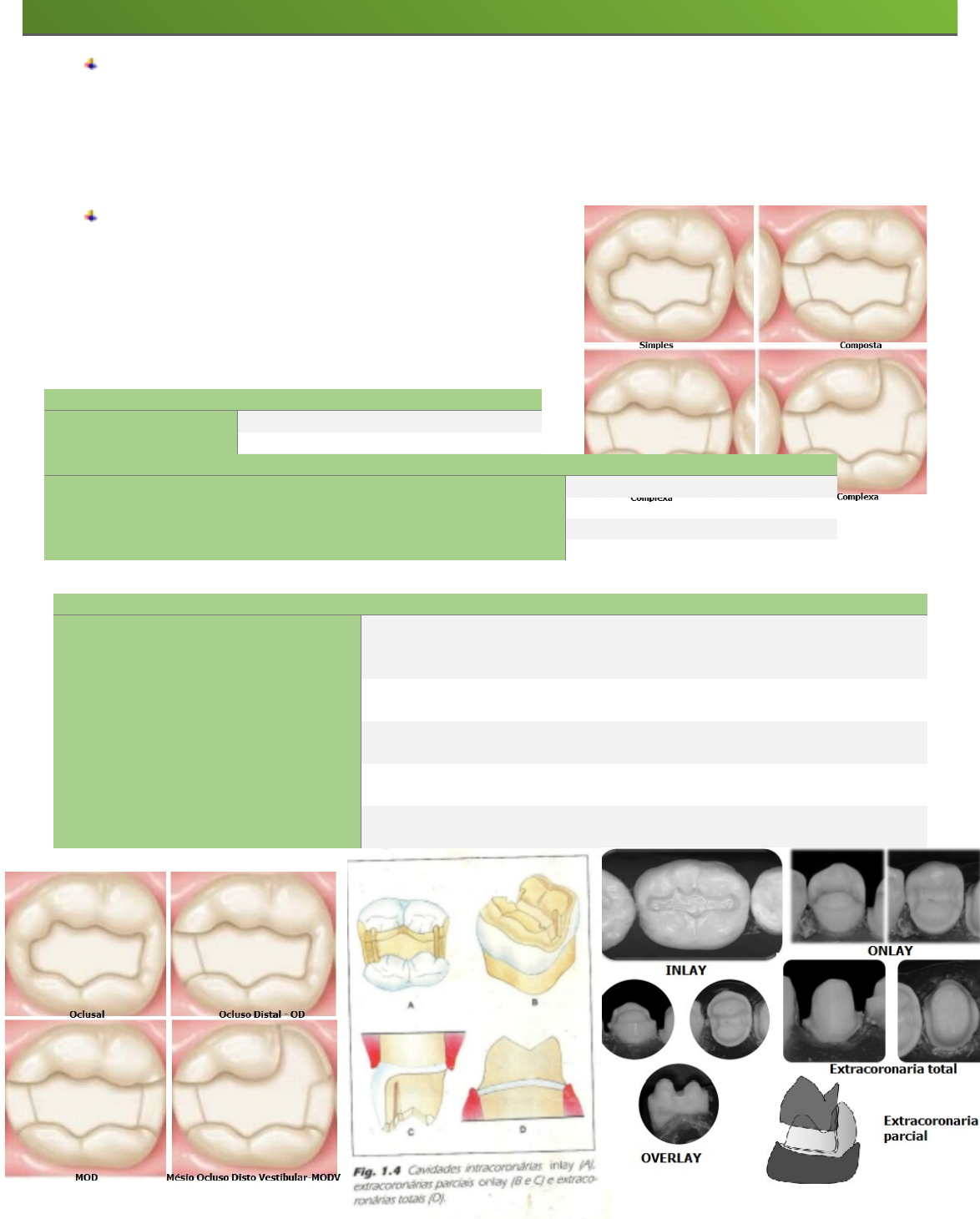 Nomenclatura e Classificação das Cavidades 1. Observações Iniciais Restauração direta: são práticas restauradoras realizadas diretamente na cavidade bucal do paciente, com o uso de amalgama, resina composta ou ionômero de vidro. Restauração indireta: São práticas realizadas fora da boca do paciente para posterior uso na mesma, como o molde de alginato e gesso modelo. 1. Nomenclatura Nada mais é que o conjunto de termos utilizados na prática clínica. Na odontologia o conhecimento da nomenclatura é fundamental para a compreensão do preparo cavitário. Quanto ao número de Faces ENVOLVIDAS Simples 1 face envolvida composta 2 faces envolvidas Complexa 3 ou mais faces envolvidas Para mais a denominação das cavidades preparadas se dá quanto: Quanto ao Nome das Faces Envolvidas Cavidade preparada na Oclusal Oclusal = O sE ESTENDE Da oclusal a mesial Mésio-Oclusal = MO Se estende as faces mesial oclusal e distal Mésio-Ocluso-Distal = MOD Se estende as faces mesial oclusal e lINGUALRecebe o nome da(s) face(s) envolvida(s) pela cavidade, sendo sua denominação abreviada pela inicial de cada face Mésio-Ocluso-Lingual = MOL Quanto a forma e extensão iNTRACORONÁRIA (INLAY) Cavidade confinada no interior da estrutura dentaria, como uma caixa. Classe I oclusal, Classe V, Classe II composta, e complexas sem proteção de cúspide. Intra-extracoronaria Cavidade que apresenta cobertura de 1 ou + cúspides, mas não todas Intra-extracoronaria Cavidades que apresentam cobertura de todas as cuspides eXTRACORONARIAS pARCIAIS (onlay) Envolvem três faces axiais do dente e a face oclusal ou incisal Restaurações MOD com proteção de cúspides; Extracoronarias totais (overlay) Envolve todas as faces axial e oclusal, ou incisal do dente Coroas Totais. Paredes Circundantes São as paredes que chegam até a superfície externa das cavidades, definindo seu contorno, estas recebem o nome da face e ou região a qual estão mais intimamente ligadas (oclusal, Mesial, distal, vestibular, lingual/palatal) De fundo São as paredes internas (nunca atingem a superfície da cavidade) correspondem ao assoalho, pode ser AXIAL quando paralela ao eixo longitudinal do dente PULPAR perpendicular ao eixo longitudinal do dente Nomenclatura das partes constituintes das cavidades: âNGULOS diedros 1º Grupo União de duas paredes circundantes 2º Grupo União de 1 parede circ. e uma de fundo 3º Grupo União de duas paredes de fundo Triedro União de 3 paredes. Cavossuperficiais Localizados na margem entre a superfície externa do dente e o preparo, sendo também denominado de margem nos casos de coroa total OBSERVAÇÃO: os ângulos recebem a denominação das paredes que os formam, com exceção dos dentes anteriores em ângulos diedros e triedros incisais, ou seja, cavidades de classe 3. 1. Classificação das Cavidades O preparo cavitário deve ser realizado em busca de remover o tecido cariado, obter formas precisas e impedir a fratura do elemento dentário e do material restaurador. 2. Quanto a finalidade Terapêuticas: são realizadas nos casos em que a lesão cariosa, abrasão, erosão, abfração, fratura ou outras lesões dos tecidos duros dos dentes tenham comprometido a estrutura coronária parcial ou totalmente, cujo preparo é condicionado a uma restauração individual do dente, visando a reconstrução morfológica funcional e estética. Protéticas:são as cavidades preparadas para servir como retentores ou apoio para prótese fixa e removível, podendo ser realizadas tanto em dentes afetados quanto em dentes hígidos. 2. Quanto a profundidade Estas podem ser superficial, rasa, média, profunda e muito profunda. Existem duas estruturas do dente que usamos como referencia para classificar quanto a profundidade que são: a junção amelo dentinaria , onde , quanto mais próximo a cavidade estiver da JAD, mais rasa e superficial ela é. E também temos como referência a polpa, quanto mais perto da polpa, mais profunda ela é. Deve se salientar, no entanto a diferença entre profundidade e extensão, de modo que a primeira se refere a proximidade com a polpa, e a segunda a dimensão da cavidade. 2. Classificação de Black Esta pode ser etiológica, se referindo as áreas mais propensas a cárie, sendo as cicatrículas e fissuras mais suscetíveis e as superfícies lisas menos suscetíveis. Outrossim, Black também classifica as cavidades em sí, como se vê a seguir: Classe I- Cavidades preparadas em regiões de má coalescência de esmalte, cicatrículas e fissuras, na face oclusal de pré-molares e molares, 2/3 oclusais da face vestibular dos molares e na face lingual dos incisivos e caninos superiores, ocasionalmente, na face palatina dos molares superiores, a largura deve ter ¼ do comprimento para que haja retenção; inserir a broca ligeiramente inclinada iniciando pelo centro e usando, sempre, somente metade da ponta ativa. Ademais, quanto a retenção as paredes devem ser paralelas com base lisa, exceto, no 1PMI o qual tem inclinação da parede pulpar, de modo que o assoalho dessa cavidade deve seguir a inclinação da face oclusal deste dente; é importante ressaltar que independente da inclinação o esmalte deve estar suportando de forma ideal por dentina Classe I Composta- cavidades preparas em molares envolvendo duas fazes do dente seguindo um sulco lingual, sem invadir ponte de esmalte e preservando as vertentes das cúspides; deve se colocar a broca na fossa central ligeiramente inclinada para lingual executando a penetração inicial com metade da ponta ativa seguindo com a movimentação para lingual acompanhando o sulco disto lingual da face oclusal e mantendo a largura correspondente a broca evitando assim enfraquecer a ponte de esmalte e as cúspides DL e crista marginal, deve se lembrar da realização da caixa lingual/palatina descendo em tal porção a broca inteira de modo reto seguindo o sulco correspondente e formando uma parede paralela de ângulo reto com a pulpar