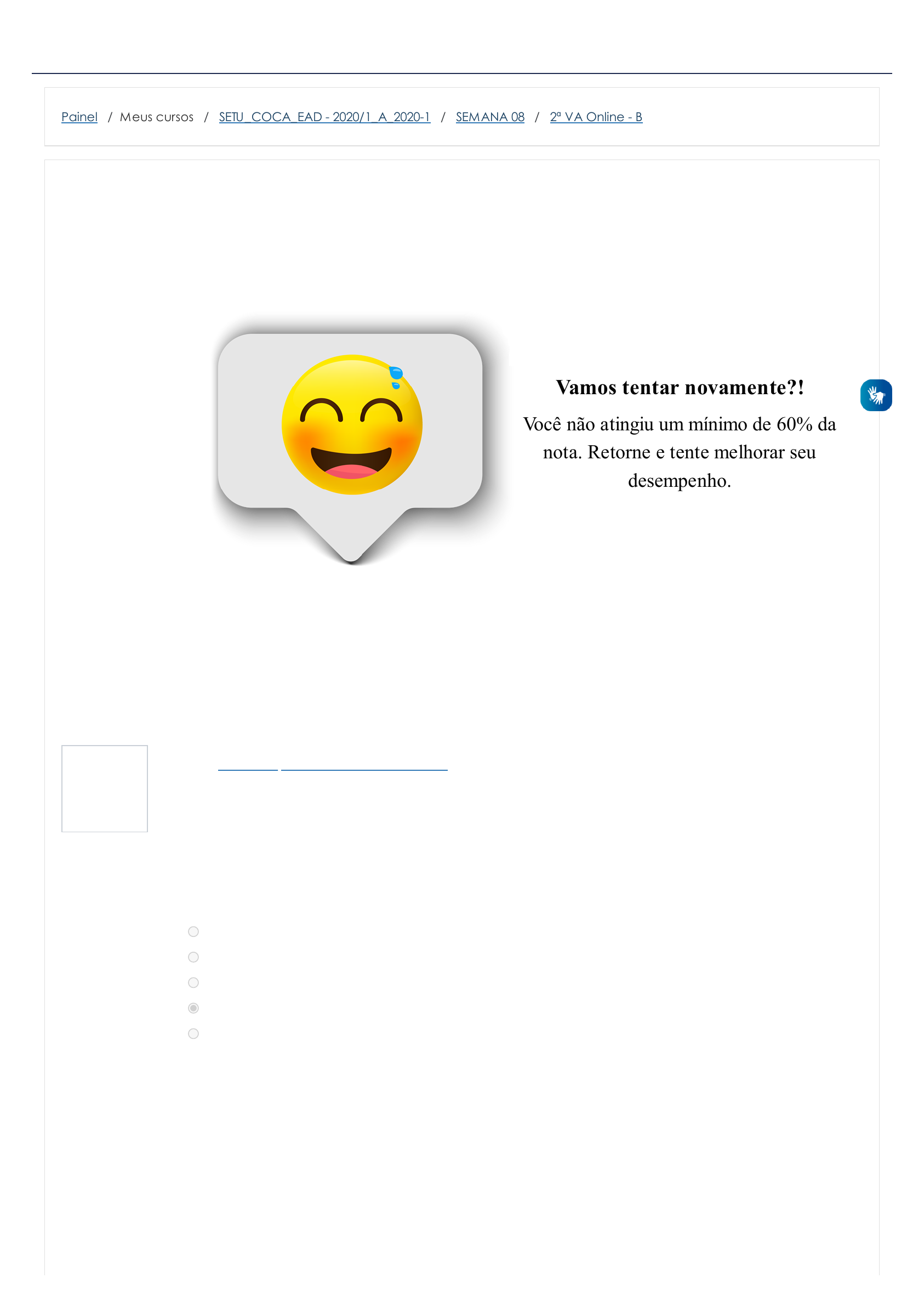 08/06/2020 2ª VA Online - B: Revisão da tentativa https://ead.unievangelica.edu.br/disciplinasonline/mod/quiz/review.php?attempt=191459&cmid=29511 1/5 Painel / Meus cursos / SETU_COCA_EAD - 2020/1_A_2020-1 / SEMANA 08 / 2ª VA Online - B Questão 1 Completo Atingiu 5,00 de 5,00 Iniciado em sábado, 30 Mai 2020, 20:02 Estado Finalizada Concluída em sábado, 30 Mai 2020, 20:24 Tempo empregado 22 minutos 20 segundos Avaliar 15,00 de um máximo de 50,00(30%) Comentários Vamos tentar novamente?! Você não atingiu um mínimo de 60% da nota. Retorne e tente melhorar seu desempenho. Sobre Consultoria, Mentoria e outras Tendências, julgue os itens a seguir: 1 - Os consultores normalmente trabalham internamente, em tempo integral, nas empresas. 2 - Consultoria não é sinônimo de implementar, entregar, instruir ou executar, embora possa incluir qualquer dessas atividades. 3 - Somente a consultoria pode conseguir estabelecer a ponte final para a competência inconsciente e a aplicação de novas habilidades ao trabalho. Escolha uma: a. V;V;V b. V;V;F c. V;F;F d. F;V;V e. F;F;F Sua resposta está correta. https://ead.unievangelica.edu.br/disciplinasonline/my/ https://ead.unievangelica.edu.br/disciplinasonline/course/view.php?id=2648 https://ead.unievangelica.edu.br/disciplinasonline/course/view.php?id=2648§ion=9 https://ead.unievangelica.edu.br/disciplinasonline/mod/quiz/view.php?id=29511 https://ead.unievangelica.edu.br/disciplinasonline/mod/lti/view.php?id=29586 08/06/2020 2ª VA Online - B: Revisão da tentativa https://ead.unievangelica.edu.br/disciplinasonline/mod/quiz/review.php?attempt=191459&cmid=29511 2/5 Questão 2 Completo Atingiu 0,00 de 5,00 Questão 3 Completo Atingiu 0,00 de 5,00 Questão 4 Completo Atingiu 0,00 de 5,00 O Coaching é uma metodologia que apresenta uma diversidade de aplicações, nas mais diversas áreas de interesse, seja em uma configuração de grupo ou individual. O Coaching pode ser aplicado para diferentes finalidades, como: Escolha uma: a. todas as alternativas estão corretas b. avaliações de desempenho de tarefas c. motivação individual e de equipe d. trabalho em equipe e. delegação de responsabilidades Sua resposta está incorreta. Sobre Modalidades de Coaching, julgue os itens a seguir: 1 - O Coaching de desempenho é recomendável quando tratamos com indivíduos com um histórico de realização de tarefas com alta capacidade e confiança, mas que, no presente, apresentam desempenho que não mais reflete essas qualidades. 2 - O objetivo do Coaching de desempenho é reatar competências e confianças passadas a respeito de objetivos ou tarefas, com isso retomando o impulso e melhorando o desempenho. 3 - Gerentes e profissionais de RH que usam o Coaching quando o desempenho está em queda precisam de toda a naturalidade possível na transmissão acurada e objetiva de feedback. Escolha uma: a. F;F;F b. F;V;V c. V;V;F d. V;V;V e. V;F;F Sua resposta está incorreta. Sobre Coaching versus mentoria na gestão de carreira, julgue os itens a seguir: 1 - Mentoring é reservada ao gerenciamento de pessoas cujo desempenho está abaixo da média. 2 - O Mentoring passou a ser considerado uma das grandes ferramentas que os profissionais podem empregar para avançar em suas carreiras. 3 - Os mentores se aprofundam, isto é, estão mais envolvidos com os colaboradores como um todo. Escolha uma: a. V;V;V b. F;V;V c. V;F;F d. V;V;F e. F;F;F Sua resposta está incorreta. https://ead.unievangelica.edu.br/disciplinasonline/mod/lti/view.php?id=29606 https://ead.unievangelica.edu.br/disciplinasonline/mod/url/view.php?id=29508 08/06/2020 2ª VA Online - B: Revisão da tentativa https://ead.unievangelica.edu.br/disciplinasonline/mod/quiz/review.php?attempt=191459&cmid=29511 3/5 Questão 5 Completo Atingiu 5,00 de 5,00 Questão 6 Completo Atingiu 0,00 de 5,00 Questão 7 Completo Atingiu 0,00 de 5,00 Sobre O projeto de implementação do Coaching, julgue os itens a seguir: 1 - O feedback melhor e mais útil é detalhado, o que inclui as opiniões positivas. 2 - Conjeturas funcionam muito bem como bom Coaching. 3 - Todo o feedback está direcionado a melhorias, seja ele “afirmativo” ou “negativo.” Escolha uma: a. F;V;V b. V;V;V c. V;V;F d. F;F;F e. V;F;V Sua resposta está correta. Sobre Coach e coachee, julgue os itens a seguir: 1 - Ao longo do estabelecimento da confiança, o coachee não pode evitar falar com o coach sobre nenhum assunto. 2 - A confidencialidade deve ser estabelecida como um contrato entre coach e coachee, no sentido de garantir mais segurança à relação. 3 - Quando o coaching é contratado para atuar dentro da organização, ou mesmo quando um dos funcionários é deslocado para realizar essa atividade, os efeitos de uma boa relação vão repercutir na organização como um todo. Escolha uma: a. V;V;F b. F;V;V c. F;F;F d. V;V;V e. V;F;F Sua resposta está incorreta. Se ocorrer algum problema no processo de implementação do Coaching e o cliente estiver resistente, ressentido ou contrariado, algumas medidas podem ser adotadas, exceto: Escolha uma: a. Reconheça a discordância b. Pergunte o que deixaria o cliente satisfeito c. Use evidências d. Cogite postergar ou mesmo encerrar a relação e. Abusos podem ser aceitos as vezes Sua resposta está incorreta. https://ead.unievangelica.edu.br/disciplinasonline/mod/lti/view.php?id=29611 https://ead.unievangelica.edu.br/disciplinasonline/mod/lti/view.php?id=29597 https://ead.unievangelica.edu.br/disciplinasonline/mod/lti/view.php?id=29597 08/06/2020 2ª VA Online - B: Revisão da tentativa https://ead.unievangelica.edu.br/disciplinasonline/mod/quiz/review.php?attempt=191459&cmid=29511 4/5 Questão 8 Completo Atingiu 0,00 de 5,00 Questão 9 Completo Atingiu 0,00 de 5,00 Questão 10 Completo Atingiu 5,00 de 5,00 Sobre Aplicações do Coaching, julgue os itens a seguir: 1 - O Coaching de vida lida com pessoas que têm autoridade e poder dentro de uma organização. 2 - O Coaching executivo lida co