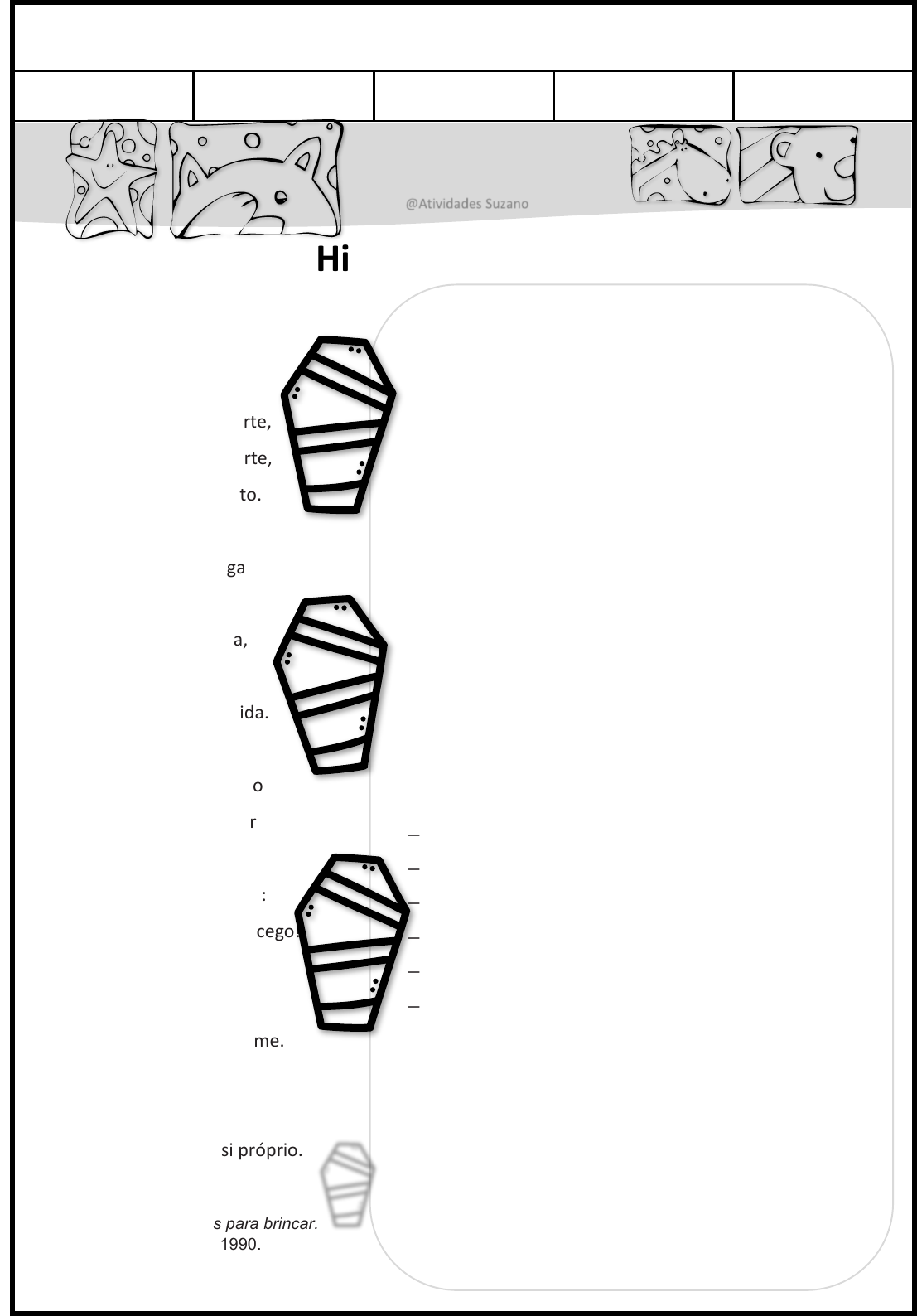 Atividades Suzano segunda-feira terça-feira quarta-feira quinta-feira sexta-feira Nome: ____________________________________ _____data: ___________ Histórias de bicho Cemitério Aqui jaz um leão chamado Augusto. Deu um urro tão forte, mas um urro tão forte, que morreu de susto. Aqui jaz uma pulga chamada Cida. Desgostosa da vida, tomou inseticida: era uma pulga suicida. Aqui jaz um morcego que morreu de amor por outro morcego. Desse amor arrenego: amor cego, o de morcego! Neste túmulo vazio jaz um bicho sem nome. Bicho mais impróprio! Tinha tanta fome que comeu-se a si próprio. José Paulo Paes Poemas para brincar. São Paulo: Ática, 1990. texto @Atividades Suzano Vocabulário Arrenego: renuncio, abandono. Desgostosa: triste, aborrecida. Impróprio: que não é próprio, inadequado. Jaz: está deitado, repousando. Urro: rugido, berro. Rescreva o poema “Cemitério” substituindo as palavras listadas no vocabulário pelo seu sinônimo. ________________________________________ ________________________________________ ________________________________________ ________________________________________ ________________________________________ ________________________________________ ________________________________________ ________________________________________ ________________________________________ ________________________________________ ________________________________________ ________________________________________ ________________________________________ ________________________________________ ________________________________________ ________________________________________ ________________________________________ ________________________________________ ________________________________________ ________________________________________ ____ D Atividades Suzano Trabalhando o texto Qual o título do texto e quem é o autor? É possível um leão morrer de susto do próprio urro? Por quê? O morcego morreu de amor cego. Como é um amor cego? O autor brincou com as palavras neste poema. Observe: Cida tomou inseticida e virou suicida. Com que outras palavras você poderia brincar? Vamos pensar sobre o tema: AMBIÇÃO Relendo a estrofe número 4, quem você acha que era esse bicho? Por quê? A fome que o autor descreve pode se referir apenas aos alimentos ou também à ganância,à ambição? __________________________________________________________________ __________________________________________________________________ __________________________________________________________________ ________ __________________________________________________________________ __________________________________________________________________ __________________________________________________________________ ________ __________________________________________________________________ __________________________________________________________________ __________________________________________________________________ ________ __________________________________________________________________ __________________________________________________________________ __________________________________________________________________ ________ __________________________________________________________________ __________________________________________________________________ __________________________________________________________________ ________