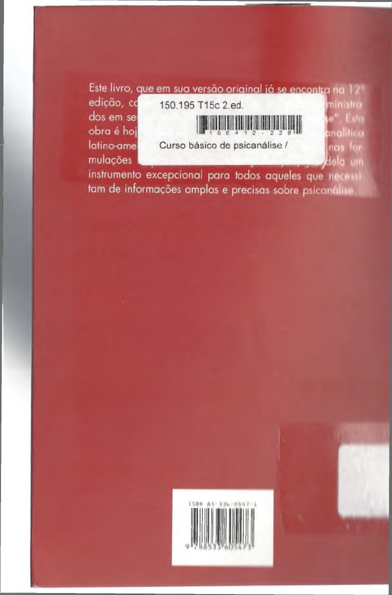 CURSO BASICO DE PSICANÁLISE /4 . 7<zlía£&viO' Martins Fontes Título original: CURSO BÁSICO DE PSIC0ANÁLIS1S. Copyright © Editorial Paidós. Copyright © 1989, Livraria Martins Fontes Editora Ltda., São Pauto, para a presente edição. Ia ed ição abril de 1989 2a edição outubro de 1996 3a tiragem abril de 2004 Tradução ÁLVARO CABRAL Revisão da tradução Monica Stahel R evisões gráficas Coordenação de Maurício Balthazar Leal P rodução gráfica Geraldo Alves Dados Internacionais de Catalogação na Publicação (CIP) (Câmara Brasileira do Livro, SP, Brasil) Tallaferro, Alberto Curso básico de psicanálise / Alberto Tallaferro ; [tradução Álvaro Cabral], - 2- ed. - São Paulo : Martins Fontes, 1996. - (Estante de Psicanálise) - *%?+* Bibliografia. ISBN 85-336-0547-1 1. Psicanálise I. Título. II. Série. CDD-616.8917 96-4206________________________________ ________ NLM-WM-460 índ ices para catá logo sistem ático: 1. Psicanálise : Medicina 616.8917 Todos os direitos desta edição para a língua portuguesa reservados à Livraria Martins Fontes Editora Ltda. Rua Conselheiro Ramalho, 330/340 01325-000 São Paulo SP Brasil Tel. (11) 3241.3677 Fax (11)3105.6867 e-mail: info@martinsfontes.com.br http:llwww.martinsfontes.com.br ✓ índice In trodução ...................................................................................... 1 A medicina psicossomática..................................................... 6 Capítulo I — História da histeria.................................................. 13 Capítulo II — Desenvolvimento do movimento psicanalítico.................................................................................... 25 Capítulo III —Topografia do aparelho psíquico......................... 37 O sistema inconsciente ........................................................... 38 Características do inconsciente, 42 O sistema pré-consciente....................................................... 45 O sistema consciente.............................................................. 46 As instâncias do aparelho psíquico: o i d .............................. 47 Libido, 52 O e g o ....................................................................................... 56 Desenvolvimento do ego, 59 — Duas funções importantes do ego, 64 — A função de síntese do ego, 65 Alguns conceitos básicos de Melanie K lein......................... 66 Características das emoções da criança pequena................. 72 A posição infantil depressiva................................................. 75 Mecanismos de defesa do eg o ............................................... 77 Mecanismos de defesa do ego contra perigos intrapsíquicos, 77 — A repressão, 78 — A regressão, 80 — O isolamento, 81 — A anula ção ou reparação, 81 — A formação reativa, 82 — A identificação, 83 — A projeção, 85 — Troca de um instinto pelo seu contrário, 85 — Volta do instinto contra o ego, 86 — A sublimação, 86 — Meca- nismos de defesa do ego contra perigos extrapsíquicos, 87 — A nega ção em atos e palavras, 88 — A negação na fantasia, 89 — A limita ção do ego, 90 — Identificação com o agressor temido, 91 — A re núncia altruísta, 93 O superego........................................................................... 94 Capítulo IV — Os atos falhos....................................................... 101 Capítulo V — Os sonhos............................................................. 107 Dramatização ou concretização. 110 — Condensação, 111 — Des dobramento ou multiplicação, 111 — Deslocamento, 112 — Inver são da cronologia. 112 — Representação pelo oposto, 112 — Re presentação pelo nímio, 113 — Representação simbólica, 113 Capítulo VI — Etapas da evolução da libido............................... 121 Fase o ra l............................................................................... 123 Importância da relação energética entre mamilo e boca lactente, 131 Fase anal............................................................................... 136 Fantasias sexuais da fase anal, 142 — Diversas formas de expressão da libido anal, 143 Fase fálico-genital................................................................ 145 Fantasias sexuais da fase fálica, 148 A bissexualidade.................................................................. 151 Dados embriológicos, 152 — Dados anatômicos, 153 — Dados celulares, 153 — Dados bioquímicos, 153 — Dados de pesquisas com vertebrados e mamíferos superiores. 154 Complexo de Édipo............................................................. 156 Evolução do complexo de Édipo nas meninas, 159 Período de latência.............................................................. 161 Puberdade............................................................................. 164 Capítulo VII — A angústia......................................................... 171 Capítulo VIII — O caráter........................................................... 185 Estruturação do caráter....................................................... 189 A função econômica libidinal do caráter............................. 193 Caráter normal e patológico................................................ 196 Caráter histérico, 198 — Caráter obsessivo, 199 — Caráter fálico- narcísico, 201 — Caráter normal e caráter neurótico: modo de pen sar, 203 — Caráter normal e caráter neurótico: atuação, 203 — Caráter normal e caráter neurótico: sexualidade, 204 — Caráter normal e caráter neurótico: trabalho, 204 — O caráter neurótico, 205 — O caráter normal, 206 Capítulo IX — A simultaneidade emoção-músculo................ Couraça muscular................................................................ O músculo como elemento de descarga energética............. Astenia, 219 