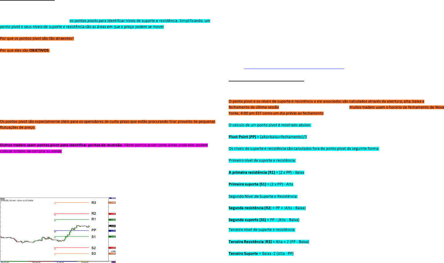 [Fundamental] 8 Pontos Pivot 8.1 - Pontos Pivots Forex Você está animado? É seu último ano no colegial antes de ir para a escola! Traders profissionais e gestores utilizam os pontos pivots para identificar níveis de suporte e resistência. Simplificando, um ponto pivot e seus níveis de suporte e resistência são as áreas em que o preço podem se mover. Por que os pontos pivot são tão atraentes? Por que eles são OBJETIVOS. Diferente de alguns outros indicadores que nós já ensinamos, não uma direção envolvida. Em muitos aspectos, os pontos pivot são similares aos níveis Fibonacci. O fato de muitas pessoas estarem olhando para estes níveis os torna quase auto-realizáveis. A principal diferença entre os dois é que, com Fibonacci, ainda há alguma subjetividade envolvida na escolha dos Swings altos e baixos. Com pontos pivot, os traders costumam usar o mesmo método de cálculo. Muitos traders mantêm o olho sobre esses níveis e você deve também. Os pontos pivot são especialmente úteis para os operadores de curto prazo que estão procurando tirar proveito de pequenas flutuações de preço. Assim como os níveis normais de apoio e resistência, os traders podem operar a partir do salto ou quebra em algum desses níveis. Outros traders usam pontos pivot para identificar pontos de reversão. Vêem pontos pivot como áreas onde eles podem colocar ordens de compra ou venda. Ainda outros traders usam os pontos pivot para reconhecer os níveis-chave que precisam ser quebrados para que o movimento seja classificado como uma fuga real. Aqui está um exemplo de pontos pivot em um gráfico de 1 hora de EUR/USD: Como você pode ver, os níveis de suporte horizontais e de resistência são colocados em seu gráfico. E veja - eles foram marcados bem para você! Quão convincente é? 153 Aqui está uma legenda rápida para as siglas: PP representa Pivot Point. S representa o Suporte. R representa a Resistência. Mas não fique muito preso à ideia "S1 tem de ser suporte" ou "R1 tem de ser resistência." Vamos explicar o porquê mais tarde. Nas lições seguintes, você vai aprender como calcular pontos pivot, os diferentes tipos de pontos pivot e, mais importante, como você pode adicionar os pontos pivot à sua caixa de ferramentas de negociação! Original: http://www.babypips.com/school/forex-pivot-points.html 8.2 - Como Calcular o Ponto Pivot A primeira coisa que você vai aprender é como calcular os níveis dos ponto pivot. O ponto pivot e os níveis de suporte e resistência a ele associados são calculados através da abertura, alta, baixa e fechamento da última sessão. Como forex é um mercado de 24 horas, muitos traders usam o horário de fechamento de Nova Yorke, 4:00 pm EST como um dia prévio ao fechamento. O cálculo de um ponto pivot é mostrado abaixo: Pivot Point (PP) = (alta+baixa+fechamento)/3 Os níveis de suporte e resistência são calculados fora do ponto pivot da seguinte forma: Primeiro nível de suporte e resistência: A primeira resistência (R1) = (2 x PP) - Baixa Primeiro suporte (S1) = (2 x PP) - Alta Segundo Nível de Suporte e Resistência: Segunda resistência (R2) = PP + (Alta - Baixa) Segundo suporte (SS) = PP - (Alta - Baixa) Terceiro nível de suporte e resistência: Terceira Resistência (R3) = Alta + 2 (PP - Baixa) Terceiro Suporte = Baixa -2 (Alta - PP) Tenha em mente que alguns softwares gráficos parcelam indeterminados níveis ou níveis de pontos-médios. Estes são basicamente os níveis mínimos entre o ponto pivot e o suporte e a resistência. 154