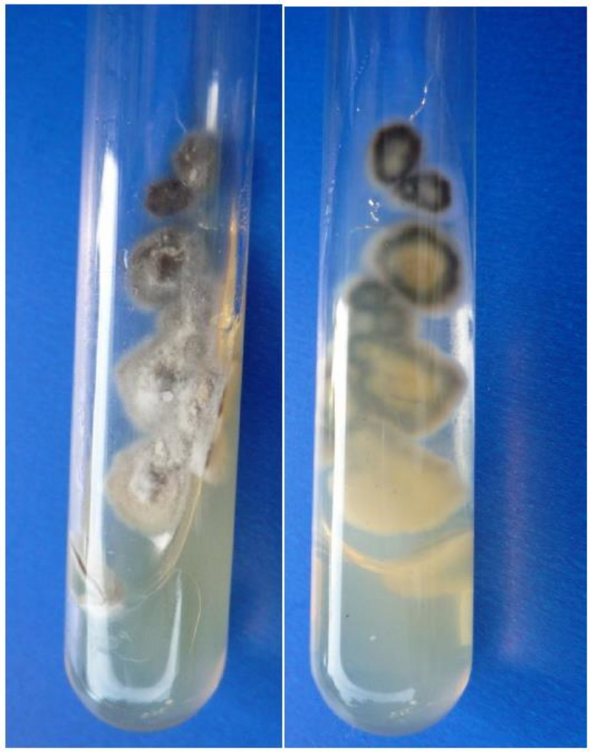 Em relação a cada colônia descreva as características macroscópicas Colônia 1: Colônia filamentosa membranosa, de brilho nacarado, cor escura na borda e reverso com pigmento escuro na borda. Colônia 2: Colônia filamentosa algodonosa branca e reverso incolor. Colônia 3: Colônia filamentosa algodonosa, enchendo todo o interior do tubo, cor branca a bege, com grãos (esporângios) na parte superior e reverso incolor a castanho. Colônia 4 Colônia leveduriforme pregueada bege e reverso incolor. Colônia 5: Colônia filamentosa membranosa, de brilho nacarado, cor escura na borda e reverso com pigmento escuro na borda. Colônia 6: Colônia filamentosa pulverulenta ou, para alguns, granulosa, cor canela com açúcar, reverso de incolor a castanho. Colônia 7: Colônia filamentosa algodonosa branca e reverso lilás. Colônia 8: Colônia leveduriformes pregueada branca reverso incolor. Colônia 9: Colônia cerebriforme alaranjada e reverso alaranjado. Colônia 10 10. Colônia filamentosa algodonosa ou aveludada. De cor escura (cinza, verde, preta tec.) no anverso e reverso preto. Colônia 11 Colônia filamentosa pulverulenta verde e reverso de incolor a castanho. Colônia 12 Colônia filamentosa aveludada de cor amarelo esverdeado (lembrando “limão podre” – limão maduro) e reverso castanho. Colônia 13: Colônia filamentosa granulosa preta ou castanho escuro (lembra borra de café) e reverso de incolor a castanho.