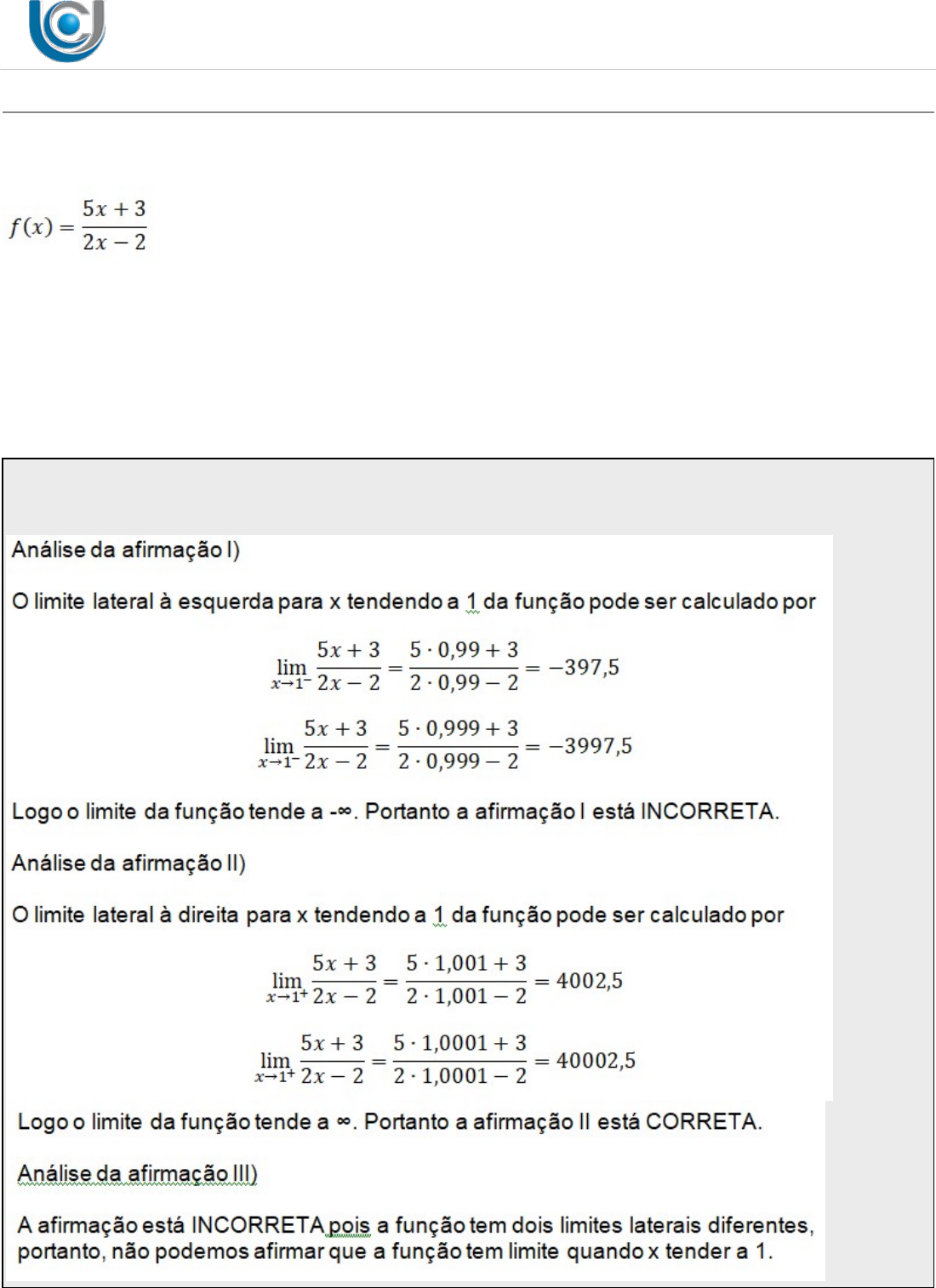 UNICESUMAR - CENTRO UNIVERSITÁRIO CESUMAR PRÉ-VISUALIZAÇÃO DE QUESTÕES QUESTÃO 01 | Objetiva Código: 181299 O conceito de limite é muito utilizado para analisar funções, principalmente quando a função não pode ser calculada para algum valor de x. Nesta condição, ou fazemos uma manipulação na função ou aplicamos os limites laterais e avaliamos o comportamento da função. Dada a função: Analise as afirmações apresentadas. I) O limite lateral à esquerda para x tendendo a 1 tem como resultado o número -397. II) O limite lateral à direita para x tendendo a 1tem como resultado ∞ (infinito positivo). III) O limite da função para x tendendo a 1 é infinito positivo. É correto o que se afirma em: Resposta esperada: RISPOLDI, V.C., FRAGELLI, R.R., AMORIN, R.G.G, Cálculo Diferencial e Integral I. Maringá-Pr.: Unicesumar, 2018 [Unidade 2, pg 58 a 60]. UNICESUMAR - CENTRO UNIVERSITÁRIO CESUMAR PRÉ-VISUALIZAÇÃO DE QUESTÕES A I, II e III. B I e II apenas. C II e III apenas. D I e III apenas. E II apenas. QUESTÃO 02 | Objetiva Código: 181300 O custo médio de um determinado produto pode ser calculado dividindo-se a função pela quantidade de produtos fabricados ou pela variável que representa esta quantidade, se a fabricação de peças automotivas de uma montadora apresentar como função custo médio a seguinte expressão. Avalie o custo médio deste produto quando a produção for de uma grande quantidade de peças (x tendendo a infinito) e assinale a alternativa com o valor deste custo médio. Resposta esperada: RISPOLDI, V.C., FRAGELLI, R.R., AMORIN, R.G.G, Cálculo Diferencial e Integral I. Maringá-Pr.: Unicesumar, 2018 [Unidade 2, pg 65 a 75]. A R$45.000,00. B R$46.300,00. C R$1.300,00. D R$1.800,00. E R$0,00. UNICESUMAR - CENTRO UNIVERSITÁRIO CESUMAR PRÉ-VISUALIZAÇÃO DE QUESTÕES QUESTÃO 03 | Objetiva Código: 181301 Uma das aplicações do limite é a determinação do coeficiente angular de uma reta tangente que passe por uma função especificada, aplicando o limite à equação da reta secante. Se a função analisada for dada por f(x) = 3x2 – 2x + 5, analise as informações apresentadas. I) O coeficiente angular da reta tangente ao ponto x0 = 2 é m = 10 II) O coeficiente angular da reta tangente ao ponto x0 = 1 é m = 5 III) O coeficiente angular da reta tangente ao ponto x0 = 0 é m = -2 É correto o que se afirma em: Resposta esperada: RISPOLDI, V.C., FRAGELLI, R.R., AMORIN, R.G.G, Cálculo Diferencial e Integral I. Maringá-Pr.: Unicesumar, 2018 [Unidade 2, pg 85 a 90]. UNICESUMAR - CENTRO UNIVERSITÁRIO CESUMAR PRÉ-VISUALIZAÇÃO DE QUESTÕES A II e III apenas. B I e II apenas. C I e III apenas. D II apenas. E I, II e III. UNICESUMAR - CENTRO UNIVERSITÁRIO CESUMAR PRÉ-VISUALIZAÇÃO DE QUESTÕES QUESTÃO 04 | Objetiva Código: 181302 A derivada de uma função pode representar a taxa de variação da função e pode ser calculada utilizando a definição original da derivada que considera a aplicação do limite. Aplique o conceito do limite para calcular a derivada da função: Assinale a alternativa com o valor da derivada calculada para x = -7. Resposta esperada: RISPOLDI, V.C., FRAGELLI, R.R., AMORIN, R.G.G, Cálculo Diferencial e Integral I. Maringá-Pr.: Unicesumar, 2018 [Unidade 3, pg 98 a 104]. A -8.680. B 2.465. C 8.470. D -2.435. E -2.850. UNICESUMAR - CENTRO UNIVERSITÁRIO CESUMAR PRÉ-VISUALIZAÇÃO DE QUESTÕES QUESTÃO 05 | Objetiva Código: 181303 A produtividade de uma unidade fabril é definida pela seguinte função. Sendo x as horas de trabalho utilizadas no processo fabril e P a quantidade de unidades produzidas. A derivada da função permite calcular a taxa de variação da função produtividade para cada acréscimo no tempo utilizado na produção. Considerando a aplicação da derivada para analisar a função, considere as afirmações apresentadas. I) A taxa de produção considerando um uso de 50h de trabalho é de 35,04 unidades. II) A taxa de produção para 40h de trabalho é de 42,3 unidades. III) Se forem utilizadas 60h, a taxa de produção é de 35,03 unidades. É correto o que se afirma em: Resposta esperada: RISPOLDI, V.C., FRAGELLI, R.R., AMORIN, R.G.G, Cálculo Diferencial e Integral I. Maringá-Pr.: Unicesumar, 2018 [Unidade 1, pg 105 a 112 e Unidade 5, pg 191 a 194]. De acordo com os cálculos abaixo, as alternativas estão: I) Correta; II) Incorreta; III) Correta; UNICESUMAR - CENTRO UNIVERSITÁRIO CESUMAR PRÉ-VISUALIZAÇÃO DE QUESTÕES A II e III apenas. B I e II apenas. C I e III apenas. D III apenas. E I, II e III. QUESTÃO 06 | Objetiva Código: 181517 Utilizando dados históricos, a prefeitura de uma cidade elaborou uma função exponencial que representa o crescimento da população local a partir de 1970, dada por: Sendo P(t) a população em milhares de pessoas e t o tempo em anos, contando 1970 como t=0. Sabendo que a taxa de variação de uma função pode ser calculada por sua derivada, determine a taxa de crescimento da população desta cidade para 2015 e assinale a alternativa correta. Resposta esperada: RISPOLDI, V.C., FRAGELLI, R.R., AMORIN, R.G.G, Cálculo Diferencial e Integral I. Maringá-Pr.: Unicesumar, 2018 [Unidade 3, pg 105 a 112 - 193]. UNICESUMAR - CENTRO UNIVERSITÁRIO CESUMAR PRÉ-VISUALIZAÇÃO DE QUESTÕES A A taxa de crescimento da população em 2015 é de aproximadamente 19692 pessoas/ano. B A taxa de crescimento da população em 2015 é de aproximadamente 15782 pessoas/ano. C A taxa de crescimento da população em 2015 é de aproximadamente 10327 pessoas/ano. D A taxa de crescimento da população em 2015 é de aproximadamente 22138 pessoas/ano. E A taxa de crescimento da população em 2015 é de aproximadamente 26550 pessoas/ano. QUESTÃO 07 | Objetiva Código: 181518 A venda de uma companhia apresenta comportamento sazonal, sendo definido pela função: Sendo V(t) o volume de vendas em unidades de produtos e t o tempo em meses. Se a derivada da funç