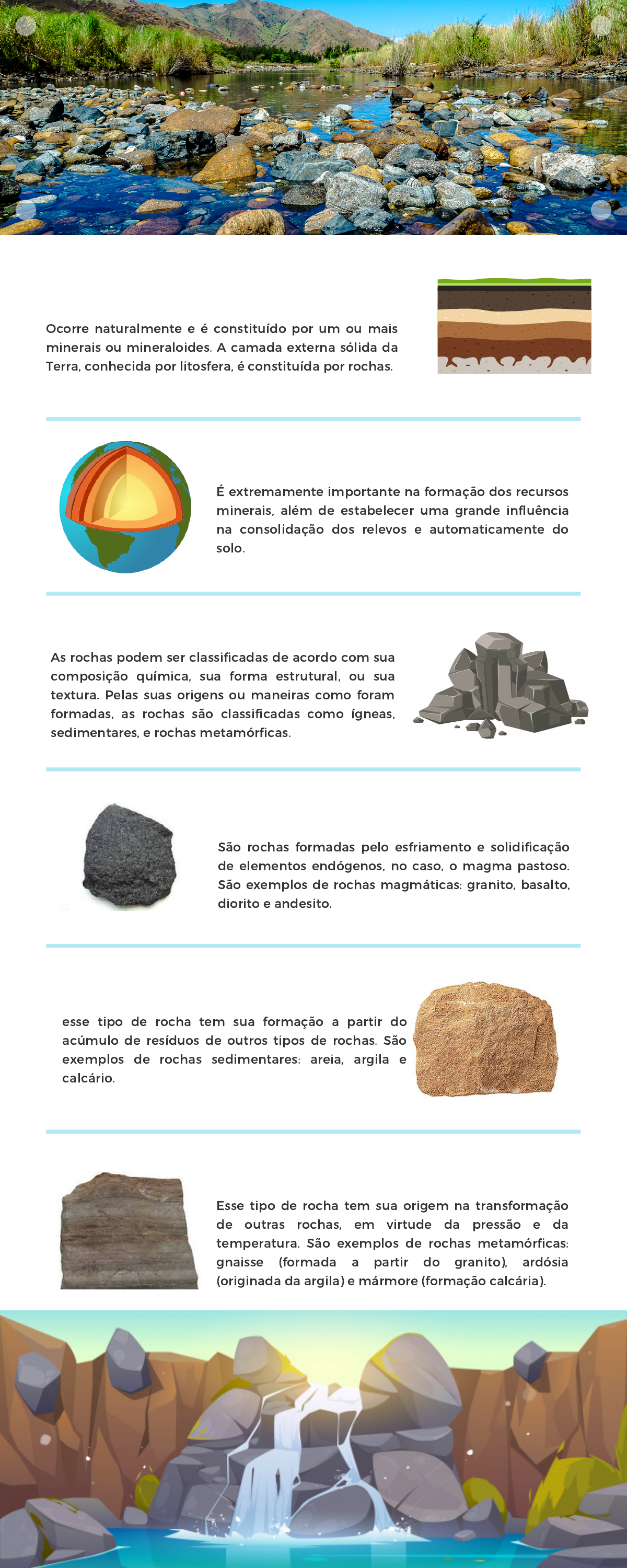 ROCHAS AGREGADO SÓLIDO Ocorre naturalmente e é constituído por um ou mais minerais ou mineraloides. A camada externa sólida da Terra, conhecida por litosfera, é constituída por rochas. ESTRUTURA GEOLÓGICA É extremamente importante na formação dos recursos minerais, além de estabelecer uma grande influência na consolidação dos relevos e automaticamente do solo. CLASSIFICAÇÃO As rochas podem ser classificadas de acordo com sua composição química, sua forma estrutural, ou sua textura. Pelas suas origens ou maneiras como foram formadas, as rochas são classificadas como ígneas, sedimentares, e rochas metamórficas. ÍGNEAS: São rochas formadas pelo esfriamento e solidificação de elementos endógenos, no caso, o magma pastoso. São exemplos de rochas magmáticas: granito, basalto, diorito e andesito. SEDIMENTARES: esse tipo de rocha tem sua formação a partir do acúmulo de resíduos de outros tipos de rochas. São exemplos de rochas sedimentares: areia, argila e calcário. METAMÓRFICAS: Esse tipo de rocha tem sua origem na transformação de outras rochas, em virtude da pressão e da temperatura. São exemplos de rochas metamórficas: gnaisse (formada a partir do granito), ardósia (originada da argila) e mármore (formação calcária).