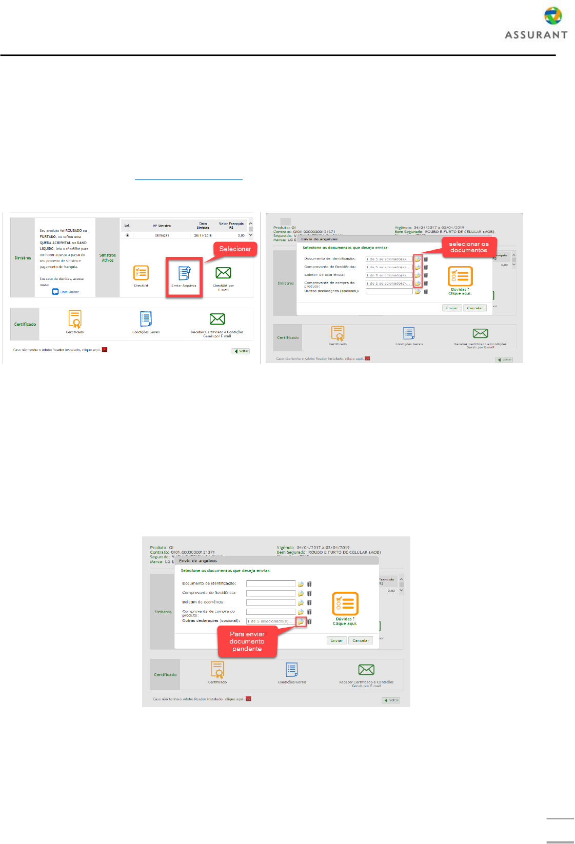 1 VOCÊ ESTÁ RECEBENDO SEU CHECK - LIST DE SINISTRO ROUBO E FURTO Olá, primeiramente gostaríamos de agradecer o seu contato, temos o compromisso com o melhor atendimento para sua proteção e tranquilidade. Apresentamos abaixo o procedimento de atendimento ao seu sinistro. ATENÇÃO, AGILIZE O SEU PROCEDIMENTO: Acesso o portal do segurado meuportalseguro.com.br com seu primeiro nome e CPF e faça o upload dos documentos necessários para sua análise, conforme o passo a passo abaixo: 1º 2º Todos os documentos encaminhados deverão ser digitalizados legíveis e completos (sem cortes). ✓ Arquivos nos formatos: JPEG ou PDF; ✓ Cada campo aceita até 5 arquivos em anexo, exemplo (boletim de ocorrência com mais de 1 página) Não são compatíveis com nosso sistema: ✓ Arquivos armazenados em Nuvem, Ex.: Google drive, OneDrive, Dropbox. OBS: todos os documentos devem ser anexados para habilitar o envio. Caso seja solicitado documento complementar, o mesmo deverá ser enviado através do campo “OUTRAS DECLARAÇÕES”. 2 VOCÊ ESTÁ RECEBENDO SEU CHECK - LIST DE SINISTRO ROUBO E FURTO PROCEDIMENTO POR ETAPAS: 3 VOCÊ ESTÁ RECEBENDO SEU CHECK - LIST DE SINISTRO ROUBO E FURTO ETAPA 01 - Envio dos documentos A) Documento de identificação (Segurado e Vítima) Encaminhar uma das opções listadas abaixo: • RG e CPF; • Carteira Nacional de Habilitação (CNH); • Carteira de Trabalho e previdência Social (CTPS) e CPF; • Passaporte e CPF; • Registro Nacional de Estrangeiro (RNE) e CPF; • Carteira de Ordem (Ex.: OAB, CRM, CREA, etc...) e CPF; B) Comprovante de Residência Encaminhar uma das opções listadas abaixo: • Comprovante de residência em nome do titular do seguro, com data limite de até 90 dias (Ex.: Conta de água, energia, gás, telefonia, cartão de Crédito); • Caso titular do seguro não possua comprovante em seu nome, encaminhar Declaração de Residência com assinatura reconhecida firma em cartório (anexo 2). C) Boletim de Ocorrência • Documento Completo, devidamente carimbado e assinado por autoridade policial (Boletim de ocorrência Online deverá conter a Assinatura digital); • Descrição do produto (Marca, Modelo e IMEI); D) Comprovante do BEM segurado Encaminhar uma das opções listadas abaixo: • Nota fiscal do produto (nacional/internacional), com número de IMEI (Identidade de equipamento móvel internacional); • Cupom Fiscal, com número de IMEI (Identidade de equipamento móvel internacional); • Declaração de compra da loja com assinatura, carimbo do gerente e chave de acesso a nota fiscal eletrônica (DANFE), com número de IMEI (Identidade de equipamento móvel internacional); E) Declaração de IMEI: • Caso segurado não possuir IMEI registrado no Boletim de Ocorrência ou no Comprovante do BEM segurado, encaminhar Declaração de IMEI, devidamente assinada (anexo 3); F) Termo Assurant Encaminhar o Termo Assurant (anexo 1), devidamente assinado e com reconhecimento de firma em cartório, Necessário somente se a vítima for diferente do titular do seguro e/ou da nota fiscal • Titular do seguro diferente da vítima e/ou; • Titular do seguro diferente do titular da nota fiscal. • As assinaturas do titular do seguro e ou titular da nota fiscal devem ser reconhecidas em cartório. 4 VOCÊ ESTÁ RECEBENDO SEU CHECK - LIST DE SINISTRO ROUBO E FURTO ETAPA 2 - Regulação do sinistro Esta é a etapa em que a seguradora realizará a análise dos documentos enviadas por você. Caso algum dos documentos esteja ilegível, incorreto ou faltante iremos enviar um e-mail solicitando o reenvio do documento em questão. Caso a documentação esteja completa e o sinistro seja aprovado, enviaremos um SMS/e-mail solicitando o pagamento da franquia. Em caso de sinistro não aprovado, entraremos em contato para informar o motivo. ETAPA 3 - Franquia Acesse o site meuportalseguro.com.br para baixar o boleto para pagamento da franquia. O boleto fica disponível por 15 dias úteis após a aprovação do sinistro. Após pagamento da franquia, a compensação bancária ocorre em 2 dias úteis. Assim que o pagamento for confirmado, enviaremos um SMS/e-mail informando sobre o início da indenização. ETAPA 4 - Indenização Etapa em que enviaremos o seu novo produto! Nesta etapa você receberá um SMS/e-mail informando sobre o tempo previsto para envio doseu produto. Fique atento, pois nesta etapa você poderá receber ligações com DDD 11 para confirmação de alguns dados. Observações Importantes: A seguradora se reserva no direito de solicitar documentos adicionais, caso se faça necessário no decorrer do processo de análise; Para sua comodidade o bloqueio do seu IMEI será efetuado pela seguradora e ficará inutilizado após o procedimento; Destacamos que todos os dados e documentos solicitados são essenciais para a análise de seu sinistro e o prazo de regulação será iniciado após a recepção da documentação completa; Caso a documentação não seja recepcionada em até 30 dias após a abertura do sinistro, o mesmo será encerrado. Para reativação do mesmo, acesse o CHAT online meuportalseguro.com.br 5 VOCÊ ESTÁ RECEBENDO SEU CHECK - LIST DE SINISTRO ROUBO E FURTO EXEMPLOS DE DECLARAÇÕES (caso seja solicitado) Anexo 1 - TERMO ASSURANT Eu (titular do seguro),____________________________________________ Portador do RG Nº___________________________ CPF Nº _________________________Residente na rua __________________________________________ Declaro que o celular Modelo__________________ IMEI_________________________ Cor___________ adquirido na loja__________________ Na data_______________ Titular da Nota Fiscal___________________________________________ Portador do RG________________________ e CPF______________________ Grau de parentesco______________________ E Beneficiário/Vítima __________________________________ Portador do RG_______________________ e CPF__________________ Grau de parentesco_______________________ por es