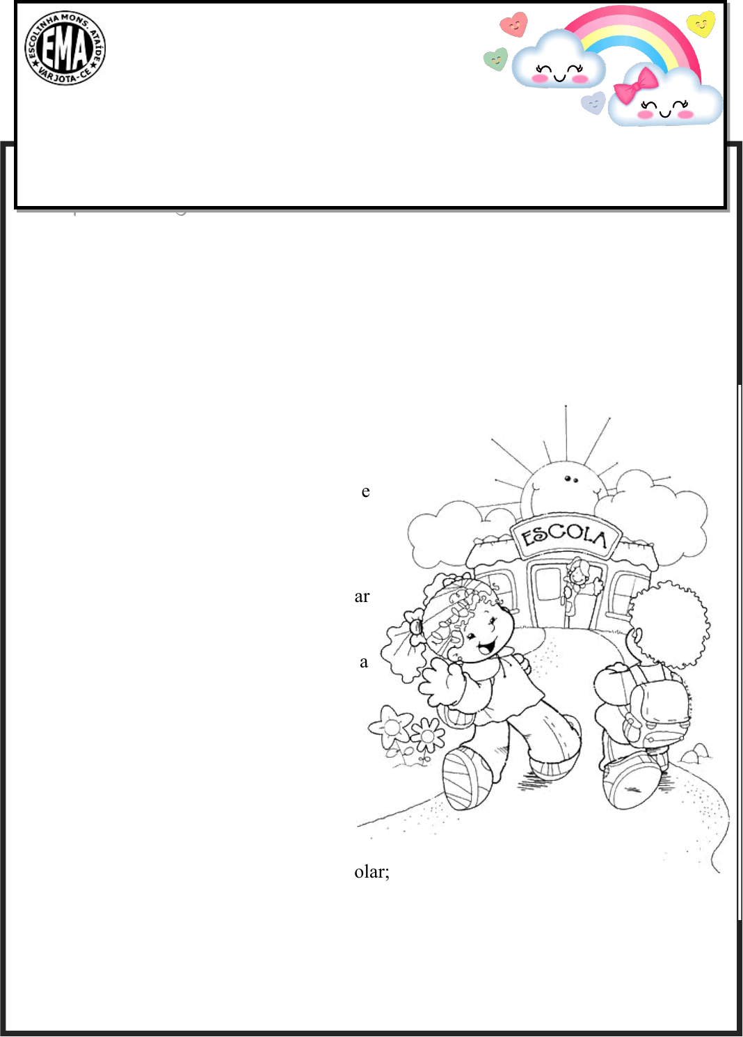 Escolinha Monsenhor Ataíde Aluno(a): ______________________________________________ Tias: Luiza e Taline Assunto: Deveres do Aluno Disciplina: Português 3º Ano Data: ___ /___/___ - Educando para a vida - Ser pontual com suas atividades escolares; Ser pontual nos horários de aula; Fala um de cada vez na sala de aula; Pedir licença quando necessário; Pedir “por favor” ao professor, colegas e funcionários; Agradecer sempre que receber algo; Comportar-se bem na fila, sem empurrar os colegas; Não interromper o professor ou o colega quando estiverem falando; Não apelidar ou insultar os colegas; Respeitar colegas, professores e funcionários; Participar das aulas; Zelar pelo mobiliário e pelo prédio escolar; Zelar pelo material escolar; Comportar-se bem no refeitório; Deveres do Aluno Interpretação do Texto 01. O texto fala de qual assunto? __________________________________________________________________ 02. Você acha que esses deveres são importantes? __________________________________________________________________ __________________________________________________________________ 03. Reescreva no espaço abaixo o dever do aluno que você acha mais importante. 04. Complete: Não interromper o ______________________ ou o ______________________ quando estiverem ________________________; Não apelidar ou insultar os __________________; Respeitar colegas, professores e funcionários; Participar das aulas; Zelar pelo mobiliário e pelo prédio escolar; Zelar pelo __________________________; Comportar-se bem no refeitório. 05. Agora crie um dever que o aluno deve ter em casa. ______________________________________________________________________________________________________________________________________________________________________________________________________ ___________________________________________________________________________________________________________________________________________________________________________________________________________________________________________________