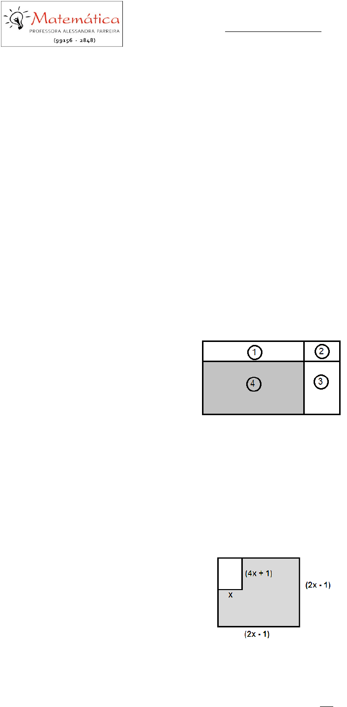 Produtos Notáveis 1) (Saresp) O polinômio 9x² - 25 é equivalente a: a) 3x.(3x -25) b) (3x – 5)(3x – 5) c) (3x + 5)(3x + 5) d) (3x + 5)(3x – 5) 2) Sabe –se que xy = 72 e x² + y² = 306. Qual é o valor de (x + y)²? 3) (Mack – SP) se (x – y)² - (x + y)² = - 20, então xy é igual a: a) – 1 b) 0 c) 10 d) 5 e) 1/5 4) Na figura abaixo, a área do retângulo (1) é ab, a área do quadrado (2) é b², a área do retângulo (3) é bc. Qual é a área do retângulo (4)? a) ac b) a² c) bc d) ab 5) Considere a figura e suas medidas indicadas. Pode-se afirmar que a área colorida é dada pela expressão: a) 4x² - 5 b) – 5x + 1 c) 5x – 1 d) x² - 1 6) Determine o valor de (x - y)² sabendo que x² + y² = 50 e que = 20 e marque a opção correta. a) – 10 b) 40 c) 10 d) - 30 7) Na figura abaixo está indicada a área do quadrado maior (x²) e dos dois retângulos (5x). Determine a área do quadrado colorido. 8) A expressão que representa a situação: “ o quadrado da soma de dois termos, mais 5 unidades” é: a) x + y + 5² b) (x + y + 5)² c) (x + y)² + 5 d) x² + y² + 5 9) A figura abaixo foi subdividida em dois retângulos I e II e dois quadrados, de áreas 81 e x². Qual o valor das áreas dos retângulos I e II? 10) Sabendo que a área do retângulo abaito é 200, determine o valor de n. GABARITO: 1) d 2) 450 3) d 4) a 5) b 6) d 7) 25 8) c 9) 9x 10) 15
