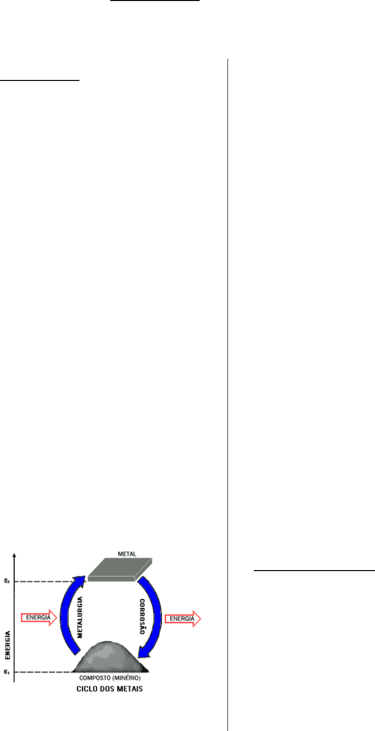 C O R R O S Ã O – UMA ABORDAGEM GERAL ASSOCIAÇÃO BRASILEIRA DE CORROSÃO – ABRACO. Conteúdo: Conceitos - Pilhas - Meios - Reações no Processo - Polarização - Passivação - Velocidade de Corrosão - Formas e Taxas - Tipos - Corrosão Química - Técnicas de Ampliação da Resistência à Corrosão - Inibidores e Revestimentos. 1 - Conceito de Corrosão. A corrosão consiste na deterioração dos materiais pela ação química ou eletroquímica do meio, podendo estar ou não associado a esforços mecânicos. Ao se considerar o emprego de materiais na construção de equipamentos ou instalações é necessário que estes resistam à ação de diferentes meios corrosivo, além de apresentar propriedades mecânicas suficientemente boas e características de fabricação adequadas. A corrosão pode incidir sobre diversos tipos de materiais, sejam metálicos como os aços e ligas de cobre, ou não metálicos, como plásticos, cerâmicas ou concreto. A ênfase aqui descrita será sobre a corrosão dos materiais metálicos, denominada corrosão metálica. Dependendo do tipo de ação do meio corrosivo sobre o material, os processos corrosivos podem ser classificados em dois grandes grupos, abrangendo todos os casos de deterioração por corrosão: Corrosão Eletroquímica e Corrosão Química. Os processos de corrosão eletroquímica são os mais freqüentes na natureza e se caracterizam basicamente por: Necessariamente na presença de água no estado líquido. Temperaturas abaixo do ponto de orvalho da água, sendo a grande maioria na temperatura ambiente. Formação de uma pilha ou célula de corrosão, com a circulação de elétrons na superfície metálica. Em face da necessidade do eletrólito conter água líquida, a corrosão eletroquímica é também denominada corrosão em meio aquoso. Nos processos de corrosão, os metais reagem com substâncias não metálicos presentes no meio, como por exemplo O2, S, H2S, CO2 entre outros, produzindo compostos semelhantes aos encontrados na natureza, dos quais foram extraídos. Dessa forma pode-se interpretar que a corrosão corresponde ao inverso do processo metalúrgico, como ilustrado na Figura 1. Figura 1. Esquema comparativo admitindo o fenômeno corrosivo como um processo inverso ao metalúrgico. Os processos de corrosão química são verificados algumas vezes, no dia-a-dia e em condições ambientais normais, porém, são muito mais freqüentes em ambientes industriais, onde se tem condições bastante diversas, devido a isso ela é por vezes, denominados corrosão ou oxidação em altas temperaturas. Estes processos são menos freqüentes na natureza, envolvendo operações onde as temperaturas são elevadas. Tais processos corrosivos se caracterizam basicamente por: Ausência da água líquida. Temperaturas, em geral, elevadas, sempre acima do ponto de orvalho da água. Interação direta entre o metal e o meio corrosivo. Como na corrosão química não se necessita de água líquida, ela também é denominada em meio não aquoso ou corrosão seca. Existem processos de deterioração de materiais que ocorrem durante a sua vida em serviço, que não se enquadram na definição de corrosão. Um deles é o desgaste devido à erosão, que remove mecanicamente partículas do material. Embora esta perda de material seja gradual e decorrente da ação do meio, tem-se um processo eminentemente físico e não químico ou eletroquímico. Pode ocorrer em certos casos, ação simultânea da corrosão, constituindo o fenômeno da corrosão-erosão. Outro tipo de alteração no material que ocorre em serviço, são as transformações metalúrgicas que podem acontecer em alguns materiais, particularmente em serviço com temperaturas elevadas. Em função destas transformações as propriedades mecânicas podem sofrer grandes variações, por exemplo apresentando excessiva fragilidade na temperatura ambiente. A alteração na estrutura metalúrgica em si não é corrosão embora possa modificar profundamente a resistência à corrosão do material, tornando-o, por exemplo, susceptível à corrosão intergranular. Durante o serviço em alta temperatura pode ocorrer também o fenômeno da fluência, que é uma deformação plástica do material crescente ao longo do tempo, em função da tensão atuante e da temperatura. 2 - Pilhas de Corrosão Eletroquímica. A pilha de corrosão eletroquímica é constituída de quatro elementos fundamentais: área anódica: superfície onde verifica-se a corrosão (reações de oxidação). área catódica: superfície protegida onde não há corrosão (reações de redução); eletrólito: solução condutora ou condutor iônico que envolve simultaneamente as áreas anódicas e catódicas; ligação elétrica entre as áreas anódicas e catódicas. 2 A Figura 2 mostra esquematicamente uma pilha de corrosão eletroquímica. Figura 2. Esquema de uma pilha eletroquímica, destacando os quatro elementos fundamentais. O aparecimento das pilhas de corrosão é conseqüência de potenciais de eletrodos diferentes, em dois pontos da superfície metálica, com a devida diferença de potencial entre eles. Um conceito importante aplicável às pilhas de corrosão é o da reação de oxidação e redução. As reações da corrosão eletroquímica envolvem sempre reações de oxi- redução. Na área anódica onde se processa a corrosão ocorrem reações de oxidação, sendo a principal a de passagem do metal da forma reduzida para a forma oxidada. Figura 3. Esquema de um metal atuando como ânodo. Na área catódica, que é uma área protegida (não ocorre corrosão), ocorrem reações de redução de substâncias do meio corrosivo, como exemplificado a seguir. Em meios aerados (oxigenados) - caso normal de água do mar e naturais: H2O + 1/2 O2 + 2e- 2 OH- Em meios desaerados - caso comum em águas doces industriais: 2 H2O + 2e- H2 + 2 OH- Serão discutidas a seguir as principais causas de aparecimento de pilhas de 