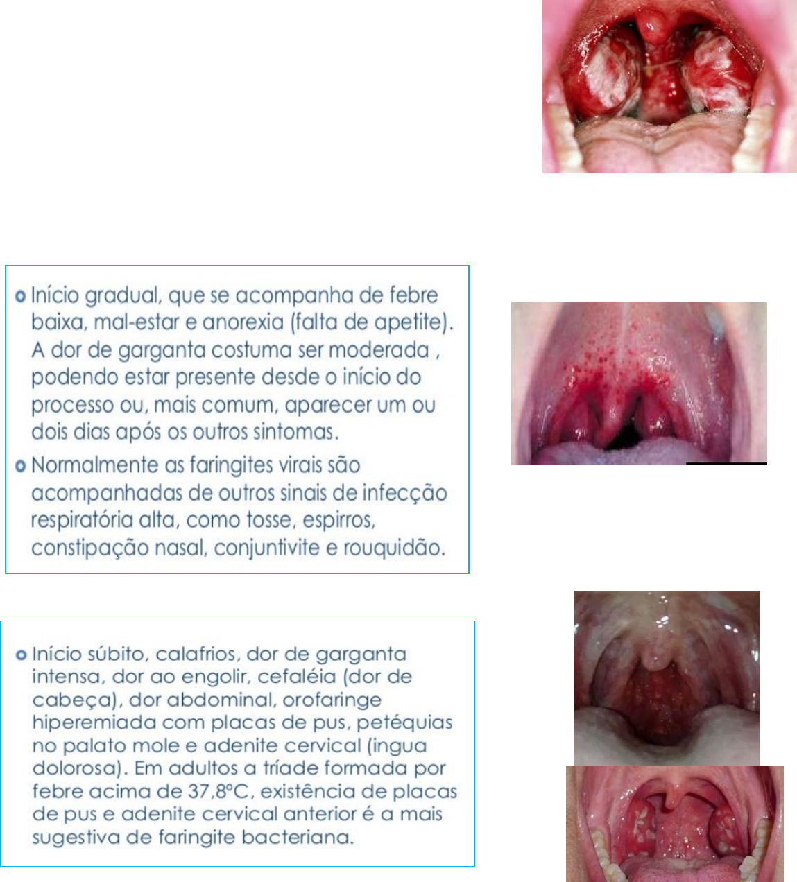 Gabriela de Godoy 2020 1 DOENÇAS MICROBIANAS DO SISTEMA RESPIRATÓRIO 1) FARINGITE São infecções/ inflamação, de origem viral ou bacteriana, que afeta toda a parede posterior da orofaringe. Em geral, o quadro afeta toda a orofaringe, denominando-se faringoamigdalite. Frequentemente afeta a mucosa do palato. Normalmente causada por vírus, mas também pode ser decorrente de bactérias. a) FARINGITE VIRAL b) FARINGITE BACTERIANA Gabriela de Godoy 2020 2 DIFERENÇAS ENTRE FARINGITE VIRAL E FARINGITE BACTERIANA EPIDEMIOLOGIA Pico de incidência: 5 e 15 anos Incomum em < 3 anos Portadores assintomáticos: 12% --> 5-18 anos 4% --> < 5 anos Padrão sazonal: maior frequência no final do outono, inverno e início primavera. ETIOLOGIA: BACTÉRIAS Streptococcus pyogenes, β-hemolítico do grupo A (é o principal agente). Enterococcus spp Streptococcus dysgalacitae SINTOMAS VIRAL BACTERIANA INÍCIO Gradual Súbito ADENITE CERVICAL Incomum Frequente-Doloroso FEBRE Frequente Frequente ANOREXIA Perda de apetite Dor ao engolir DOR DE GARGANTA Moderada Forte “PLACAS DE PUS” Pode ser encontrada Frequente DOR ABDOMINAL Não usual Frequente TOSSE Não usual Não usual CORIZA Frequente Não usual CONJUNTIVITE Frequente Não usual ROUQUIDÃO Frequente Não usual CALAFRIOS Não usual Frequente Mycoplasma pneumoniae Gabriela de Godoy 2020 3 Staphylococcus aureus Moraxela catharrhalis gram - Mycoplasma pneumoniae Fusobacterium necrophorum (-) Neisseria gonorrhoeae Corynebacterium diphtheria (+) ETIOLOGIA: VÍRUS Epstein-Barr vírus Adenovírus Rinovírus Influenza Parainfluenza Coronavírus Coxsackievírus (nesses casos, é comum observar a presença de aftas no palato. Curiosamente, a febre aftosa do gado bovino é transmitida por Coxsackievírus). COMPLICAÇÕES Moraxela catharrhalis Fusobacterium necrophorum Corynebacterium diphtheriae Gabriela de Godoy 2020 4 DIAGNÓSTICO DIAGNÓSTICO - SWAB Coleta do material com boa visualização da orofaringe. Swab vigoroso de ambas amígdalas e parede posterior da orofaringe. O swab não deve tocar a língua ou mucosa oral na entrada e saída da boca. 2) MONONUCLEOSE A mononucleose infecciosa, também conhecida como doença do beijo É uma doença contagiosa causada por um vírus da família do Herpes, chamado vírus Epstein-Barr (EBV), que é transmitido pela da saliva. TRANSMISSÃO O vírus Epstein-Barr é transmitido de humano para humano através da saliva. Por este motivo ganhou a alcunha de “doença do beijo”. A mononucleose também pode ser transmitida pela da tosse, espirro, objetos, como copos e talheres, ou qualquer outro modo no qual haja contato com a saliva de uma pessoa contaminada. Gabriela de Godoy 2020 5 Um indivíduo infectado pelo Epstein-Barr costuma manter-se com o vírus na sua orofaringe, em média, por 6 meses após a resolução dos sintomas, podendo contaminar pessoas com quem mantenha algum contato íntimo, principalmente se prolongado. Saliva, transfusão sanguínea no outro órgão, mucosa da boca mucosa da garganta. Obs. A mononucleose não é uma doença sexualmente transmissível. SINTOMAS Aumento do baço, chamado de esplenomegalia. Quando ocorre, é necessário manter repouso, devido ao risco de ruptura do mesmo. O acometimento do fígado não é incomum, podendo levar a um quadro de hepatite com icterícia em até 20% dos casos. Outras complicações descritas, porém, menos comuns, são a síndrome de Guillain-Barré e a paralisia facial. DIFERENÇAS ENTRE MONONUCLEOSE E FARINGITES BACTERIANAS Em geral, as faringites ou amigdalites provocadas pelo EBV não causam pus nas amígdalas. Esse sinal costuma ser típico das amigdalites bacterianas Gabriela de Godoy 2020 6 DIAGNÓSTICO quadro clínico e é confirmado por análises de sangue. No hemograma da mononucleose um achado típico é o aumento do número de leucócitos (leucocitose), causado pela maior produção de linfócitos (linfocitose). Quando o fígado é acometido, pode haver elevação das enzimas hepáticas, chamadas de TGO e TGP. Diagnóstico definitivo, porém, é feito através da sorologia, com a pesquisa de anticorpos. O mais comum e simples é um exame chamado monoteste. 3) PNEUMONIA A pneumonia infecciosa define-se como uma condensação inflamatória aguda dos alvéolos e/ou infiltração do tecido intersticial pulmonar que resulta da ação de células inflamatórias em resposta à agressão de um determinado agente microbiano. Comum na infância Motivo frequente de ida aos serviços de urgência, a maioria não necessita de internamento e devem ser orientadas no ambulatório Em pediatria a etiologia viral é a mais frequente (80 - 85%) A utilização de antibióticos deve ser criteriosa (o uso indiscriminado agrava as resistências aos antimicrobianos) e só está indicada na suspeita de infecção bacteriana FISIOPATOLOGIA Alguns pacientes com mononucleose podem desenvolver uma amigdalite purulenta, muitas vezes com um aspecto que parece um manto de pus recobrindo as amígdalas Nesses casos, é difícil distinguir sem exames complementares se a origem da amigdalite é bacteriana ou é mononucleose. Gabriela de Godoy 2020 7 CLASSIFICACÃO AGENTES ETIOLÓGICOS Bacterianas: → Streptococcus pneumoniae → Staphylococcus aureus → Klebsiella pneumoniae → Haemophylus influenzae → Legionella → Chlamydia → Mycobacterium → Actynomices → Rickettsias Virais: → Influenza → Parainfluenza → Vírus Sincicial Respiratório (VSR) Gabriela de Godoy 2020 8 → Adenovírus → Citomegalovírus (CMV) → Coronavírus → Hantavírus Fúngicas → Paracoccidioides brasiliensis → Histoplasma capsulatum → Coccidioides immitis → Cryptococcus neoformans → Candida albicans → Aspergillus spp → Pneumocystis spp → Fechifomicetos spp PNEUMONIAS BACTERIANAS AGUDAS Adulto imunocompetente Origem na comunidade a) PNEUMONIAS AGUDAS Patógenos mais comuns Ambulatorial (quadros leves): → Streptococcus pneumoniae → Mycoplasma pneumoniae → Chlamydia