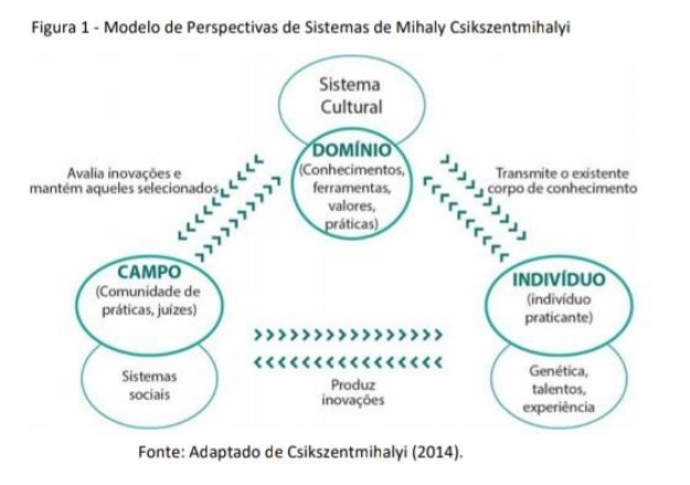 A Perspectiva de Sistemas – Csikszentmihalyi Csikszentmihalyi defende a ideia que é preciso foca os estudos da criatividade nos sistemas sociais e não apenas no indivíduo. E que o mais importante sobre criatividade e saber onde se encontra, em que ambiente social, cultura e histórico reconhece. Mihaly Csikszentmihalyi, busca encontra característica, faz com que o indivíduo seja criativo em suas pesquisas, buscava saber as personalidades, valores e capacidade de resolver problemas. Ele define criatividade por três elementos ou fatores: Individuo, domínio e campo. Indivíduo= O indivíduo produz e introduz mudanças na sua área de conhecimento. Ele e criativo tem várias características, dentre elas são, curiosidade, entusiasmados, motivados, abertos a novas experiencias, persistentes, fluentes nas ideias e flexibilidade nos pensamentos. E preciso está em um ambiente que estima criatividade, valorize a aprendizagem, tenha oportunidades, acesso a livros e computadores. Domínio= O domínio está relacionado as regras, procedimentos, e símbolos estabelecidos por uma ou várias sociedades. Domínio está relacionada a uma área de conhecimento. Exemplo: Matemática, musica química. Uma resposta criativa ocorre quando a pessoa tem acesso à informação e assim o domínio da área de conhecimento se torna mais clara, relevante e aprofundado para um maior engajamento. Campo= O campo e o responsável de relacionar o material a ser reconhecido como criativo. Pessoas com conhecimento em uma área especifica com experiencias, ficam responsável de saber o que por dizer o que e ou não criativo. Uma ideia pode não ser aceita se o campo for rígido, defensivo e não encoraja a criatividade.