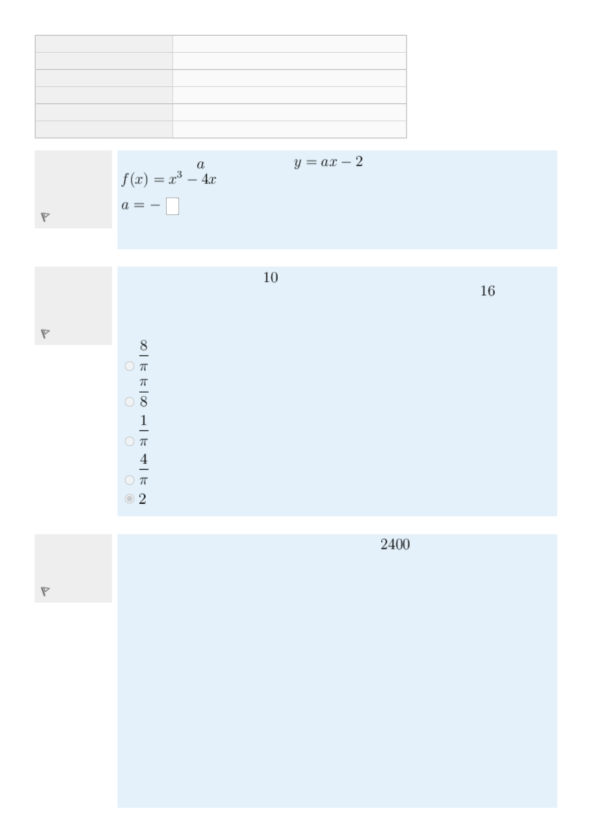 26/06/2020 Q3-2 - Questionário desafio (não avaliativo) https://ava.ead.ufscar.br/mod/quiz/review.php?attempt=196762&showall=1 1/4 Questão 1 Completo Atingiu 1,00 de 1,00 Marcar questão Questão 2 Completo Atingiu 0,00 de 1,00 Marcar questão Questão 3 Não respondido Vale 1,00 ponto(s). Marcar questão Iniciado em sexta, 26 junho 2020, 18:37 Estado Finalizadas Completado em sexta, 26 junho 2020, 18:39 Tempo empregado 1 minuto 26 segundos Notas 5,00/8,00 Avaliar 62,50 de um máximo de 100,00 Qual é o valor de em que torna a reta seja tangente ao gráfico de ? 1 ATENÇÃO: preencha as caixas de respostas com um número inteiro. Uma roda-gigante com raio de m está girando a uma taxa de uma revolução a cada dois minutos. Quão rápido um passageiro estará subindo quando seu assento estiver m acima do nível do solo? Escolha uma: m/rad m/rad m/rad m/rad m/rad m/rad A fábrica de parafusos "Girando São Carlos" gostaria com centímetros quadrados de folhas de madeira, construir uma caixa com tampa para alocar os parafusos de sua fabricação. A base precisa ser retangular com um lado sendo o dobro do outro. Para alocar o máximo possível de parafusos, a fábrica gostaria que a caixa tivesse o volume máximo. https://ava.ead.ufscar.br/filter/tex/displaytex.php?texexp=a https://ava.ead.ufscar.br/filter/tex/displaytex.php?texexp=y%3Dax-2 https://ava.ead.ufscar.br/filter/tex/displaytex.php?texexp=f%28x%29%3Dx%5E3-4x https://ava.ead.ufscar.br/filter/tex/displaytex.php?texexp=a%3D- https://ava.ead.ufscar.br/filter/tex/displaytex.php?texexp=10 https://ava.ead.ufscar.br/filter/tex/displaytex.php?texexp=16 https://ava.ead.ufscar.br/filter/tex/displaytex.php?texexp=%5Cdfrac%7B8%7D%7B%5Cpi%7D https://ava.ead.ufscar.br/filter/tex/displaytex.php?texexp=%5Cdfrac%7B%5Cpi%7D%7B8%7D https://ava.ead.ufscar.br/filter/tex/displaytex.php?texexp=%5Cdfrac%7B1%7D%7B%5Cpi%7D https://ava.ead.ufscar.br/filter/tex/displaytex.php?texexp=%5Cdfrac%7B4%7D%7B%5Cpi%7D https://ava.ead.ufscar.br/filter/tex/displaytex.php?texexp=2 https://ava.ead.ufscar.br/filter/tex/displaytex.php?texexp=2400 26/06/2020 Q3-2 - Questionário desafio (não avaliativo) https://ava.ead.ufscar.br/mod/quiz/review.php?attempt=196762&showall=1 2/4 Questão 4 Completo Atingiu 0,00 de 1,00 Marcar questão Figura: caixa sem tampa. Baseado no problema da "Girando São Carlos", (a) Usando que , a relação obtida entre e é dada por . (b) O volume em função de é dada por . (c) A derivada da função em relação em é dada por . (d) As dimensões , e que proporcionam a caixa que maximiza o volume são dadas por , e . ATENÇÃO: Em cada caixa digite como resposta um número inteiro. Quando for uma fração, deve representá-la na forma irredutível. Encontre todos os pontos sobre a curva onde a inclinação da reta tangente é . Escolha uma: e e e e e https://ava.ead.ufscar.br/filter/tex/displaytex.php?texexp=x%3D2y https://ava.ead.ufscar.br/filter/tex/displaytex.php?texexp=y https://ava.ead.ufscar.br/filter/tex/displaytex.php?texexp=z https://ava.ead.ufscar.br/filter/tex/displaytex.php?texexp=y%5E2%2B https://ava.ead.ufscar.br/filter/tex/displaytex.php?texexp=yz%3D1200 https://ava.ead.ufscar.br/filter/tex/displaytex.php?texexp=V%28y%29 https://ava.ead.ufscar.br/filter/tex/displaytex.php?texexp=y https://ava.ead.ufscar.br/filter/tex/displaytex.php?texexp=V%28y%29%3D- https://ava.ead.ufscar.br/filter/tex/displaytex.php?texexp=%5Cleft%20.%5Cright%20%28 https://ava.ead.ufscar.br/filter/tex/displaytex.php?texexp=%2F https://ava.ead.ufscar.br/filter/tex/displaytex.php?texexp=%5Cleft%20.%5Cright%29y%5E2%2B https://ava.ead.ufscar.br/filter/tex/displaytex.php?texexp=y https://ava.ead.ufscar.br/filter/tex/displaytex.php?texexp=V%28y%29 https://ava.ead.ufscar.br/filter/tex/displaytex.php?texexp=y https://ava.ead.ufscar.br/filter/tex/displaytex.php?texexp=V%27%28y%29%3D- https://ava.ead.ufscar.br/filter/tex/displaytex.php?texexp=y%5E2%2B https://ava.ead.ufscar.br/filter/tex/displaytex.php?texexp=x https://ava.ead.ufscar.br/filter/tex/displaytex.php?texexp=y https://ava.ead.ufscar.br/filter/tex/displaytex.php?texexp=z https://ava.ead.ufscar.br/filter/tex/displaytex.php?texexp=x%3D https://ava.ead.ufscar.br/filter/tex/displaytex.php?texexp=%5Csqrt%7B2%7D https://ava.ead.ufscar.br/filter/tex/displaytex.php?texexp=y%3D https://ava.ead.ufscar.br/filter/tex/displaytex.php?texexp=%5Csqrt%7B2%7D https://ava.ead.ufscar.br/filter/tex/displaytex.php?texexp=z%3D https://ava.ead.ufscar.br/filter/tex/displaytex.php?texexp=%5Cleft%20.%5Cright%20%28 https://ava.ead.ufscar.br/filter/tex/displaytex.php?texexp=%5Cdisplaystyle%20%2F https://ava.ead.ufscar.br/filter/tex/displaytex.php?texexp=%5Cleft%20.%5Cright%20%29 https://ava.ead.ufscar.br/filter/tex/displaytex.php?texexp=%5Csqrt%7B2%7D https://ava.ead.ufscar.br/filter/tex/displaytex.php?texexp=x%5E2y%5E2%2Bxy%3D2 https://ava.ead.ufscar.br/filter/tex/displaytex.php?texexp=-1 https://ava.ead.ufscar.br/filter/tex/displaytex.php?texexp=%28-1%2C-1%29 https://ava.ead.ufscar.br/filter/tex/displaytex.php?texexp=%281%2C1%29 https://ava.ead.ufscar.br/filter/tex/displaytex.php?texexp=%28-2%2C-1%29 https://ava.ead.ufscar.br/filter/tex/displaytex.php?texexp=%28-2%2C-%5Cfrac%7B1%7D%7B2%7D%29 https://ava.ead.ufscar.br/filter/tex/displaytex.php?texexp=%281%2C0%29 https://ava.ead.ufscar.br/filter/tex/displaytex.php?texexp=%280%2C1%29 https://ava.ead.ufscar.br/filter/tex/displaytex.php?texexp=%28-1%2C1%29 https://ava.ead.ufscar.br/filter/tex/displaytex.php?texexp=%281%2C-1%29 https://ava.ead.ufscar.br/filter/tex/displaytex.php?texexp=%282%2C-1%29 https://ava.ead.ufscar.br/filter/tex/displaytex.php?texexp=%282%2C-%5Cfrac%7B1%7D%7B2%7D%29 26/06/2020 Q3-2 - Questionário desafio (não avaliativo) https://ava.ead.ufscar.br/mod/quiz/review.php?attempt=196762&showall=1 3/4 Questão 5 Completo Atingiu 1,00 de 1,00 Marcar questão Questão 6 Completo Atingiu 1,00 de 1,00 Marcar questão Questão 7 Completo Atingiu 1,00 de 1,00 Marcar questão A po