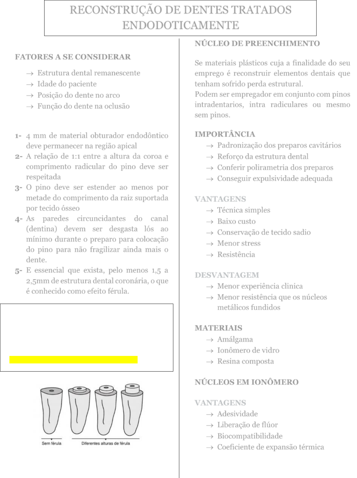 FATORES A SE CONSIDERAR → Estrutura dental remanescente → Idade do paciente → Posição do dente no arco → Função do dente na oclusão 1- 4 mm de material obturador endodôntico deve permanecer na região apical 2- A relação de 1:1 entre a altura da coroa e comprimento radicular do pino deve ser respeitada 3- O pino deve ser estender ao menos por metade do comprimento da raiz suportada por tecido ósseo 4- As paredes circuncidantes do canal (dentina) devem ser desgasta lós ao mínimo durante o preparo para colocação do pino para não fragilizar ainda mais o dente. 5- E essencial que exista, pelo menos 1,5 a 2,5mm de estrutura dental coronária, o que é conhecido como efeito férula. NÚCLEO DE PREENCHIMENTO Se materiais plásticos cuja a finalidade do seu emprego é reconstruir elementos dentais que tenham sofrido perda estrutural. Podem ser empregador em conjunto com pinos intradentarios, intra radiculares ou mesmo sem pinos. IMPORTÂNCIA → Padronização dos preparos cavitários → Reforço da estrutura dental → Conferir polirametria dos preparos → Conseguir expulsividade adequada VANTAGENS → Técnica simples → Baixo custo → Conservação de tecido sadio → Menor stress → Resistência DESVANTAGEM → Menor experiência clinica → Menor resistência que os núcleos metálicos fundidos MATERIAIS → Amálgama → Ionômero de vidro → Resina composta NÚCLEOS EM IONÔMERO VANTAGENS → Adesividade → Liberação de flúor → Biocompatibilidade → Coeficiente de expansão térmica RECONSTRUÇÃO DE DENTES TRATADOS ENDODOTICAMENTE A férula pode ser definida como um colar coronário de 360º que circunda as paredes axiais (paralelas) da dentina que se estende coronal ao ombro do preparo em uma altura média de 1,5 a 2mm de estrutura remanescente do dente após o preparo e tem o papel de melhorar a resistência do conjunto pino coroa (Mamoun, 2014) essa informação é de suma importância para o diagnóstico e planejamento em reabilitação oral. DESVANTAGEM → Baixa resistência a tração → Técnica de inserção mais complicada NÚCLEO EM COMPÓSITO VANTAGENS → Fácil manipulação → Boa estética → Resistência → Adesividade → Rápida polimerização DESVANTAGEM Contração de polimerização Instabilidade dimensional Infiltração marginal Menor resistência que núcleos metálicos PINOS → Pinos intra radiculares → Fundidos → Pré fabricados → Não metálicos INDICAÇÃO → Dentes tratados endodoticamente que perderam grande parte da estrutura coronária sadia → Dentes anteriores – Grande abertura endodôntica → - Extensa destruição coronária → - Dente que sofre forças horizontais, de Cisalhamento ou compressão intensas o Atuação das cargas nos dentes CARACTERÍSTICAS IDEIAS → Ser de fácil uso → - Preservar dentina radicular → - Evitar tensões demasiadas à raiz → - Prover união química/mecânica com o material restaurador e/ou de preenchimento → - Ser resistente à corrosão - Ser estético → - Possuir boa relação custo-benefício FUNÇÕES DOS PINOS → Retenção do material de preenchimento → Distribuir partes das tensões recebidas pela coroa a raiz O retentor intra radicular é simplesmente um transmissor de força e não um ponto de resistência. Os pontos de resistência são o dente o ligamento periodontal e abraçamento do osso alveolar. Se houver estrutura dental remanescente suficiente para reter a restauração não necessidade de pino intra radicular! O preparo de um canal radicular para receber um pino enfraquece seriamente a raiz, o que não recompensado pela sua cimentação. RISCOS NO PREPARO CANAL: → Perfurações radiculares → Adelgaçamento das paredes → Perda de orientação do canal SUCESSO DO PINO DEPENDE → Comprimento → Profundidade → Material → Formato → Configuração superficial O fator mais importante para o sucesso é a estrutura dental remanescente, portanto recomenda se a utilização dos pinos mais finos possíveis com adequada resistência PINOS DE AÇO INOXIDÁVEL → Alta rigidez → Alto modulo de elasticidade → Não estético → Não adesivo → Baixo custo → Técnica de cimentação simples PINOS DE TITÂNIO → Alto módulos de elasticidade → Custo mais elevado que o de aço → Não estético → Não adesivo → Técnica de cimentação simples PINOS NÃO METÁLICOS → Pinos de fibras de carbono → Pinos de fibras de vidro → Pinos de fibras de quartzo → Pinos de dióxido de carbono VANTAGENS → Adesão → Biocompatibilidade e estáveis → Resistentes a fadiga e a corrosão → Conservação de estrutura dental sadia → Melhoram a integridade do remanescente → Modulo de elasticidade com os materiais restauradores preenchimento. PINOS DE FIBRA DE CARBONO → Não estético → Adesão a estrutura dentinaria e material de preenchimento → Técnica de cimentação mais complexa → Radiolucido → Pouca experiência clinica PINOS DE FIBRA DE VIDRO → Estético → Anisotrópico → Menos resistência que os pinos de fibras de carbono → Adesão a estrutura dentária e material de preenchimento → Radiolúcido Pinos curtos tem menor retenção e ainda podem provocar fratura no terço cervical ou médio das raízes. CONCEITOS Braço de potência → Porção do núcleo (ou pino) acima da crista óssea alveolar onde são geradas as forças oclusais Braço de resistência → Porção do núcleo (pino) envolta por osso, para onde são transmitidos os esforços mastigatórios O braço de resistência deve ser no mínimo igual ao braço de potência. TÉCNICA 1- Seleção do caso 2- Avalição radiográfica 3- Isolamento absoluto 4- Remoção da carie e restaurações 5- Seleção do pino 6- Desobturação parcial do conduto 7- Preparo propriamente do conduto (broca própria do sistema de pino) 8- Cimentação 9- Inserção do material restaurador (núcleo de preenchimento) CIMENTOS RESINOSOS – AUTOADESIVOS Materiais hí