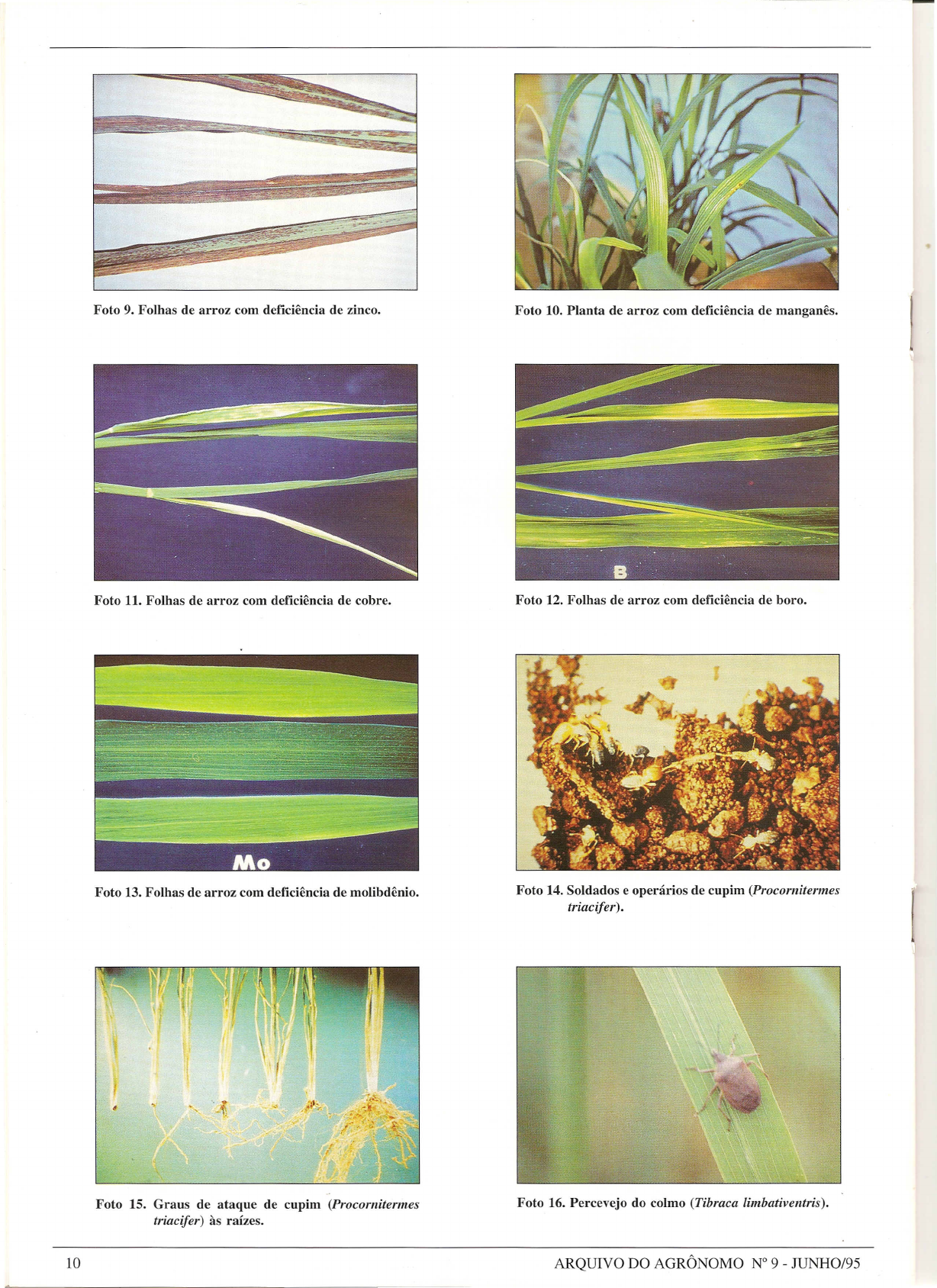 Foto 14. Soldados e openirios de cupim (Procornitermes triacifer). Foto 15. Graus de ataque de cupim (Procornitermes triacifer) as rafzes. Foto 18. Percevejos das paniculas: 3 esquerda, Oebalus poecilus; ao centro, Oeballls ypsilongrisells; 3 direita, Oebalus grisescens. Foto 17. "Cora~aomorto" e "panicula branca" causados pelo percevejo do colmo (Tibraca limbativentris). ', ' , . ! Foto 20. Cigarrinhas das pastagens. Da esquerda para a direita: Deoisflexllosa, D. schach, D.flavopicta, D. incompleta e Zlllia entreriana. Foto 19. Graos vazios (3 esquerda) e atrofiados (ao cen- tro), devido ao ataque de Oeballls poecillls, e graos normais (3 direita). Foto 21. Plantas jovens de arroz mortas pela cigarrinha das pastagens (Deois flavopicta). Foto 24. Adultos e lagarta da broca do colo (Elasmopalpus lignoselllls ). Foto 25. Colmos atacados pel a broca do colo (Elasmo- palpus lignosellus). Foto 27. Lagarta ou broca do colmo (Diatraea saccharalis) no interior do colmo de arroz. Foto 28. Cascudos pretos. A esquerda, Stenocrates sp.; ao centro, Dyscinetus dub ius e it direita, Euetheola humilis. Foto 29. Larva do cascudo preto ou bicho bolo (Euetheola humilis). Foto 31. Larva de gorgulho aqulitico ou bucheira da raiz do arroz (Oryzophagus oryzae). Foto 33. Rea<;ao resistente de brusone Foto 34. Brusone nos nos dos colmos. nas folhas. Foto 37. Lesoes tipicas de brusone nas plantulas, transmitidas por sementes infestadas.
