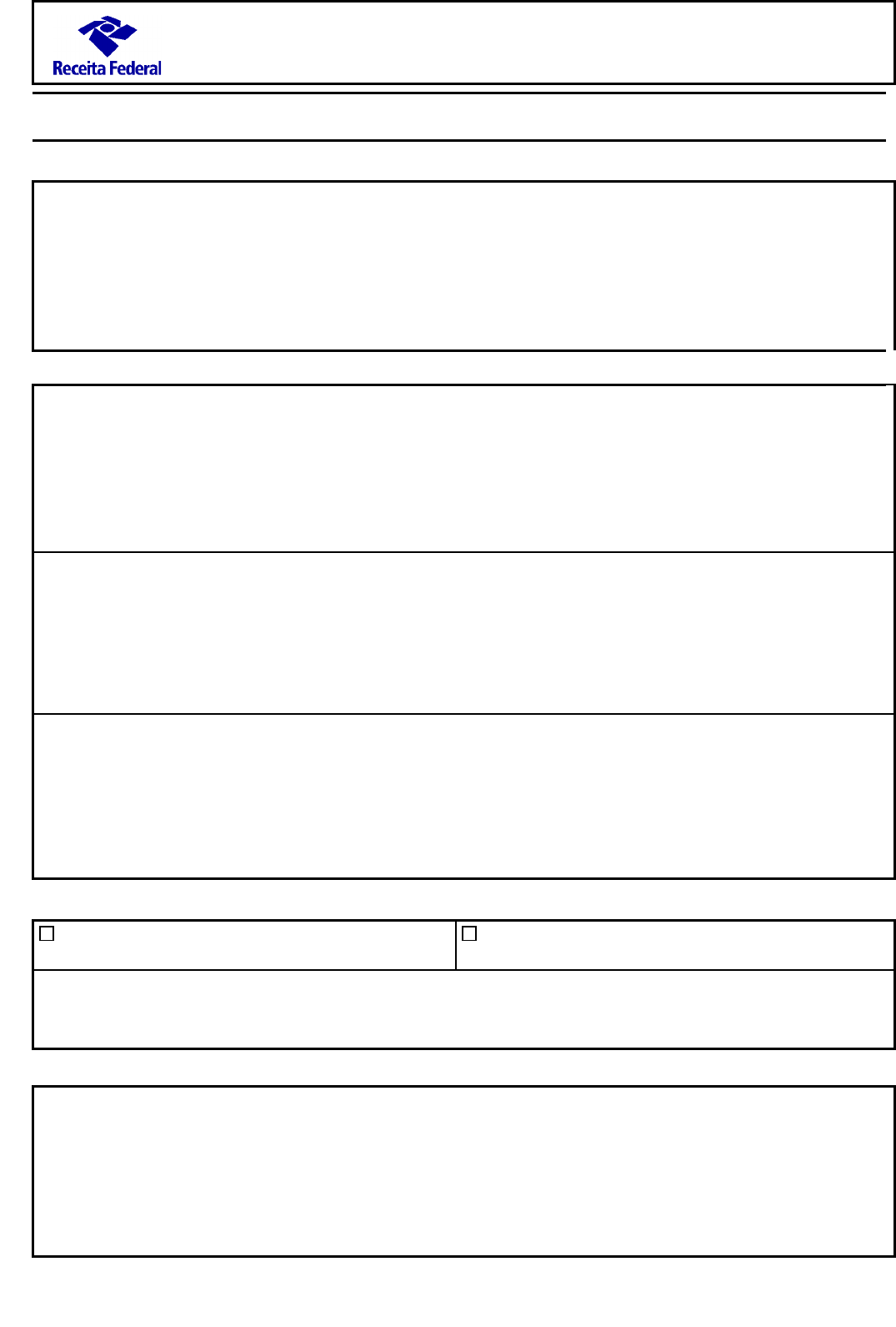 Ministério da Fazenda Secretaria da Receita Federal do Brasil Formulário para Solicitação de Mercadorias Apreendidas (Anexo I da Norma de Execução Copol nº 1/2011) SOLICITANTE Órgão/Entidade: CNPJ: Endereço: Cidade/Estado: Telefone: ( ) CEP: E-mail (se houver): PEDIDO (utilizar verso se necessário) Quantidade e Descrição/Caracterização: Justificativa/Motivação: Finalidade/Destinação das Mercadorias: IDENTIFICAÇÃO DO SOLICITANTE Titular ou Representante Legal (anexar documentos comprobatórios e de identificação com foto e assinatura) Delegatário ou Preposto (anexar documento delegatório de competência específica ou procuração com poderes específicos e de identificação com foto e assinatura) Eu, ________________________________________________________, cargo/função, ________________________________________ portador do CPF ______________________, declaro sob as penas da Lei, em especial dos arts. 171 e 307 do Código Penal, ter legitimidade para solicitar e receber doação de bens, nos termos dos regramentos, estatutos ou regimentos desta instituição ASSINATURA DO SOLICITANTE Local, Data e Assinatura do Titular / Representante Legal ou Delegatário / Preposto: Ministério da Fazenda Formulário para Solicitação de Mercadorias Apreendidas (Anexo I da Norma de Execução Copol nº 1/2011) SOLICITANTE PEDIDO (utilizar verso se necessário) IDENTIFICAÇÃO DO SOLICITANTE ASSINATURA DO SOLICITANTE CheckBox: Off CheckBox1: Off