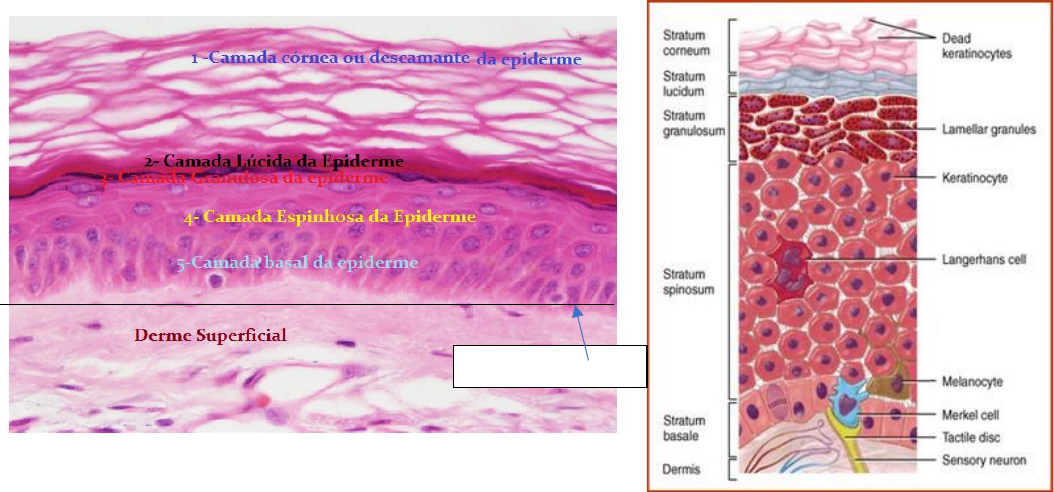 Larissa Leslye - TXIX DERMATOPATOLOGIA Pele: - Epiderme: epitélio estratificado pavimentoso queratinizado - Derme: tecido conjuntivo frouxo e não modelado - Hipoderme: tecido adipososo unilocular Pele fina x pele grossa: vai ter diferenças, mas hoje vamos lidar com pele fina Camada basal: células que tem grande capacidade de proliferação e diferenciação (indo para próxima camada), sofrem mitoses (não estão em senescência) → Próximo a camada basal observamos melanócitos: produtoras de melanina; ela transfere esses grânulos de melanina para a próxima camada de células. DAS CÉLULAS BASAIS PARA CIMA, ESSAS CÉLULAS SOFREM PROCESSOS DE DIFERENCIAÇÃO SE TRANSFORMANDO EM QUERATINÓCITOS Camada Espinhosa Camada Granulosa Obs: Se fosse pele grossa acrescentaríamos a camada lúcida, mas como é pele fina já vai para a última camada Obs: os queratinócitos armazenam os grânulos de melanina, e com o tempo os seus lisossomos digerem essa melanina, e ativam genes que vão aumentar a produção de queratina dentro de seu citoplasma, então eles passam a perde todas as suas organelas e ficar apenas com queratina: membrana plasmática e queratina dentro Camada Córnea Membrana basal Larissa Leslye - TXIX DERME Dividida em: - Tecido conjuntivo frouxo papilar - Tecido conjuntivo não modelado reticular - Tecido adiposo: hipoderme QUERATINÓCITOS Grânulos de melanina estão depositados em cima do núcleo dessas células, para proteger o DNA das células contra raios solares. → Tomamos sol: ativa produção de melanina nos melanócitos e isso é transferido pros queratinócitos, ficando com um pigmento mais intenso, e com o tempo voltamos a cor normal pois esses queratinócitos degradam essa melanina. PELOS E GLANDULAS SEBACEAS (exócrinas) Estão saindo da derme reticular. Cravo: primeiro grau da acne, aumento da ativação das glândulas sebáceas, produzindo mais cebo e intupindo o canal exócrino da glândula sebácea. Quando o canal fica aberto, ele fica preto pois essa substância em contato com o ar sofre oxidação e fica preto. Já o amarelinho o canal fica fechado então o sebo não tem contato com o ar. Espinha: sebo favorece crescimento de bactérias nessa região desencadeando um processo inflamatório Papilas dérmicas: fazem parte da derme Cristas epidérmicas: fazem parte da epiderme Larissa Leslye - TXIX DISTURBIOS EM RELAÇÃO A PIGMENTAÇÃO DOS MELANÓCITOS Lesões ou alterações que acometem esses pigmentos – indicativo de doenças primárias: sardas, nevos melanócitos, lentigo Sardas: lesões pigmentadas, indivíduos de pele clara (pessoas que tem menor deposito de melanina, protege menos o DNA da célula, por isso pessoas mais claras têm de evitar sol). Há o aumento da produção de melanina, fazendo com que os queratinócitos armazenem mais melanina – por isso no verão o aparecimento de sardas é mais comum pois os melanócitos são mais ativados; pequena e arredondada, acomete pessoas ruivas e claras Melasma: também há o aumento de produção de melanina; superfície plana e lisa. Nevos Melanócitos (pintas): neoplasias benignas comuns, acontece mutações no oncogene RAS, há tipos principais de nevos melanócitos, mas todos se originam da exposição aos raios solares. Patogenia: melanocitos (dormentes) → ativação de oncogenes RAS e BRAF → causa alterações que os supressores tumorais não conseguem evitar → proliferação de melanócitos por tempo determinado 3 tipos principais de nevos melanocíticos: Nevos juncionais: entre a derme e epiderme (próximo as cristas epidérmicas) Nevos compostos: acomete a epiderme nas cristas e a derme Nevos intradérmicos: acomete na derme Larissa Leslye - TXIX FOTOS DO SLIDE DELA DOS TIPOS DE NEVOS FORMAÇÃO DE MELANOMAS A longo prazo os nevos podem se tornar melanomas: condição normal de um nevo – mutações que irão descontrolar essas células – acúmulo nas cristas epidérmicas e dérmicas – cai na corrente sanguínea. MELANOMAS – fatores hereditários e exposição ao sol. Essas células crescem radialmente, para cima e em profundidade. Bordas são irregulares, invade a derme até chegar nos vasos. TUMORES EPITELIAIS BENIGNOS – devemos fazer análise histopatológica; podem ser derivados do epitélio, glândulas e folículos pilosos Larissa Leslye - TXIX TIPOS: Cistos: acúmulo de glândulas sebáceas, e aumento dessas glândulas por uma origem traumática; tem coloração amarela - pus (presença de bactéria) e vermelha Ceratose seborreica: lesões que acomete a camada da córnea, e essa lesão ela vai ser preenchida por queratina formando uma hiperceratose. TUMORES EPITELIAIS MALIGNOS Carcinomas espinocelular: células escamosas; a causa mais importante é pela lesão do DNA e exposição a luz que ativa oncogenes; lesão mais superficial Carcinomas basocelulares: camada de células basais; exposição ao sol – danos no DNA – mutações na p53 (supressor tumoral); por ser mais próximo a derme, tem maior chances de ter metástase. TUMORES NA DERME DERMATOFIBROMA: formação de um nódulo dentro da derme reticular; formado por células fusiformes benignas arranjadas em um nódulo bem definido; MASTOCITOSE: doença rara, onde há proliferação de mastócitos; sinais resultantes - degranulação da histamina e heparina ICTIOSE: produção excessiva de queratina e deposição (camada córnea); aspecto de pele ressecada URTICÁRIA: ocorre pela desgranulação de mastócitos, liberando heparina e histamina, alterando a permeabilidade vascular; ou seja, ocorre na região da derme, o diâmetro dos VS da derme vai estar maior. ECZEMA: inflamação cutânea; infiltrado de linfócitos T, há tipos: dermatite de contato, atópica, relacionada com fármacos, irritante PSORÍASE: doença autoimune, não tem cura. Fatores genéticos e ambienteis, ativam linfócitos T citotóxicos na pele, e eles vão gerar resposta inflamatória, liberando fatores inflamatórios como TNF alfa, tendo res