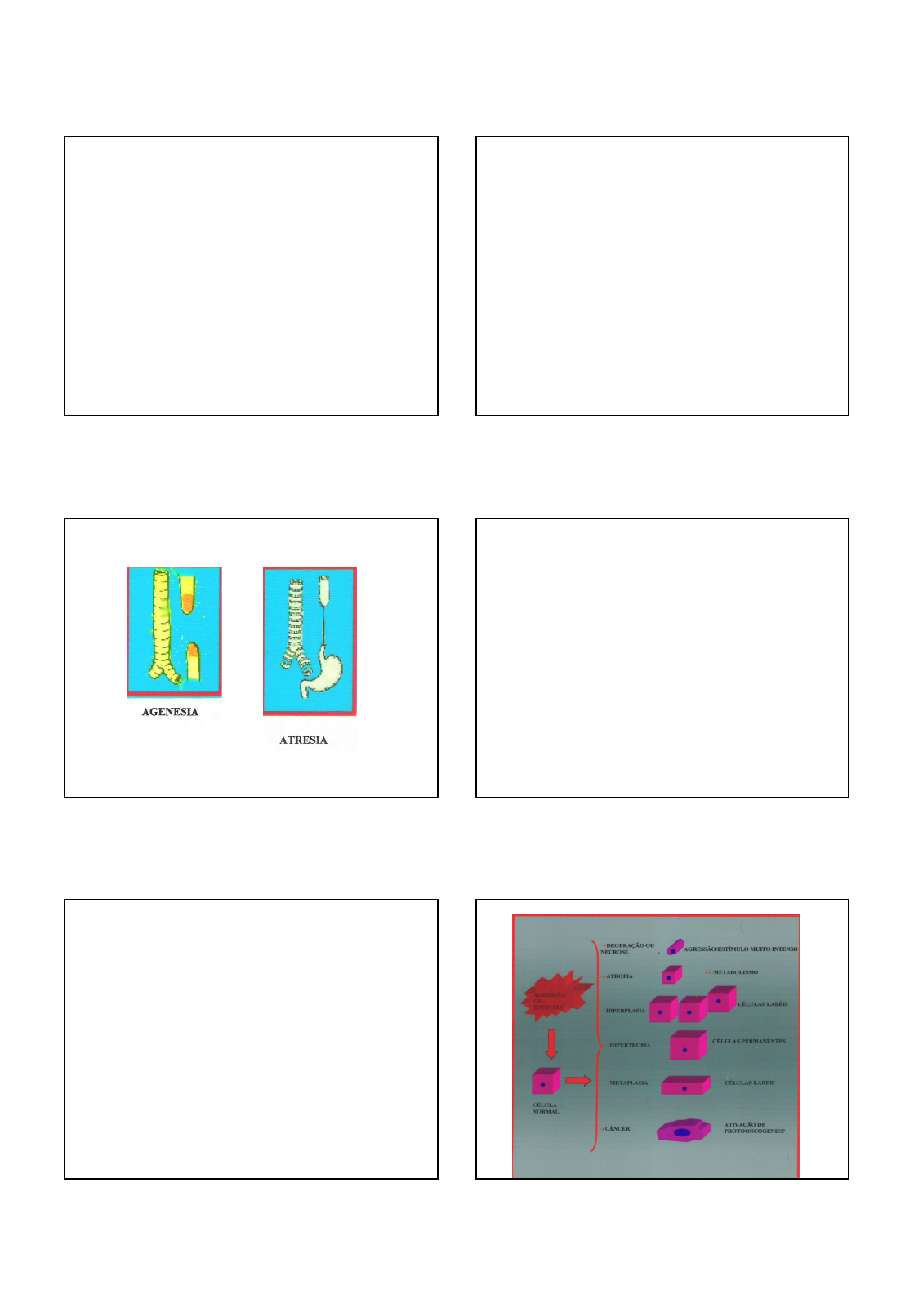 24/06/2020 1 ALTERAÇÕES DO DESENVOLVIMENTO E DO CRESCIMENTO • I – ALTERAÇÕES DO DESENVOLVIMENTO: – A – AGENESIA (aplasia): • Ausência ou não formação de um órgão – B – HIPOPLASIA: Desenvolvimento rudimentar • Órgãos ocos: – Estenose – Atresia - Agenesia – C – DUPLICAÇÃO • II – ALTERAÇÕES DO CRESCIMENTO: – A – ATROFIA (hipotrofia): Diminuição do tamanho de um órgão ou tecido que se desenvolveu normalmente. • 1 – Atrofia fisiológica • 2 – Atrofia patológica – A – Por desuso – B – De origem vascular – C – Por compressão – D – Por exaustão – E - Endócrina – B – HIPERTROFIA: Aumento de um órgão devido ao aumento de volume de suas células • 1 – Hipertrofia fisiológica • 2 – Hipertrofia patológica – C – HIPERPLASIA: Aumento de um órgão devido ao aumento de número de suas células • 1 – Hiperplasia fisiológica • 2 – Hiperplasia patológica 24/06/2020 2 • III – METAPLASIA: – Alteração reversível em que um tipo de célula adulta é substituída por outro tipo de célula adulta • 1 – Epitelial • 2 – Mesenquimatosa • Falsa metaplasia, aloprasia ou adaptação fisiológica • IV – DISPLASIA – (desenvolvimento desorganizado) – Alteração de células epiteliais ou mesenquimatosas, que sofrem proliferação e alterações citológicas atípica envolvendo tamanho, forma e organização celulares • V – ANAPLASIA – (Desdiferenciação): – Modificação regressiva profunda das células adultas que adquirem tipos celulares mais primitivas. Irreversível e representa o melhor critério para o diagnóstico de malignidade dos tumores 24/06/2020 3 GRATA PELA ATENÇÃO