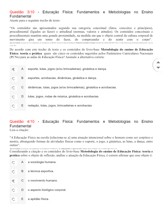Leia a citacio: "A Educacao Fisica na escola [relaciona-se a] uma atuacao intencional sobre o homem como ser corporeo c motriz, abrangendo formas de atividades fisicas como esporte, o jogo a ginastica as lutas. a danca, entre outras". Considerando a citacio c os conteudos do livro-base Metodologia do ensino de Edueacao Fisica: teoria e pratica sobre o objeto de reflexao, analise c atuacao da Educacao Fisica, correto afirmar que esse objetc: A a sociologia humana. B a tecnica esportiva. C o movimento humano. D o aspecto biologico corporal. E a aptidao fisica.