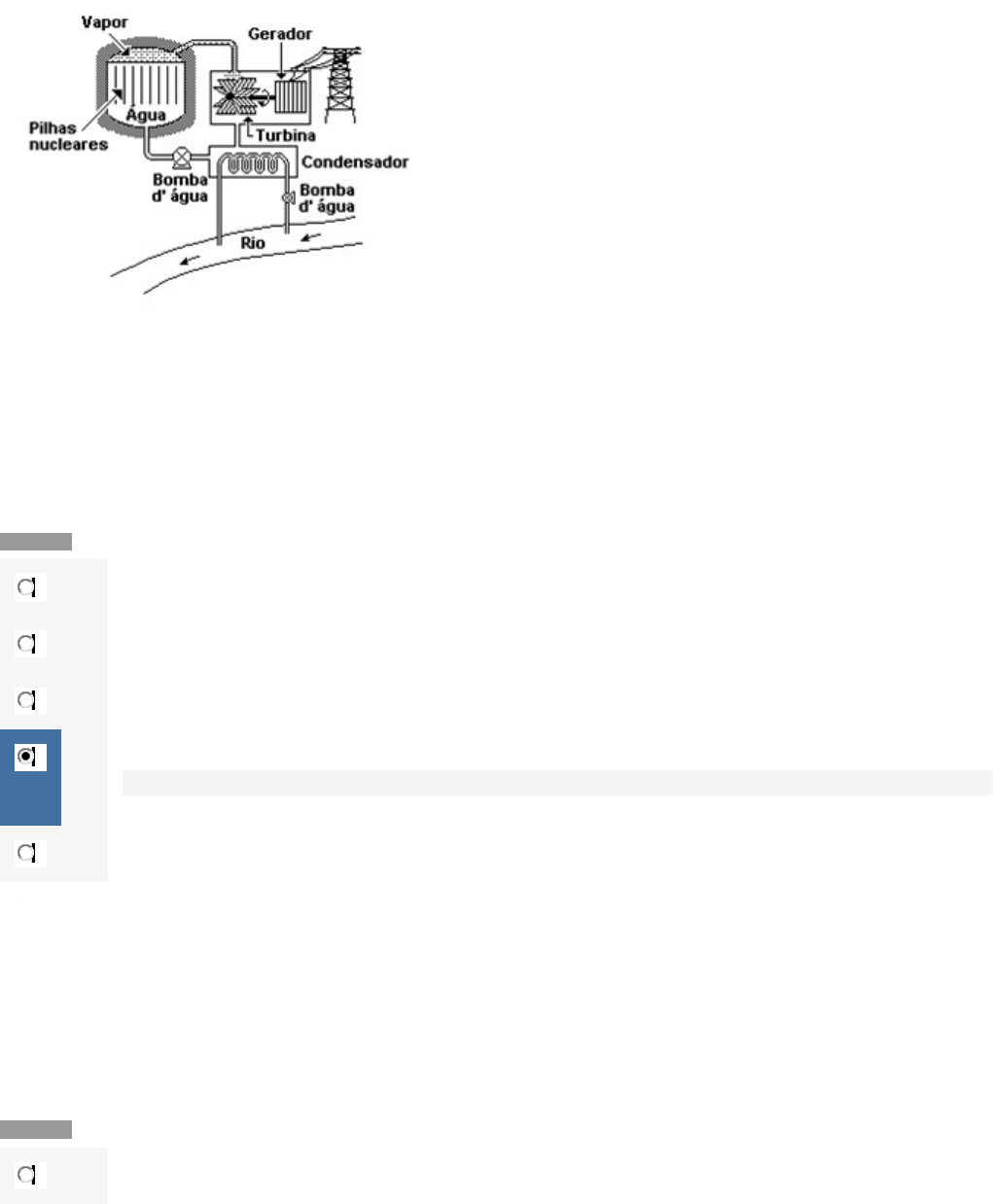Questão 1/10 - Conversão de Energia A energia térmica liberada em processos de fissão nuclear pode ser utilizada na geração de vapor para produzir energia mecânica que, por sua vez, será convertida em energia elétrica. Abaixo está representado um esquema básico de uma usina de energia nuclear. A partir do esquema são feitas as seguintes afirmações: I. a energia liberada na reação é usada para ferver a água que, como vapor a alta pressão, aciona a turbina. II. a turbina, que adquire uma energia cinética de rotação, é acoplada mecanicamente ao gerador para produção de energia elétrica. III. a água depois de passar pela turbina é pré-aquecida no condensador e bombeada de volta ao reator. Dentre as afirmações acima, somente está(ão) correta(s): Nota: 10.0 A I B II C III D I e II Você acertou! E II e III Questão 2/10 - Conversão de Energia A energia solar hoje é umas das fontes renováveis mais estudadas, pois ela apresenta muitos fatores positivos, como o fato de ser renovável, ocupar espaços reduzidos em comparação a outras fontes e não emitir poluentes na atmosfera. Além disso, a energia advinda dos raios solares é abundante e pode ser bastante produtiva quando devidamente aproveitada. No entanto, ela apresenta algumas desvantagens, destacando-se a: Nota: 10.0 A a baixa necessidade nas regiões de maior insolação. B os elevados custos das instalações. Você acertou! Entre as desvantagens apresentadas pela energia solar, podemos citar: o baixo rendimento, dificuldade de armazenamento, dependência das condições climáticas e, principalmente, o alto custo dos seus aparelhos, equipamentos e técnicas de instalação. C a inacessibilidade em lugares remotos. D a frequente necessidade de manutenção. E os efeitos sobre as temperaturas da Terra. Questão 3/10 - Conversão de Energia O Brasil ainda está longe de se tornar um pais com um grande aproveitamento energética das fontes renováveis, mas em pequenos passos está se tornando um país que utiliza cada vez mais fontes renováveis de energia. Embora ainda haja uma necessidade de diversificar os tipos de produção existentes no país. Os dois principais tipos de fontes de energia renováveis mais utilizados no Brasil atualmente são: Nota: 10.0 A eólica e solar B nuclear e hidrelétrica C hidrelétrica e biomassa Você acertou! As duas principais fontes de energia utilizadas no Brasil e classificadas entre as renováveis são as hidrelétricas, para a produção de eletricidade, e a biomassa, principalmente na produção dos biocombustíveis, com destaque para o etanol. D eólica e biomassa E solar e hidrelétrica Questão 4/10 - Conversão de Energia O Brasil utiliza o represamento das águas dos rios para a construção de usinas hidroelétricas na geração de energia elétrica. Porém, isso causa danos ao meio ambiente, como por exemplo: - imensa quantidade de madeira nobre submersa nas águas; - alteração do habitat da vida animal; - assoreamento dos leitos dos rios afluentes. Numa usina hidroelétrica existe uma transformação sequencial de energia. Esta sequência está indicada na alternativa Nota: 10.0 A cinética - potencial - elétrica B química - cinética - elétrica C cinética - elástica - elétrica D potencial - cinética - elétrica Você acertou! E potencial - química - elétrica Questão 5/10 - Conversão de Energia Dentro de um processo de produção de eletricidade por meio da energia hidráulica, a energia passa por diversos estágios até obter sua forma final, que é a energia elétrica, ou seja, há vários estágios de conversão de energia antes de se obter o resultado final. Considerando este processo, assinale a alternativa correta. Considere g = 9,81 m/s2 Nota: 10.0 A ( ) Do início ao fim do processo de conversão as formas que a energia assume são energia mecânica e cinética. B ( ) A restituição de água a jusante deve estar no mesmo nível do gerador elétrico. C ( ) A medida que a queda d’água aumenta, a capacidade de geração de energia elétrica diminui. D ( ) Caso a altura da barragem a montante seja de 235m, e a massa de água armazenada seja de 12000kg, então a energia potencial acumulada será de 276,642x105 J. Você acertou! E ( ) A construção de usinas hidrelétricas pode ser realizada em qualquer tipo de rio, sem variações muito consideráveis no que diz respeito a área alagada pelo lago da barragem a montante. Questão 6/10 - Conversão de Energia De acordo com a frase abaixo sobre a energia solar, favor analisar as alternativas. “A energia que move a máquina Terra provém da gravidade, do interior da Terra e do próprio movimento do planeta, mas em grau muito superior provém do Sol, da radiação solar”. (David DREW. Processos interativos Homem-Meio Ambiente. Rio de Janeiro: Bertrand Brasil, 1994, p.20). A energia solar é uma das fontes de energia que atua no planeta Terra. Ela é, no planeta, Nota: 10.0 A o principal fator construtor das estruturas e formas de relevo. B um item secundário na formação das coberturas vegetais. C um fator de desequilíbrio que altera as dinâmicas terrestres. D o elemento essencial que dá origem aos sistemas e tipos climáticos. Você acertou! A energia solar é bastante utilizada pelo homem não apenas para a geração de eletricidade, mas para muitas atividades em seu dia a dia. A presença do calor e da luz solar possibilita e interfere em uma gama muito variada de elementos terrestres, com destaque para o clima, bastante regulado pela atividade da radiação advinda do Sol. E uma fonte em vias de extinção, daí o valor de outras formas de energia. Questão 7/10 - Conversão de Energia Analise a seguinte instalação de um aerogerador: Os dados do problema são: Densidade do ar: Raio das pás: R = 45 m Coeficiente do multiplicador: k = 70 Número de pares de pólos da MAS: p = 2 Frequência da rede: f = 50 Hz Recordando a fórmula para o escorregamento de uma MAS. A turbina do