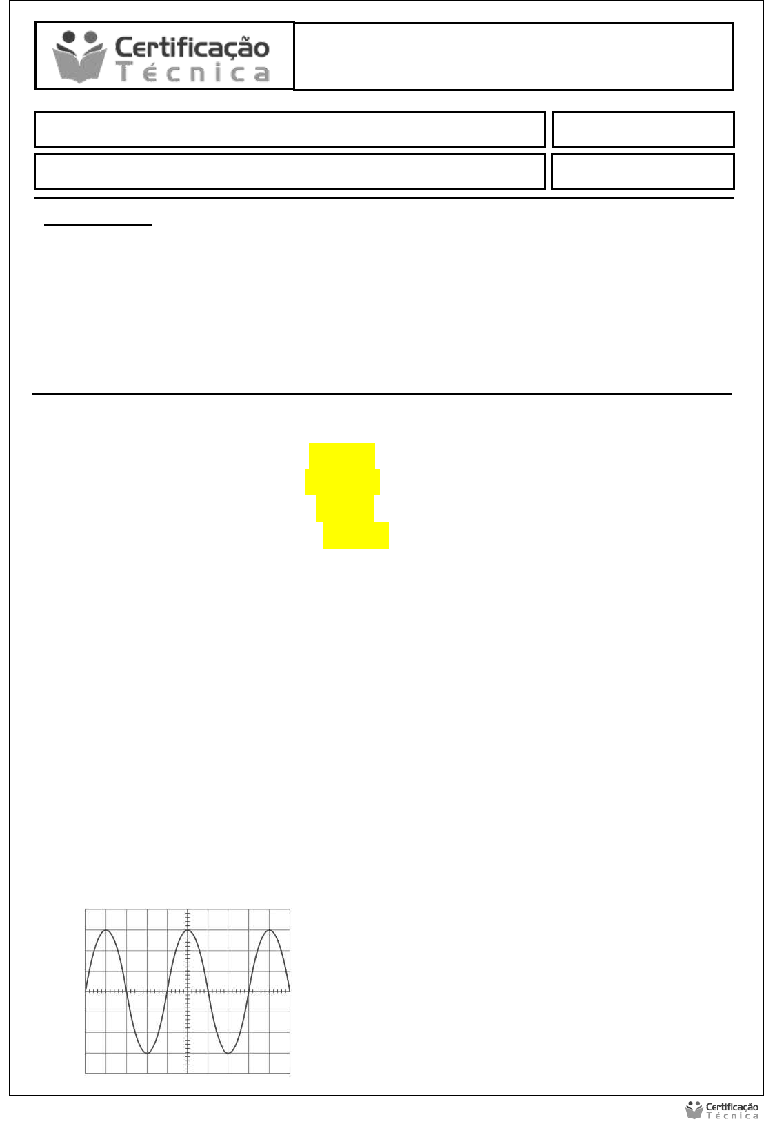 INSTRUÇÕES: Esta Avaliação contém 9 (nove) questões, totalizando 10 (dez) pontos; Baixe o arquivo disponível com a Atividade de Pesquisa; Você deve preencher dos dados no Cabeçalho para sua identificação: o Nome / Data de entrega. As respostas devem ser digitadas abaixo de cada pergunta; Ao terminar grave o arquivo com o nome Atividade Prática; Envio o arquivo pelo sistema no local indicado; Em caso de dúvidas consulte o seu Tutor. Aluno (a): CARLOS MOLLER FILHO Data: 26/ 06 / 2020. Princípios de Eletrônica Analógica - ELE/ELT Princípios de Eletrônica Analógica - ELE/ELT NOTA: Avaliação Prática 1) Quais são os valores máximo e de pico a pico da tensão da rede elétrica de 127 V e de 220 V? Vp = √2 . Vef Vp = 0,707.127 = 179,6Vmax Vp= 0,707.220 = 311,11Vmax Vpp = 2.Vp Vpp = 2. 179,6V = 359,2Vpp Vpp = 2. 311,11V = 622,22Vpp 2) Determine os valores de período, frequência e frequência angular dos sinais a seguir a partir dos valores fornecidos: a) Tensão senoidal em que f = 80 kHz. Determine T e 𝜔 = 2.𝜋.f = 2.𝜋.80.0000 = 502.654.8246 rad/s T = 1/f = 1/80.000 = 1,25ms b) Tensão senoidal em que ω = 2400 rad/s. Determine T e f f = 𝜔/2.𝜋 2400/2.𝜋 = 15,079Khz T = 1/f = 1/4000 = 2,5µs c) Corrente senoidal em que T = 100 ms. Determine f e ω 𝜔 = 2.𝜋/T = 62,83 f = 1/T = 10Hz 3) A Figura abaixo apresenta a tela de um osciloscópio ajustado com: Atenuação – 2 V/div Base de tempo – 1 ms/div Princípios de Eletrônica Analógica - ELE/ELT Pede-se: a) Valor de pico (VP) Vp = 3div. .2V = 6V b) Valor de pico a pico (VPP) Vpp = 2. Vp = 12V c) Período (T) T = 5ms d) Frequência (f) do sinal apresentado. f = 1/T = 20Hz Princípios de Eletrônica Analógica - ELE/ELT 4) Considere um transformador simples especificado para operar com tensão de 110 V no primário, com relação de espiras N1/N2 = 18 e determine: a) Tensão eficaz no secundário (Vef); N1/N2 = 360/20 =18 V1/V2 = 110/6 =18 Vef2 = 6V b) Tensão máxima no secundário (VSmáx). Vmax2 = √2.Vef2 = 8,48Vmax 5) Determine o resistor R para polarizar o LED, conforme o circuito em seguida. Especificações do LED: Cor: vermelha Diâmetro: 5 mm Operação: VF = 1,7v IF = 10mA IF max = 50 mA VR max = 5V R = Vcc – Vf = 12 – 1,7 = 1030 ou 1KΩ IF 10.10-3 6) Um diodo de silício apresenta, à temperatura de 25 °C, uma queda de tensão no sentido direto de VF1 = 0,6 V com uma corrente de 12 mA. Se a corrente se mantiver constante, qual será a tensão direta resultante na temperatura 115°C? ΔT=T2-T1 = 115 - 25 ⇒ ΔT = 90 °C 1°C - -2,5mV 90°C ∆V , ΔV = 90.(-2,5.10-3) = - 225mV VF2 = VF1 + ΔV = 0,6 – 0,225 ------ VF2 = 0,375V 7) Considere um circuito retificador de meia-onda ligado a uma carga resistiva com um transformador 220 V x 15 V (Ptr = 60 VA) operando em sua potência máxima. Determine: Princípios de Eletrônica Analógica - ELE/ELT a) A máxima potência que pode ser transferida à carga; Ptr = 1,23.Pdc—60 = 1,23.Pdc= 60/1,23 = 48,8W b) A tensão média e a corrente média na carga; Vsmax = √2. VSef.15 = 21,2V Vmax = Vsmax – 1,2 = 21,2 – 1,2 = 20V VDC = 2.Vmax/𝜋 = 2.20/𝜋 = 12,7V IDCmax = PDC/VDC = 48,8/12,7 = 1,92A c) As especificações dos diodos (corrente média máxima (IFmáx) e tensão reversa de pico (VRmáx)) IFmax = > 3,84/2 --- 1,92A VRmax > VSmax --- > 21,2V Obs.: Lembro que o Fator de transformação para circuitos retificadores de meia onda é: λ = 3,49 (página 61 do livro de ELETRÔNICA ANALÓGICA BÁSICA - 2ª EDIÇÃO) Princípios de Eletrônica Analógica - ELE/ELT 8) Especifique utilizando a tabela abaixo os capacitores a seguir conforme os dados dos seus encapsulamentos: a) Capacitor cerâmico com a inscrição 104. R = 10.104 = 100nF b) Capacitor de poliéster metalizado com as cores: laranja, laranja, amarelo, branco, vermelho C = 33.104 pF = 330nF ----- 10% ----- 250Vmax 9) Considere o circuito RC dado na figura abaixo, no qual o capacitor encontra-se totalmente descarregado. Dados: R = 100 kΩ; C = 10 µF; E = 10 V a) Determine a constante de tempo t do circuito; b) Após o fechamento da chave S, em que tempo se pode considerar o capacitor completamente carregado? 𝝉 Princípios de Eletrônica Analógica - ELE/ELT 𝜏 = R.C = 100. 103. 100. 10-6 = 𝜏 10s t = 5. 𝜏 = 5.10 = 50s.