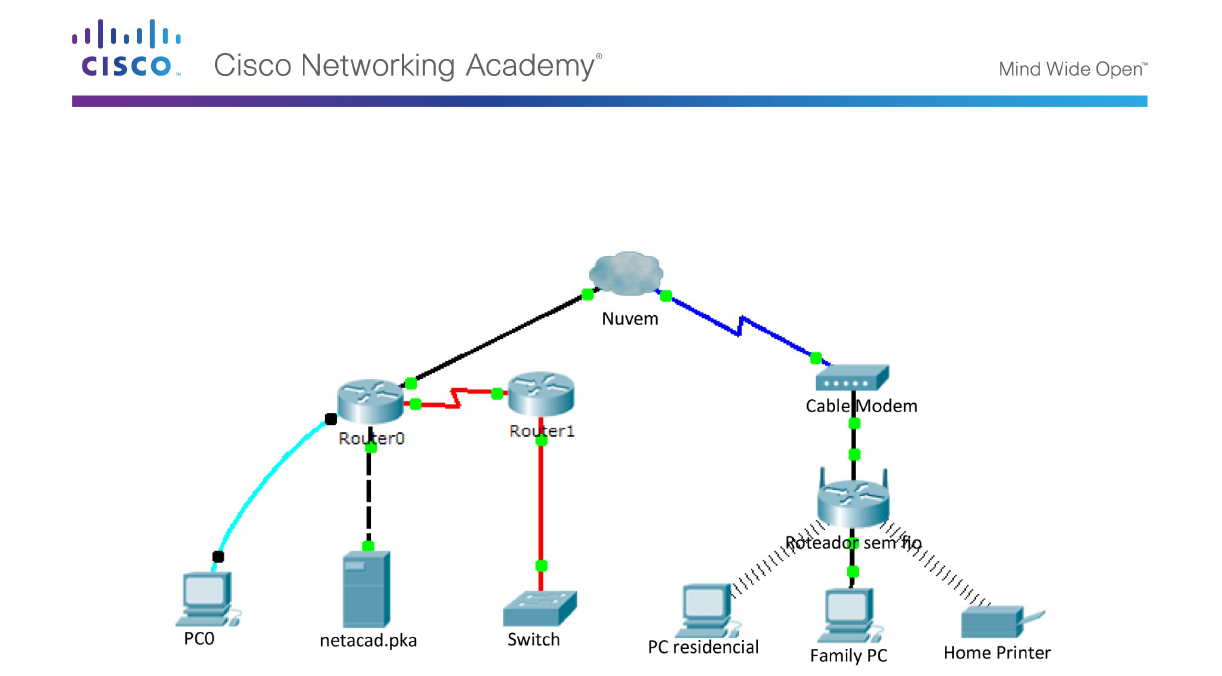 © 2016 Cisco e/ou suas afiliadas. Todos os direitos reservados. Este documento contém informações públicas da Cisco. Página 1 de 5 Packet Tracer - Conexão de uma LAN com e sem fio Topologia Packet Tracer - Conexão de uma LAN com e sem fio © 2016 Cisco e/ou suas afiliadas. Todos os direitos reservados. Este documento contém informações públicas da Cisco. Página 2 de 5 Tabela de endereçamento Dispositivo Interface Endereço IP Conecta-se a Nuvem Eth6 N/D F0/0 Coax7 N/D Port0 Modem a cabo Port0 N/D Coax7 Porta1 N/D Internet Router0 Console N/D RS232 F0/0 192.168.2.1/24 Eth6 F0/1 10.0.0.1/24 F0 Ser0/0/0 172.31.0.1/24 Ser0/0 Router1 Ser0/0 172.31.0.2/24 Ser0/0/0 F1/0 172.16.0.1/24 F0/1 WirelessRouter Internet 192.168.2.2/24 porta 1 Eth1 192.168.1.1 F0 Family PC F0 192.168.1.102 Eth1 Switch F0/1 172.16.0.2 F1/0 Netacad.pka F0 10.0.0.254 F0/1 Configuration Terminal RS232 N/D Console Objetivos Parte 1: conectar-se à nuvem Parte 2: conectar Router0 Parte 3: conectar dispositivos restantes Parte 4: verificar conexões Parte 5: examinar a topologia física Histórico Ao trabalhar no Packet Tracer (um ambiente de laboratório ou uma configuração corporativa), você deve saber como selecionar o cabo certo e como conectar os dispositivos corretamente. Nesta atividade você examinará as configurações de dispositivo no Packet Tracer, selecionará o cabo correto com base na configuração e conectará os dispositivos. Esta atividade também vai explorar a visão física da rede no Packet Tracer. Packet Tracer - Conexão de uma LAN com e sem fio © 2016 Cisco e/ou suas afiliadas. Todos os direitos reservados. Este documento contém informações públicas da Cisco. Página 3 de 5 Parte 1: Conectar-se à nuvem Etapa 1: Conectar a nuvem ao Router0. a. Na parte inferior esquerda, clique no ícone laranja para abrir as Connections (Conexões) disponíveis. b. Escolha o cabo certo para conectar Router0 F0/0 a Cloud Eth6. Cloud é um tipo de switch, então use a conexão Copper Straight-Through. Se você conectou o cabo certo, as luzes de link no cabo ficam verdes. Etapa 2: Conectar a nuvem ao modem a cabo. Escolha o cabo certo para conectar Cloud Coax7 a Modem Port0. Se você conectou o cabo certo, as luzes de link no cabo ficam verdes. Parte 2: Conectar Router0 Etapa 1: Conectar Router0 a Router1. Escolha o cabo certo para conectar Router0 Ser0/0/0 a Router1 Ser0/0. Um dos cabos Seriais disponíveis. Se você conectou o cabo certo, as luzes de link no cabo ficam verdes. Etapa 2: Conectar Router0 a netacad.pka. Escolha o cabo certo para conectar Router0 F0/1 a netacad.pka F0. Roteadores e computadores normalmente usam os mesmos fios para transmitir (1 e 2) e receber (3 e 6). O cabo certo consiste nestes cabos cruzados. Embora muitas placas de rede agora possam detectar automaticamente qual par é usado para transmitir e receber, Router0 e netacad.pka não tem placas de rede com detecção automática. Se você conectou o cabo certo, as luzes de link no cabo ficam verdes. Etapa 3: Conectar Router0 ao terminal de configuração (Configuration Terminal). Escolha o cabo certo para conectar Router0Console ao Configuration Terminal RS232. Esse cabo não fornece acesso de rede a Configuration Terminal (Terminal de configuração), mas permite a você configurar Router0 por meio de seu terminal. Se você conectou o cabo certo, as luzes de link no cabo ficam pretas. Parte 3: Conectar os dispositivos restantes Etapa 1: Conectar Router1 a Switch. Escolha o cabo certo para conectar Router1 F1/0 a Switch F0/1. Se você conectou o cabo certo, as luzes de link no cabo ficam verdes. Espere alguns segundos até a luz passar de amarela para verde. Etapa 2: Conectar Cable Modem a Wireless Router. Escolha o cabo certo para conectar ModemPort1 à porta Internet de Wireless Router. Se você conectou o cabo certo, as luzes de link no cabo ficarão verdes. Packet Tracer - Conexão de uma LAN com e sem fio © 2016 Cisco e/ou suas afiliadas. Todos os direitos reservados. Este documento contém informações públicas da Cisco. Página 4 de 5 Etapa 3: Conectar Wireless Router a Family PC Escolha o cabo certo para conectar Wireless Router Ethernet 1 a Family PC (PC da família). Se você conectou o cabo certo, as luzes de link no cabo ficam verdes. Parte 4: Verificar as conexões Etapa 1: Testar a conexão do Family PC com netacad.pka. a. Abra o prompt de comando em Family PC (PC da família) e envie um ping para netacad.pka. b. Abra o Web Browser (Navegador da Web) e insira o endereço http://netacad.pka. Etapa 2: Fazer ping no switch a partir do Home PC. Abra o prompt de comando no Home PC (PC residencial) e execute ping no endereço IP do Switch para verificar a conexão. Etapa 3: Abrir Router0 pelo Configuration Terminal. a. Abra o Terminal do Configuration Terminal (Terminal de configuração) e aceite as configurações padrão. b. Pressione Enter para ver o prompt de comando do Router0. c. Digite show ip interface brief para ver os status das interfaces. Parte 5: Examinar a topologia física Etapa 1: Examinar a nuvem. a. Clique na guia Physical Workspace (Área de trabalho física) ou pressione Shift+P and Shift+L para alternar entre os ambientes de trabalho lógico e físico. b. Clique no ícone Home City (Cidade natal). c. Clique no ícone Cloud (Nuvem). Quantos cabos estão conectados ao switch no rack azul? ___________ d. Clique em Back (Voltar) para voltar para Home City (Cidade natal). Etapa 2: Examinar a rede principal. a. Clique no ícone Primary Network (Rede principal). Aponte o cursor sobre os vários cabos. O que há na mesa à direita do rack azul? ____________________________________________________________________________________ b. Clique em Back (Voltar) para voltar para Home City (Cidade natal). Etapa 3: Examinar a rede secundária. a. Clique no ícone Secondary Network (Rede secundária). Aponte o cursor sobre os vários cabos. Por que existem dois cabos laranja conectados a cada dispositivo