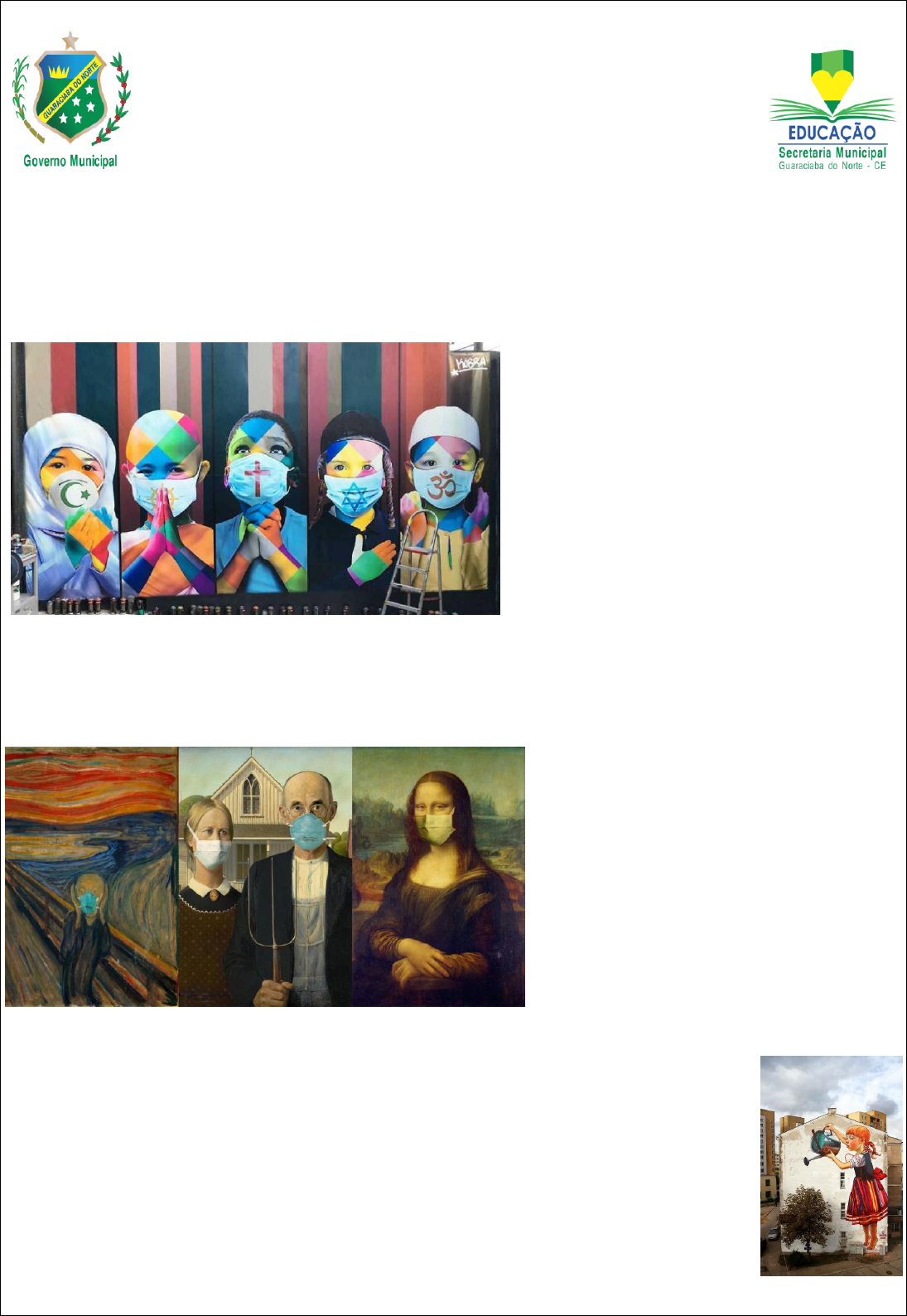 ARTES PROFESSORA VIVIANNE BARROS NOME:_____________________________________________________________________________ ARTE NA PANDEMIA Artista plástico Kobra faz mural em homenagem às vítimas do novo coronavírus Eduardo Kobra começou sua carreira como Grafiteiro artístico, depois se tornou grafiteiro e hoje considera-se um muralista. que encanta o mundo com suas obras realistas e monumentais. O artista plástico brasileiro Eduardo Kobra lançou, no dia 5 de abril, um mural de grafite para homenagear as vítimas do novo coronavírus ao redor do mundo. A obra, que retrata crianças de diferentes religiões – islamismo, budismo, cristianismo, judaísmo e hinduísmo – usando máscaras é uma mensagem para que as pessoas tenham esperança na cura da doença e respeitem as diferentes nações e religiões. O mural faz parte de uma campanha organizada pelo artista com a Organização Não Governamental (ONG) IKMR (sigla que, em inglês, significa “eu conheço meus direitos”), que arrecada agasalhos, alimentos e produtos de higiene para moradores de rua e refugiados. ESTA ARTISTA RECRIOU PINTURAS FAMOSAS PARA MOSTRAR COMO SERIAM DURANTE A PANDEMIA DE CORONAVÍRUS. Todos de máscara. Assim seriam as mais famosas pinturas do mundo se tivessem sido pintadas durante o surto de coronavírus. Genevieve Blais é uma artista fotográfica, a viver em Toronto, conhecida pelos seus trabalhos que envolvem narrativas históricas e teóricas da arte. Todo o seu trabalho é fortemente inspirado pela morte, escuridão e história da arte. "Acredito que não é possível apreciar a luz sem a escuridão, e a melhor maneira de vencer lutas e tragédias é através da beleza", contou ao SAPO Viagens. Genevieve criou um projeto onde reinventa as pinturas mais famosas da história da humanidade e as adapta à realidade atual, protegidas com máscaras. "Eu quero que as pessoas sorriam ao ver as imagens, mas que também tenham certeza de que estamos juntos nisso" explica Genevieve. "As pessoas enfrentaram pragas e pandemias no passado, e o mundo recuperou-se. Eu acho que é uma mensagem de tranquilidade e uma oportunidade de sorrir no meio da escuridão." A jovem artista não é indiferente às preocupações, admite que está com com medo e cheia de incertezas. Mas acredita que devemos aprender com isso e sorrir diante da tragédia. Genevieve deixa o conselho: "Crie! O mundo precisa de arte agora mais do que nunca". Artes urbanas A Arte Urbana (street art, em inglês) é um tipo de arte encontrada nos espaços urbanos. Na prática, a arte urbana representa o encontro da vida com a arte, pois a fusão de ambas se dá naturalmente, na medida em que o ser humano vive e se desloca pela cidade. A preferência pelo espaço público para fazer a demonstração da Arte Urbana tem como objetivo causar impacto nos espectadores, além de transmitir uma mensagem revolucionária, que critica a sociedade com ironia. Normalmente, esse tipo de arte descreve o trabalho de pessoas que desenvolvem um estilo de expressão artística através do uso de diferentes técnicas alternativas como pôsteres, adesivos, moldes, murais, spray e outros. ESTADO DO CEARÁ PREFEITURA MUNICÍPIO DE GUARACIABA DO NORTE Secretaria de Educação Primeiro, a arte de rua surgiu na Grécia Pré-Socrática como uma forma de manifestação cultural e literária, onde encontravam- se os aedos (cantores) homéricos que cantavam versos e músicas, tentando envolver o público com sua melodia. Na Idade Média, ela surgiu com os trovadores, artistas nobres que recitavam versos e poesias nas festas das cidades e dos palácios para entreter a nobreza com as histórias cantaroladas. Posteriormente, a Arte Urbana surgiu em Nova Iorque, Estados Unidos, na década de 70, com uma característica dinâmica e temporária. Dessa forma, surgiam os demais estilos de Arte Urbana, partindo da arte escrita, cantada e musical, como o hip hop que apareceu em meados dos anos 60/70 na cidade de Nova York e Berlim. Na época, a dança apareceu como uma manifestação política e social, abrindo espaço para outras movimentações artísticas como os desenhos de rua, as apresentações teatrais, além das “estátuas vivas”, exemplo de arte possível de se encontrar nas esquinas das grandes cidades até os dias atuais. No Brasil, os primeiros sinais de Arte Urbana começaram a surgir na década de 70, mais precisamente na cidade de São Paulo, com as obras de grafite, que eram feitas nas paredes. Exemplos de Arte de Rua – Arte Urbana Diversas técnicas são utilizadas pelos artistas de rua, embora a intervenção “grafite” seja a mais associada ao tema de arte de rua. Segue abaixo alguns exemplos de arte que encontra-se espalhadas pelas cidades: Grafite: desenhos estilizados geralmente feitos com sprays nas paredes de edifícios, túneis, ruas. Há muitas técnicas de grafite e atualmente os trabalhos em 3D chamam a atenção dos críticos. Grafíti (do italiano graffiti, plural de graffito) é o nome dado às inscrições feitas em paredes, desde o Império Romano. Considera-se grafite uma inscrição caligrafada ou um desenho pintado ou gravado sobre um suporte que não é normalmente previsto para esta finalidade. Por muito tempo visto como um assunto irrelevante ou mera contravenção, atualmente o grafite já é considerado como forma de expressão incluída no âmbito das artes visuais, mais especificamente, da street art ou arte urbana - em que o artista aproveita os espaços públicos, criando uma linguagem intencional para interferir na cidade. Alguns artistas expoentes na arte do Grafiti: Jean-Michel Basquiat, Os gêmeos, Banksy. Estêncil: parecido com o grafite, esse tipo de técnica utiliza o papel recortado como molde e o spray para fixar as ilustrações e desenhos nas ruas, postes, paredes. Poemas: qualquer tipo de manifestação literária que surge no ambiente urbano, seja nos bancos, paredes, postes. Autocolantes e Colagem: chamado de “sticker a