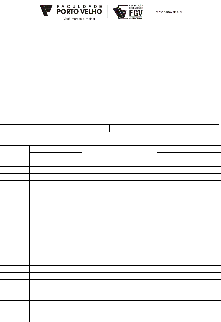 Curso de Bacharelado em Administração da Faculdade Porto Velho com Certificação em Qualidade da Fundação Getulio Vargas FICHA DE ACOMPANHAMENTO INDIVIDUAL Nome do (a) aluno (a) Orientador (a) Atividades de pesquisa em orientação ( ) Projeto de pesquisa ( ) Artigo Científico Data Horário Assunto da reunião de orientação Vistos Início Término Orientador Acadêmico : : : : : : : : : : : : : : : : : : : : : : : : : : : : : : : : : : : : : : : : : : : : : : Porto Velho, _____ de ______________ de 20_____.