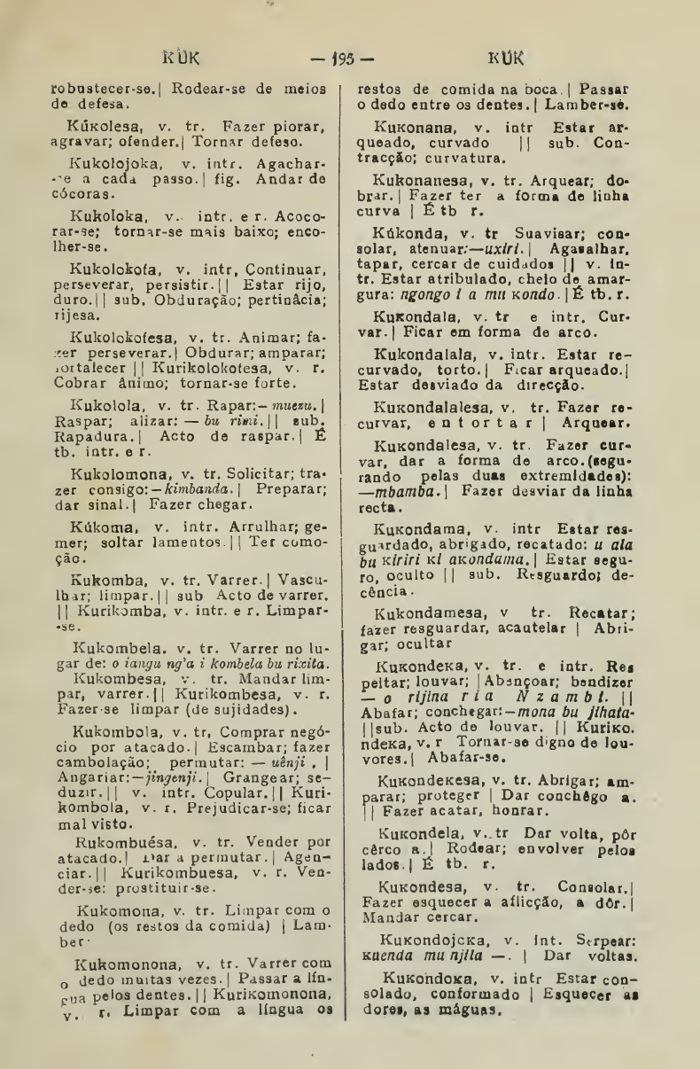 KOK --Í95- KUK robastecer-se.| Rodear-se de meios do defeca. KÚKoIesa, v. tr. Fazer piorar, agravar; ofender.| Tornar defeso. Kukolojoka, V. intf. Agachar- -'e a cada passo.] fig. Andar de cócoras. Kukoloka, v. intr. e r. Acoco- rar-ge; torn^r-se m^^ia baixo; enco- Iher-se. Kukolokofa, V. intr, Continuar, perseverar, persistir. | | Estar rijo, duro.Jl sub. Obduração; pertinácia; rijesa. Kukolokofesa, v. tr. Animar; fa- ?er perseverar.] Obdurar; amparar; jottalecer ] ] Kurikolokofesa, v. r. Cobrar ânimo; tornar-se forte. Kukolola. V. tr. Rapar:- »«««««. | Raspar; alizar: — bu rimi. \ \ aub. Rapadura.] Acto de raspar.] É tb. intr. e r. Kukolomona, v. tr. Solicitar; tra« zer consigo: — kimbanda.\ Preparar; dar sinal.] Fazer chegar. Kúkoma, v. intr. Arrulhar; ge- mer; soltar lamentos ] 1 Ter como- ção. Kukomba, v. tr. Varrer. | Vascu- lhar; limpar.]] sub Acto de varrer. |] Kurikomba, v. intr. e r. Limpar- -se. Kukombela. v. tr. Varrer no lu- gar de: o iangu ng^a i kombela bu rixita. Kukombesa, v. tr. Mandar lim- par, varrer. |] Kurikombesa, v. r. Fazer se limpar (de sujidades) . Kukombola, v. tr, Comprar negó- cio por atacado.] Escambar; fazer cambolação; permutar: — uènji , | Angariar:— ;7n^e7i;?". ] Grangear; se- duzir.]] V. intr. Copular. Jl Kuri- kombola, v. r. Prejudicar-se; ficar mal visto. Rukombuésa. v. tr. Vender por atacado.] i.»ar a permutar.] Agen- ciar. | | kurikombuesa, v. r. Ven- der-ic: prostituir-se. Kukomona, v. tr. Limpar com o dedo (os reátos da comida) ( Lam- ber- Kukomonona, v. tr. Varrer com Q dedo muitas vezes. | Passar a lín- pua pelos dentes. | ] KuriKomonona, y. r, Limpar com a língua os restos de comida na boca. | Passar o dedo entre os dentes. | Lamber-sè. KuKonana, v. intr Estar ar- queado, curvado ] ] sub. Con- tracçSo; curvatura. Kukonanesa, v. tr. Arquear; do- br<^r. ] Fazer ter a forma de liaha curva I É tb r. Kúkonda, v. tr Suavisar; con- solar, atenuar; — uxiri. \ Agasalhar, tapar, cercar de cuidados ]| v. in- tr. Estar atribulado, cheio ds amar- gura: ngongo i a mu Kondo | É tb. r. KuKondala, v. tr e intr. Cur- var.) Ficar em forma de arco. re- queado. [ cur Kukondalala, v. intr. Estar i^urvado, torto. | Ficar arquea Estar desviado da direcção. KuKondalalesa, v, tr. Fazer re- cutvav, entortar J Arquear. KuKOndalesa, v. tr Fazer cur- var, dar a forma de arco. (segu- rando pelas duas extremidades):—mbamba.\ Fazer desviar da linha recta. KuKondama, v. intr Estar res- guardado, abrigado, recatado: u ala bu Kiriri kí aKondama. \ Estar segu- ro, oculto I ] sub. Rtsguardoj de- cência. Kukondamesa, v tr. Recatar; fazer resguardar, acautelar ] Abri- gar; ocultar KuKondeKa, v. tr. e intr. Res peitar; louvar; ]Ab3nçoar; bendizer -- o rijina ria N z a m b i. || Abafar; conchegar: -mona bu jihata- jjsub. Acto de louvar. |j KuriKO. ndeKa, v. r Tornar-se digno de lou- vores.] Abafar-se. KuKondeKftsa, v. tr. Abrigar; am- parar; proteger ] Dar conchego a. I ) Fazer acatar, honrar. KuKondela, v. tr Dar volta, pôr cerco a.] Rodear; envolver pelos lados. I É tb. r. KuKondesa, v tr. Consolar.] Fazer esquecera aílicção, a dôr.| Mandar cercar. KuKondojcKa, v, int. Serpear: Kaenda mu njila — . | Dar voltas. KuKondOKa, v. intr Estar con- solado, conformado i Esquecer ai dores, as máguas. ÍCt3K -196- KUK kuKoriua, V. intr. Estar bêbedo. Ficar perturbado, tachado. KuKOriuisa, v. tr. Embriagar; em- bebedar. I É tb. r. KúKOsa, V. tr. Dedilhar; mexer; lulir. KuKOSomona. v. tr. Mexor alguém a dormir para que se mova. | Ti- tilar; faser palpitar. 1 1 KuriKOso- mona, v intr. e r. Espreguiçar-se; mover-ae (estando a dormir),] Dar sinal de vida; estremecer | | sub Titilaçàc; estremecimento KuKOÍama, v. iptr. Estar alque- brado, corcovado | Tornar-se cur- vo. I fig. Ser maleável, dócil: mu- lembu Kotama u Konge o matete.\ | sub. Curvatura. KuKofarnesa, v. tr. Arquear; en- curvar. I É tb. r. KuKotamena, v tr. e intr. Estar ptnalsado, triste por j Curvar-se (pensativo) | | Kurikofamena, v. r. Toinar-se meditabundo, triste. KuKofeKa, v. tr. e intr. Arrebitar; virar o bico: — muaongo \ Dobrai; — mulembti \ Vergar: — tangu. \ fig. Sujeitar; demover; geduzir. | Ku- riKofcKa, V, intr. e r. Alapar-se; en- roscar-se, encolher-se. KuKofeKCsa, v. tr. Fazer a-rebi- tar, dobrar, virar a ponta de. KuKofola, V. tr. Dssapegar; tirar com esforço. I Puxar com impeto. KuKOfomoKa, v. intr. Ficar dis- tendido, aberto, desembrulhado (pa- ra deixar vêr o que contém). Kuicofomona, v. tr. Tirar à força que outrem tiver na mão; a mu ko- íoinona o Kttari bii maKu. | Arranc r (das mãos) | Fazer distender. KuKóua, V. intr. Ter victória. \ Obtei triunfo em campanha. | Ser aclamado, aplaudido, victoriado KuKouéla, V. tr. Aclamar, victo- riar: — muKmi. | Aplaudir com entu- siasmo I Nomear por aclamação KuKouesa. v. tr. Fazer aclamar, aplauJir , ] KuriKouesa. v. r. Fazer- -se aclamar com aplausos, KuKovala. v. tr. (port.) Escovar, 1 v. KUKUKumuna. KuKovama, ou Kukovoka, v. intr. Tei depiessão, baixamento de nível. I Estar baixo, deprimido. Kukóxa, V. intr. Cabecear (por ofeito de sono). Kukoxila. V. tr. e intr. Toscane- jar; coxilar; dormitar. KuKOzama, v. intr. Ter a super- fície esíèrijamente cavada. | Ficar côncavo. Kúku, adv. Cá; dêate lado: ku tnbandu—.\ Maia perto. |, adj. dc- term. Este; esta: o kukata-ku ejiU malamba. Kfiku, sub. (]X) Avô; avó.| An- tepaaiado. | f i g. Baleia Kukuáka, v. intr. Aportar; aMÍ- bar; encalhar: ndongo i akuaka.\ An- corar], fig. Ficjr empatado, estar parado 11 sub. Chegada ao porto. | Encalhe. Kukuakasa, v. tr. Lixar. Kukuakela, v. Intr. Varar; enca- lhar; dar em sdco: ulungu u a'<uakela mu êenga,\ Apjrtar ao acaao. Kukuakesa, v, tr. Mandar «por* tar; fazer encalhar.] Empatar. Kukuama, v. tr Ferir.] fig. Ofen- der. |( v. intr- Dar golpei.|| Kuri- kuama, v. r. Magoar-se; ferlr-se. Kukuameka, v. tr. Despeitar; dar com resentimento: ma, rii kià, kuma kienc kl w andalal | R-jpu iiar 