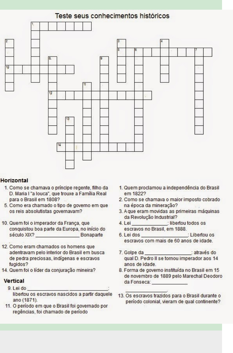 Cruzadinha de Revisão do 8° ano Postado por Linêssa Passos às 05:01 Nenhum comentário: Enviar por e-mailBlogThis!Compartilhar no TwitterCompartilhar no FacebookCompartilhar com o Pinterest Marcadores: Cruzadinhas sábado, 13 de setembro de 2014 Cruzadinha Geográfica - 6° Ano Postado por Linêssa Passos às 03:49 Nenhum comentário: Enviar por e-mailBlogThis!Compartilhar no TwitterCompartilhar no FacebookCompartilhar com o Pinterest Marcadores: Cruzadinhas, Geografia sexta-feira, 2 de maio de 2014 Cruzadinha Reino dos Francos Postado por Linêssa Passos às 07:07 Nenhum comentário: Enviar por e-mailBlogThis!Compartilhar no TwitterCompartilhar no FacebookCompartilhar com o Pinterest Marcadores: Cruzadinhas, Idade Média terça-feira, 12 de novembro de 2013 Cruzadinha sobre Abolição da Escravidão e Proclamação da República Postado por Linêssa Passos às 05:39 2 comentários: Enviar por e-mailBlogThis!Compartilhar no TwitterCompartilhar no FacebookCompartilhar com o Pinterest Marcadores: Cruzadinhas quinta-feira, 12 de setembro de 2013 Gabarito das Cruzadinhas e Caça-palavras Olá gente! Neste post estarão os gabaritos de todas as cruzadinhas e caça-palavras postados. Peço desculpas por não ter divulgado os gabaritos antes. Obrigada e aproveitem! :) Gabaritos: · Cruzadinha sobre o reino dos francos: 1. Copistas 2. Merovíngia 3. Carolíngio 4. Ruralização 5. Duques 6. Carlos Magno 7. Bárbaros 8. Pepino 9. Condes 10. Verdum 11. Oralmente 12. Carolíngia 13. Marqueses · Cruzadinha sobre Astecas, Incas e Maias: 1 Mexicas 2 Nobres 3 Quipu 4 Sapa Inca 5 Tenochtitlán 6 El Caracol 7 Yucatán 8 Sol 9 Cristóvão Colombo 10 Mita 11 Lhama 12 Cuzco 13 Agricultura 14 Tachtli 15 Copán · Cruzadinha sobre A mineração no Brasil colonial: 1 Aluvião 2 Derrama 3 Tropeiros 4 Casas de fundição 5 Aleijadinho 6 Minas Gerais 7 Lavra 8 Barroco 9 Intendência das minas 10 Quinto · Cruzadinha A História: 1 Etnocentrismo 2 Cristão 3 Escritas 4 Década 5 Século 6 Cultura 7 Milênio 8 Orais 9 Fontes históricas 10 Jesus Cristo Postado por Linêssa Passos às 04:36 Um comentário: Enviar por e-mailBlogThis!Compartilhar no TwitterCompartilhar no FacebookCompartilhar com o Pinterest Marcadores: Cruzadinhas Cruzadinha sobre Astecas, Incas e Maias Postado por Linêssa Passos às 04:32 Nenhum comentário: Enviar por e-mailBlogThis!Compartilhar no TwitterCompartilhar no FacebookCompartilhar com o Pinterest Marcadores: Cruzadinhas, Povos pré-colombianos quinta-feira, 1 de agosto de 2013 Cruzadinha sobre a Mineração no Brasil 8° Ano Para quem quiser salvar e imprimir a cruzadinha, basta clicar com o botão direito e Salvar imagem como... Pois o arquivo está em formato de imagem (JPG). Postado por Linêssa Passos às 05:10 Nenhum comentário: Enviar por e-mailBlogThis!Compartilhar no TwitterCompartilhar no FacebookCompartilhar com o Pinterest Marcadores: Cruzadinhas, História do Brasil Colônia quarta-feira, 31 de julho de 2013 Cruzadinha sobre a Pré-história brasileira 6° Ano Postado por Linêssa Passos às 10:24 Nenhum comentário: Enviar por e-mailBlogThis!Compartilhar no TwitterCompartilhar no FacebookCompartilhar com o Pinterest Marcadores: Cruzadinhas, Pré-história terça-feira, 30 de julho de 2013 Cruzadinhas Cruzadinha com perguntas de História para 6° ano, com o conteúdo de Introdução à História e o Tempo na História. Para quem estiver estudando para o Enem e outros vestibulares, a realização da cruzadinha como passatempo, também é válida!