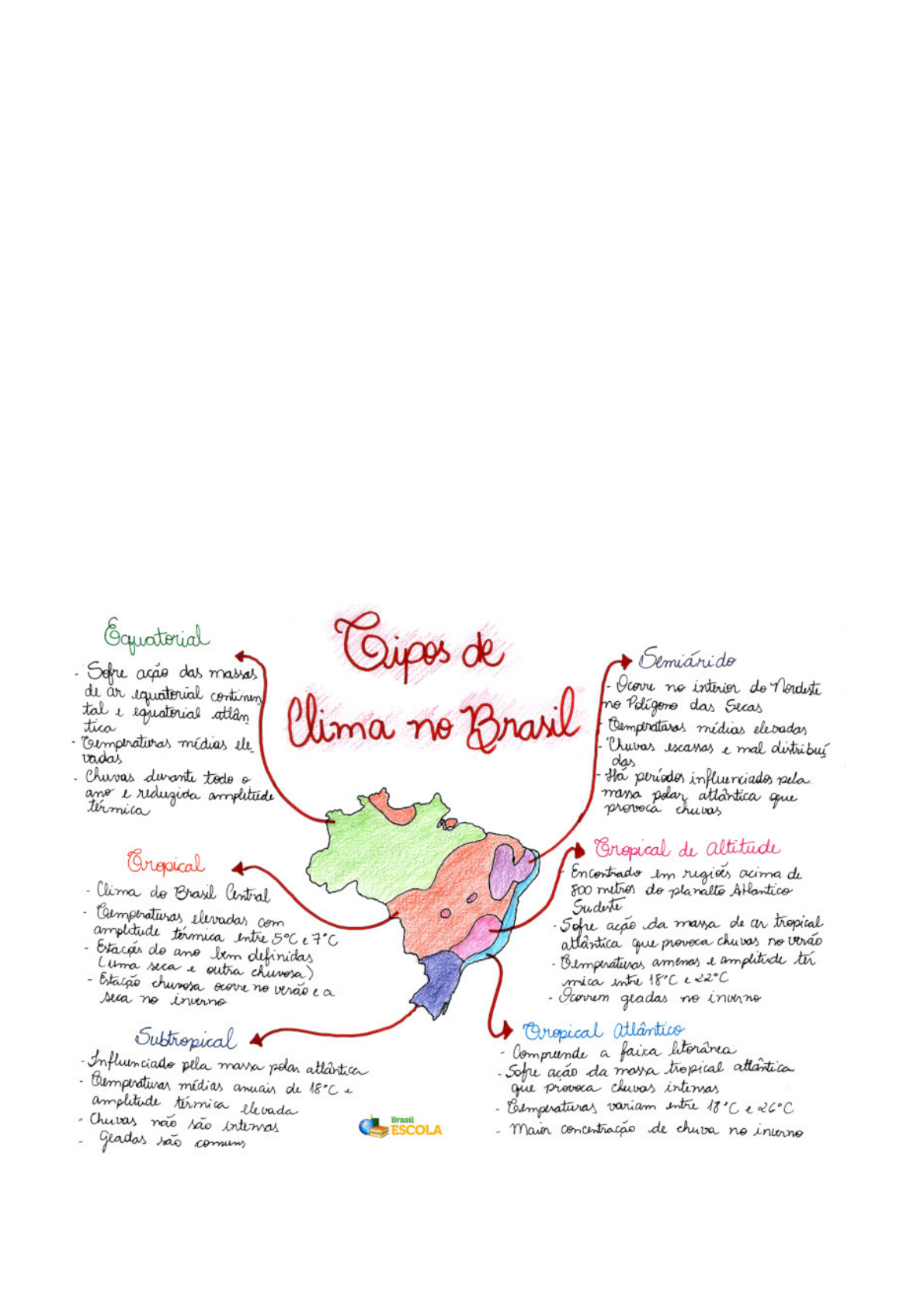 CIEP 404 Data da Postagem:........../........../.......... Componente curricular: Geografia Ano de escolaridade: 1º Professor Luciano José ATIVIDADES EM TEMPO DE CORONAVIRÚS – aula 2 TIPOS DE CLIMA NO BRASIL Aspectos dos seguintes climas do Brasil: equatorial, tropical, semiárido, tropical de altitude, tropical atlântico e subtropical. O território brasileiro, em virtude da sua localização e grande extensão, apresenta diferentes tipos de clima. Os principais climas do Brasil são: equatorial, tropical, semiárido, tropical de altitude, tropical atlântico e subtropical. Equator ial: esse é o clima predominante na região Amazônica, que abrange a Região Norte e porções dos estados de Mato Grosso e Maranhão. A temperatura média anual é elevada, variando entre 25 °C e 27 °C, com chuvas durante todo o ano e alta umidade do ar. Tropical: abrange estados das Regiões CentroOeste, Nordeste, Norte e Sudeste. Apresenta duas estações bem definidas: inverno (seco) e verão (chuvoso). A temperatura média varia entre 18 °C e 28 °C. Semiár ido: esse clima do Brasil predomina no interior nordestino. A temperatura é elevada, com média de 27 °C, e as chuvas são escassas e irregulares. Essas características, além da falta de políticas públicas (construção de reservatórios de água), dificultam o desenvolvimento das atividades agrícolas. Mental: Tipos de Clima no Brasil Os climas do Brasil Tropical de altitude: típico das áreas mais elevadas dos estados do Sudeste (Espírito Santo, Minas Gerais, Rio de Janeiro e São Paulo). A temperatura, com média anual entre 18 °C e 22 °C, é mais baixa nas áreas mais altas do relevo. Uma característica desse clima são as geadas durante o inverno. Tropical atlântico: está presente na zona litorânea que se estende do Rio Grande do Norte, no Nordeste, ao Paraná, no Sul. A temperatura é elevada, por volta de 25 °C. As chuvas, regulares e bem distribuídas, são mais intensas no Sul e no Sudeste durante o verão e no Nordeste, durante o inverno. Subtropical: clima predominante nas porções do território brasileiro situadas ao sul do Trópico de Capricórnio, na Zona Climática Temperada do Sul. Inclui os estados da Região Sul e parte de São Paulo e Mato Grosso do Sul. A temperatura média é de 18 °C, considerada a mais baixa do país. As chuvas são regulares e bem distribuídas. O verão é quente e o inverno é bastante frio, sendo comum a ocorrência de neve ou geada em determinados lugares. Por Wagner de Cerqueira e Francisco Graduado em Geografia Equipe Escola Kids https://escolakids.uol.com.br/ciencias/tiposdeclimanobrasil.htm Exercícios Questão 1 Em relação aos tipos de clima no Brasil, marque qual clima abrange uma porção maior do território e melhor caracteriza o país: A) Clima Semiárido B) Clima Equatorial C) Clima Subtropical D)Clima Tropical E) Clima Desértico Questão 2As características descritas abaixo fazem referência a um único tipo de clima brasileiro. Analiseas e responda a qual tipo de clima elas estão se referindo. Temperaturas médias elevadas ao longo do ano. Baixa precipitação anual e chuvas mal distribuídas. Encontro de quatro massas de ar: Equatorial Continental, Equatorial Atlântico, Tropical Atlântico e Polar Atlântica. O fenômeno La Niña, em que há um resfriamento da temperatura média das águas do Oceano Pacífico Equatorial, pode acarretar um excesso de precipitação. a)Clima Tropical b)Clima Semiárido c)Clima Equatorial d)Clima Subtropical e)Clima Tropical Úmido Questão 3Willhelm Köppen (18461940), climatologista russo naturalizado alemão, foi o primeiro pesquisador a mapear todas as regiões climáticas do mundo e suas variações ao longo do ano, sendo considerado precursor da Meteorologia moderna [...]. MARTINS, D. et al. Geografia sociedade e cotidiano: fundamentos. Volume 01, 3ª ed. São Paulo: escala educacional, 2013. p.134. Assinale, entre as alternativas a seguir, a que não apresenta um dos tipos climáticos do planeta de acordo com a classificação de Köppen: a) Equatorial b) Desértico c) Subtropical d) Litorâneo e) Mediterrâneo Questão 4As savanas correspondem a vegetações arbustivas, com caules e galhos grossos e retorcidos, folhas grossas, raízes profundas e com adaptadas a ambiente secos, que não necessariamente são frios. Além das savanas africanas, existem algumas “versões” destas no Brasil (o Cerrado) e na Venezuela (os Lhanos). O tipo climático onde é mais comum a presença das savanas e suas var iações é: a) equatorial b) temperado c) tropical d) subtropical e) semiárido Questão 5 Diferencie os climas tropical e tropical de altirude. Indique onde ocorrem no Brasil _________________________________________________________________ _________________________________________________________________ _________________________________________________________________ _________________________________________________________________ _________________________________________________________________
