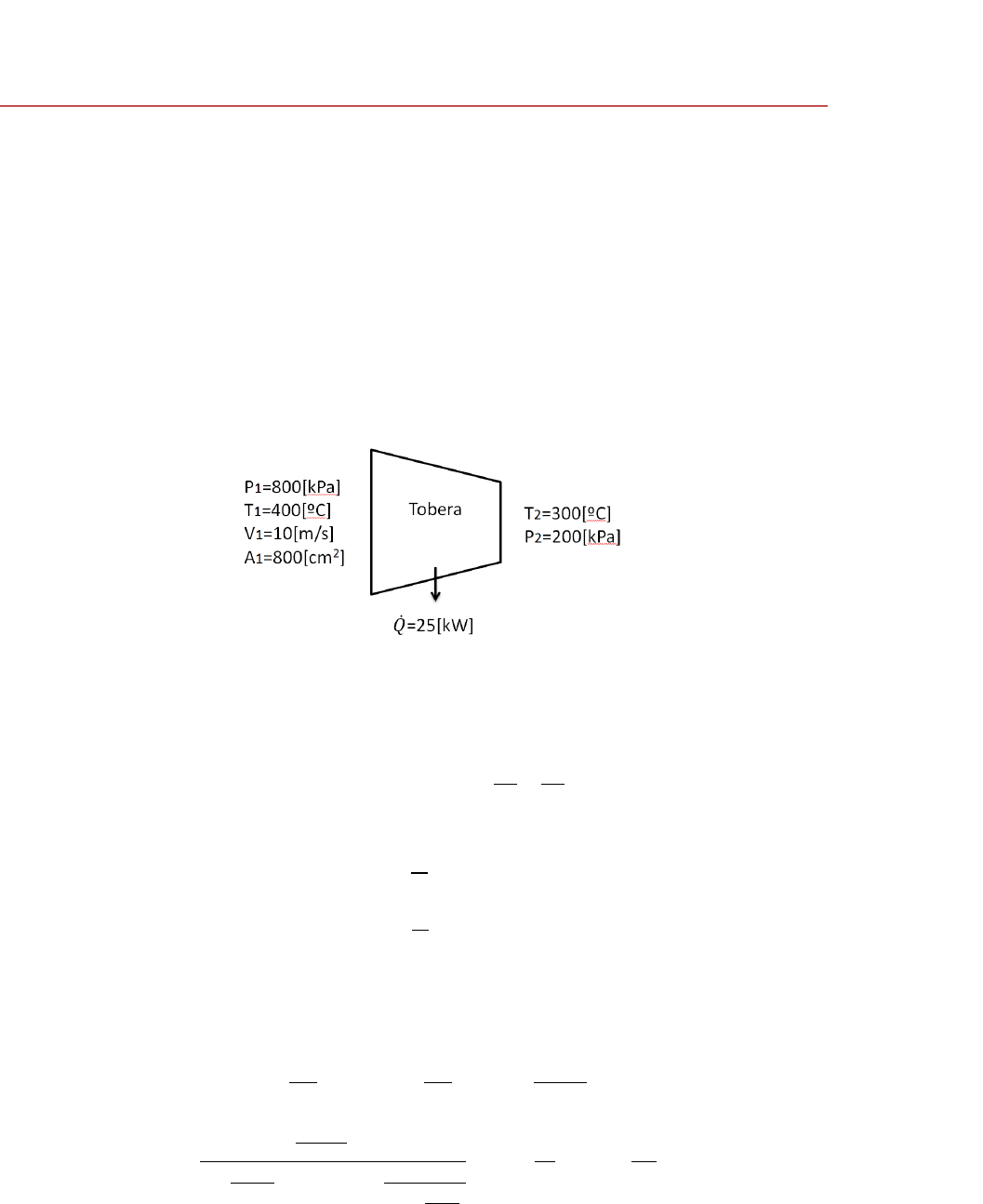 Departamento de Ingeniería Civil Química y Biotecnología Profesor: Joaquín Cortés Termodinámica Aplicada – IQ3201 Profesor Auxiliar: Javiera Gatica 1 EJERCICIO N°2 PARTE EJERCICIOS PREGUNTA 1 A una tobera entra vapor de agua a 800[kPa], 400[ºC] y 10[m/s], y sale a 300[ºC] y 200[kPa] mientras pierde calor a una tasa de 25[kW]. El área de entrada es de 800[cm 2 ]. Determine: a) La velocidad de salida b) Flujo volumétrico de vapor a la salida de la tobera SOLUCIÓN: Balance de energía: ̇ ̇( ) ̇ ( ) (*) Utilizando tablas de vapor sobrecalentado: [ ] [ ] a 400[ºC] * + [ ] [ ] a 300[ºC] * + Obtener ̇ -Usando gases ideales: * + [ ] [ ] [ ] * + [ ] * + Departamento de Ingeniería Civil Química y Biotecnología Profesor: Joaquín Cortés Termodinámica Aplicada – IQ3201 Profesor Auxiliar: Javiera Gatica 2 ̇ * + [ ] [ ] [ ] -Usando tablas, considerando las propiedades en la entrada de la tobera: ̇ ⃗ ⃗ ̂ [ ] [ ] a 400[ºC] ̂ * + ̇ [ ] [ ] [ ] * + [ ] [ ] De la ecuación (*) [ ] [ ] ( ) [ ] [ ] ( ) * + [ ] [ ] a) * + b) * + ̇ * + * + -Usando gases ideales: ( ) [ ] * + [ ] * + * + -Usando tablas, considerando las propiedades en la salida de la tobera y conservación del flujo másico: ̇ ̇ ̇ ̇ ̇ ̇ ̂ [ ] [ ] a 300[ºC] ̂ * + ̇ [ ] * + * + Departamento de Ingeniería Civil Química y Biotecnología Profesor: Joaquín Cortés Termodinámica Aplicada – IQ3201 Profesor Auxiliar: Javiera Gatica 3 PROBLEMA 2 Uso de las tablas de vapor para determinar propiedades Para el agua, determine las propiedades faltantes y las descripciones de fase en la siguiente tabla: T [ºC] P [kPa] u [kJ/kg] x Descripción de fase a) 120.21 200 1719.26 0.6 Mezcla Saturada líquido-vapor b) 125 232.23 1600 0.53 Mezcla Saturada líquido-vapor c) 395.19 1000 2950 - Vapor Sobrecalentado d) 75 500 313.99 - Líquido Comprimido e) 172.94 850 731.00 0.0 Líquido Saturado Solución: a) Dado que x=0.6, significa que un 60% de la masa se encuentra en fase de vapor y el 40% restante en fase líquida, por lo tanto corresponde a una mezcla saturada de líquido-vapor a una presión de 200 kPa. Usando la tabla A-5: Además se obtiene que y , entonces la energía interna de la mezcla corresponde a: ( ) b) Como se conoce la temperatura y la energía interna, a priori no se conoce que tabla ocupar para conocer las propiedades faltantes, ya que no se puede saber si se encuentra en fase vapor, líquido o una mezcla de ambas. Para determinar su ubicación se comprueba los valores de la energía interna en la tabla de agua saturada (A-4) a 125°C. Con esto se obtiene y , y recordando: Se tiene líquido comprimido Se tiene vapor húmedo se tiene vapor sobrecalentado Dado que en este caso es 1600, se tiene vapor húmedo a 125°C, donde la presión debe ser la presión de saturación a 125°C: Departamento de Ingeniería Civil Química y Biotecnología Profesor: Joaquín Cortés Termodinámica Aplicada – IQ3201 Profesor Auxiliar: Javiera Gatica 4 Y el título de la mezcla se obtiene a partir de: c) Este caso, similar a b), pero se da la presión en vez de la temperatura. Se lee los valores de en la tabla de agua saturada a 1MPa (A-6). y , como que buscamos es mayor que , nos encontramos con vapor sobrecalentado. Con esto se determina la temperatura mediante interpolación lineal. d) En este caso se entrega la temperatura y la presión, pero no sabemos en qué región nos encontramos (líquido comprimido, vapor húmedo, vapor sobrecalentado), para tener una referencia nos basamos en las tablas de agua saturado a 500 kPa (Tabla A-5), donde se obtiene , recordando: Se tiene líquido comprimido Se tiene vapor húmedo se tiene vapor sobrecalentado Dado que , la muestra se encuentra como líquido comprimido, con esto se calcula la energía interna, como el líquido saturado a la misma temperatura (Tabla A-4). e) Como se indica que x=0, indica que es líquido saturado a 850 kPa, entonces la temperatura corresponde a las temperatura de saturación y la energía interna de líquido saturado.