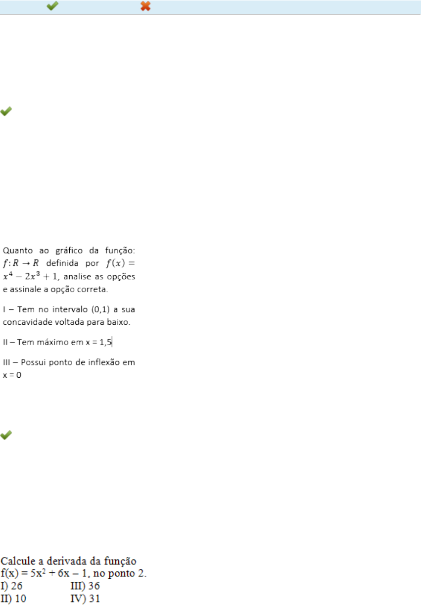 Disciplina: Cálculo Diferencial e Integral (MAT22) Avaliação: Avaliação II - Individual FLEX ( Cod.:513801) ( peso.:1,50) Prova: 15686190 Nota da Prova: 9,00 Legenda: Resposta Certa Sua Resposta Errada Parte superior do formulário 1. A derivada de uma função, em seu conceito mais teórico, é dada pela razão entre a variação da função ao longo da variável dependente, quando a variável independente sofre uma pequena variação. Assim sendo, seja a função f(t) = ln(2t+1), assinale a alternativa CORRETA que apresenta a sua derivada f´(t): a) 2t/(2t+1) b) 2t²+1 c) 2/(2t+1) d) t²+2 2. A derivada é bastante útil no momento de estudar taxas de variação onde estão envolvidas grandezas físicas, isto é claro, garantindo que a modelagem desta grandeza seja descrita por uma função matemática. Entende-se a derivada como o coeficiente angular da reta tangente à curva dada, porém, mais intuitivamente ela pode ser utilizada para descrever se uma curva deve "subir" ou "descer" ao longo de um certo intervalo. a) Todas estão corretas. b) I e II estão corretas. c) II e III estão corretas. d) I e III estão corretas. 3. Na matemática, a derivada de uma função é o conceito central do cálculo diferencial. A derivada pode ser usada para determinar a taxa de variação de alguma coisa devido a mudanças sofridas em uma outra ou se uma função entre os dois objetos existe e toma valores contínuos em um dado intervalo. Por exemplo: a taxa de variação da posição de um objeto com relação ao tempo, isto é, sua velocidade, é uma derivada. Com relação à questão a seguir, assinale a alternativa CORRETA: a) Somente a opção IV está correta. b) Somente a opção III está correta. c) Somente a opção II está correta. d) Somente a opção I está correta. Anexos: Formulário - Cálculo Diferencial e Integral (MAD) - Paulo 4. Observe o gráfico da função f(x), definida em R. Analise as sentenças a seguir e assinale a alternativa CORRETA: a) Somente a sentença I está correta b) Somente a sentença III está correta c) Somente a sentença IV está correta. d) Somente a sentença II está correta 5. Assinale a alternativa CORRETA: a) Somente a opção II está correta. b) Somente a opção IV está correta. c) Somente a opção I está correta. d) Somente a opção III está correta. Anexos: Formulário - Cálculo Diferencial e Integral (MAD) - Paulo Formulário - Cálculo Diferencial e Integral (MAD) - Paulo 6. Um ponto (x, y) do plano cartesiano move-se segundo as equações x = (2t² - t) e y = (t³ + 2t). O valor de dy/dx quando t = 2 é: a) 3. b) 2. c) 1. d) 5. 7. Um corpo é lançado verticalmente para cima (a partir do solo), com uma velocidade de 40 m/s, num lugar onde o módulo da aceleração da gravidade é 10 m/s², conforme a figura anexa. Lembrando que, deste modo, podemos descrever a equação horária de seu movimento, modelando a situação como uma função quadrática, tal que f(t) = 40t - 5t². Considerando-se que a única força atuante sobre o corpo é seu peso, conclui-se que o tempo de subida do corpo é: a) 2 segundos. b) 4 segundos. c) 1 segundo. d) 8 segundos. 8. Para a determinação matemática da taxa de contaminação de um certo ambiente, identificando seus máximos e mínimos, ou seja, a determinação da taxa de variação instantânea de uma função f em um ponto Xo, utiliza-se o conceito de: a) Limite. b) Derivada. c) Seriação. d) Integral. 9. Ao estudar o Cálculo Diferencial, descobrimos que existem algumas funções que são infinitamente deriváveis em todos os pontos de seu domínio. Um exemplo disto é a função exponencial, que possui diferenciação de ordem superior infinita. Observe as derivadas da função exponencial e analise as sentenças a seguir; depois assinale a alternativa CORRETA: a) As sentenças I e IV estão corretas. b) As sentenças II está correta. c) As sentenças I e III estão corretas. d) As sentenças I e II estão corretas. 10. Em matemática, em especial na análise do cálculo diferencial, os pontos de máximo e mínimo, também chamados de pontos extremos de uma função, são pontos do domínio onde a função atinge seu valor máximo e mínimo. Sendo assim, assinale a alternativa CORRETA que apresenta um máximo relativo da função definida no intervalo [a,b] indicada a seguir: a) x = c. b) x = b. c) x = e. d) x = a. Prova finalizada com 9 acertos e 1 questões erradas. Parte inferior do formulário