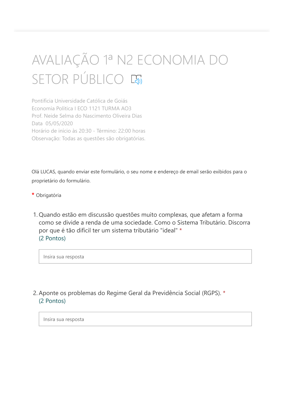 05/05/2020 AVALIAÇÃO 1ª N2 ECONOMIA DO SETOR PÚBLICO https://forms.office.com/Pages/ResponsePage.aspx?id=Qp8xcwiJiUufjVWM9NXXduS_4aPTdSBOgeh3IH4WGkhUREMxM1FUSjc4QlFWN1JPR… 1/3 AVALIAÇÃO 1ª N2 ECONOMIA DO SETOR PÚBLICO Pontifícia Universidade Católica de Goiás Economia Política I ECO 1121 TURMA AO3 Prof. Neide Selma do Nascimento Oliveira Dias Data 05/05/2020 Horário de início às 20:30 - Término: 22:00 horas Observação: Todas as questões são obrigatórias. Olá LUCAS, quando enviar este formulário, o seu nome e endereço de email serão exibidos para o proprietário do formulário. * Obrigatória Quando estão em discussão questões muito complexas, que afetam a forma como se divide a renda de uma sociedade. Como o Sistema Tributário. Discorra por que é tão difícil ter um sistema tributário "ideal" * (2 Pontos) 1. Insira sua resposta Aponte os problemas do Regime Geral da Previdência Social (RGPS). * (2 Pontos) 2. Insira sua resposta 05/05/2020 AVALIAÇÃO 1ª N2 ECONOMIA DO SETOR PÚBLICO https://forms.office.com/Pages/ResponsePage.aspx?id=Qp8xcwiJiUufjVWM9NXXduS_4aPTdSBOgeh3IH4WGkhUREMxM1FUSjc4QlFWN1JPR… 2/3 Analise os sistemas: de repartição simples (pay-as-you-go) e o de capitalização. Na sua opinião qual seria o melhor para o Brasil. * (2 Pontos) 3. Insira sua resposta Segundo o Capítulo 12 , O Sistema Federativo e o Fenômeno da Descentralização Discorra sobre Apoio financeiro a estados. O governo apresentou um plano de R$ 88,2 bilhões para estados e municípios conseguirem arcar com demandas de saúde e impactos econômicos do coronavírus. As medidas do pacote incluem: • Transferência de R$ 8 bilhões para gastos em saúde • Transferência de R$ 2 bilhões para gastos em assistencial social • Recomposição no valor de R$ 16 bilhões para o Fundo de Participação dos Estados (FPE) e Fundo de Participação dos Municípios (FPM) • Suspensão das dívidas dos estados com a União (R$ 12,6 bilhões) • Renegociação de dívidas de estados e municípios com bancos (R$ 9,6 bilhões) • Operações com facilitação de créditos, no valor de R$ 40 bilhões https://g1.globo.com/economia/noticia/2020/03/24/coronavirus-veja-as- medidas-economicas-ja-anunciadas-pelo-governo-federal-e-pelo-bc.ghtml * (2 Pontos) 4. Insira sua resposta https://g1.globo.com/economia/noticia/2020/03/24/coronavirus-veja-as-medidas-economicas-ja-anunciadas-pelo-governo-federal-e-pelo-bc.ghtml 05/05/2020 AVALIAÇÃO 1ª N2 ECONOMIA DO SETOR PÚBLICO https://forms.office.com/Pages/ResponsePage.aspx?id=Qp8xcwiJiUufjVWM9NXXduS_4aPTdSBOgeh3IH4WGkhUREMxM1FUSjc4QlFWN1JPR… 3/3 Esse conteúdo foi criado pelo proprietário do formulário. Os dados que você enviar serão enviados ao proprietário do formulário. Nunca forneça sua senha. Da plataforma Microsoft Forms | Política de privacidade | Condições de uso Afrouxamento da meta fiscal O governo federal pediu e o Congresso aprovou o reconhecimento do estado de calamidade pública, o que vai permitir que o governo eleve o gasto público e descumpra a meta fiscal prevista para o ano. O orçamento de 2020, sancionado pelo presidente Jair Bolsonaro, autorizava até então déficit fiscal de até R$ 124,1 bilhões nas contas públicas. Com as medidas de ajuda anunciadas, o governo federal aumentou a previsão de déficit nas contas públicas para um valor próximo de R$ 600 bilhões em 2020. https://g1.globo.com/economia/noticia/2020/03/24/coronavirus-veja-as- medidas-economicas-ja-anunciadas-pelo-governo-federal-e-pelo-bc.ghtml Analise o afrouxamento da meta fiscal para 2020 e quais as consequências para o futuro das contas do governo e as atividades econômicas. * (2 Pontos) 5. Insira sua resposta Enviar-me um email de confirmação de minhas respostas Enviar http://go.microsoft.com/fwlink/p/?LinkId=2083423 https://go.microsoft.com/fwlink/?LinkId=521839 https://g1.globo.com/economia/noticia/2020/03/24/coronavirus-veja-as-medidas-economicas-ja-anunciadas-pelo-governo-federal-e-pelo-bc.ghtml